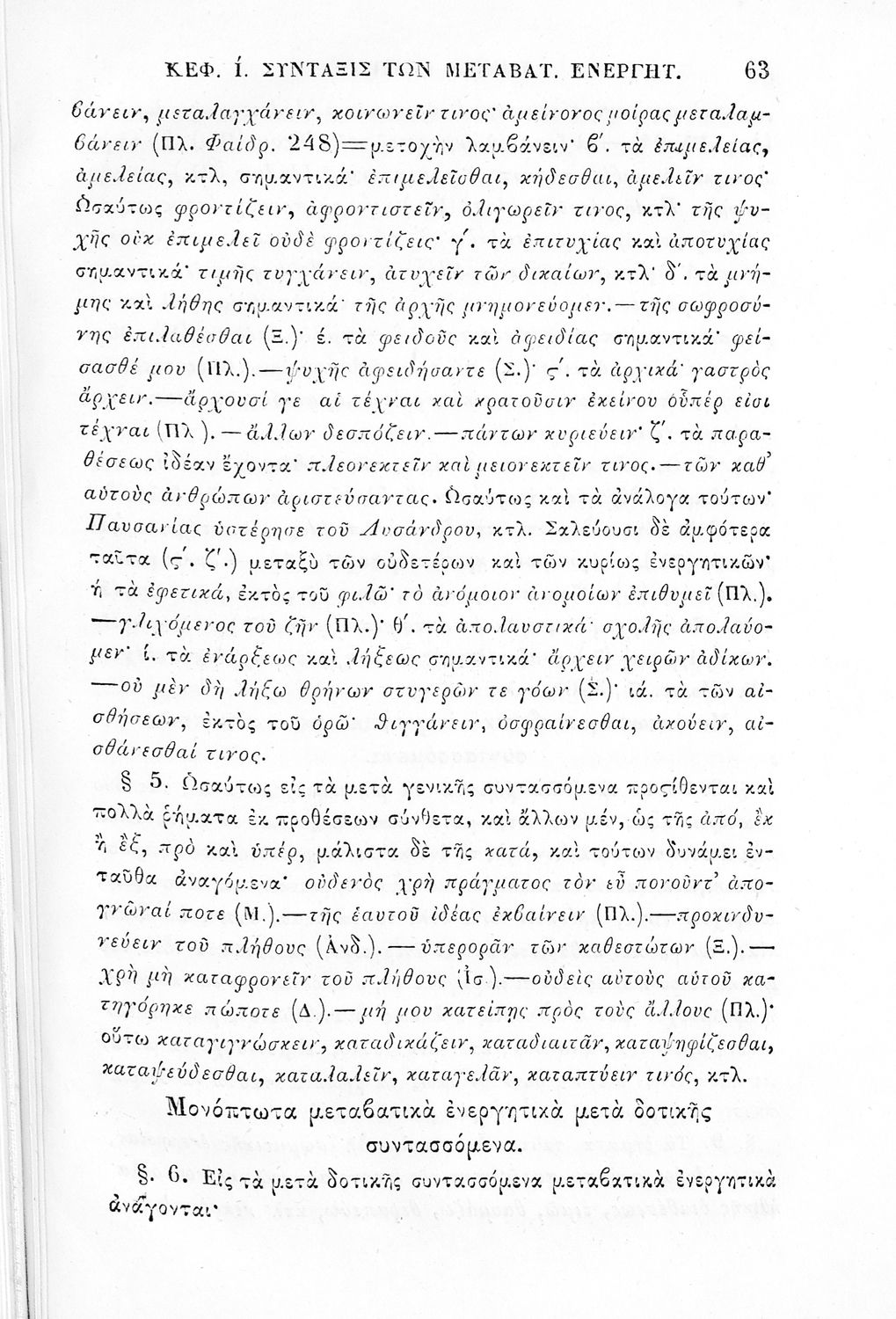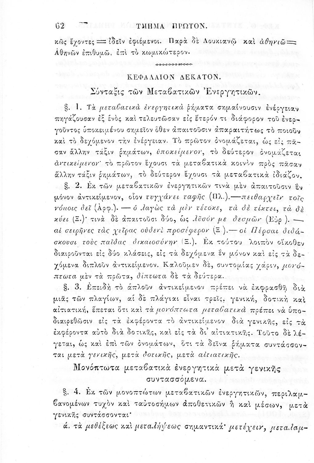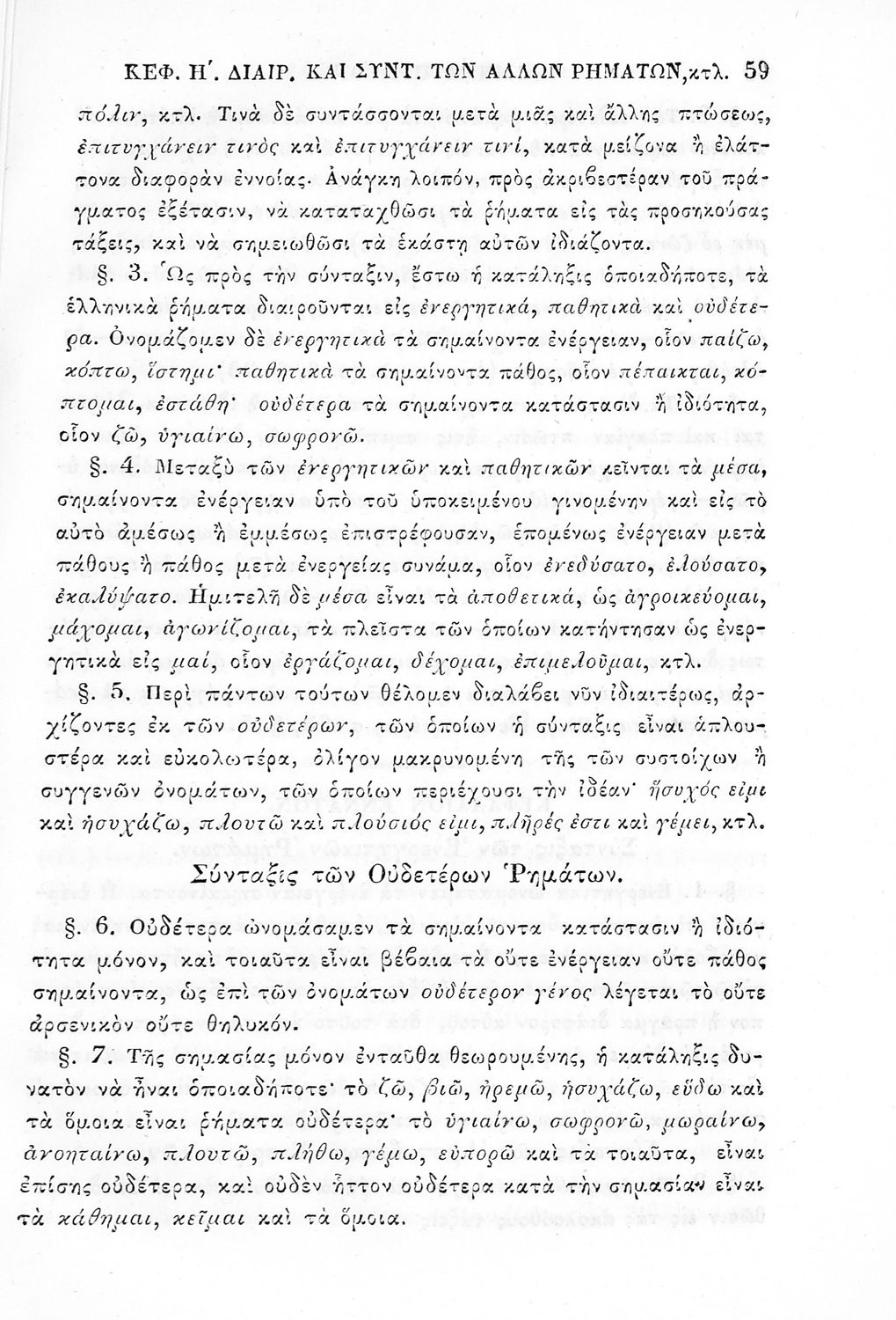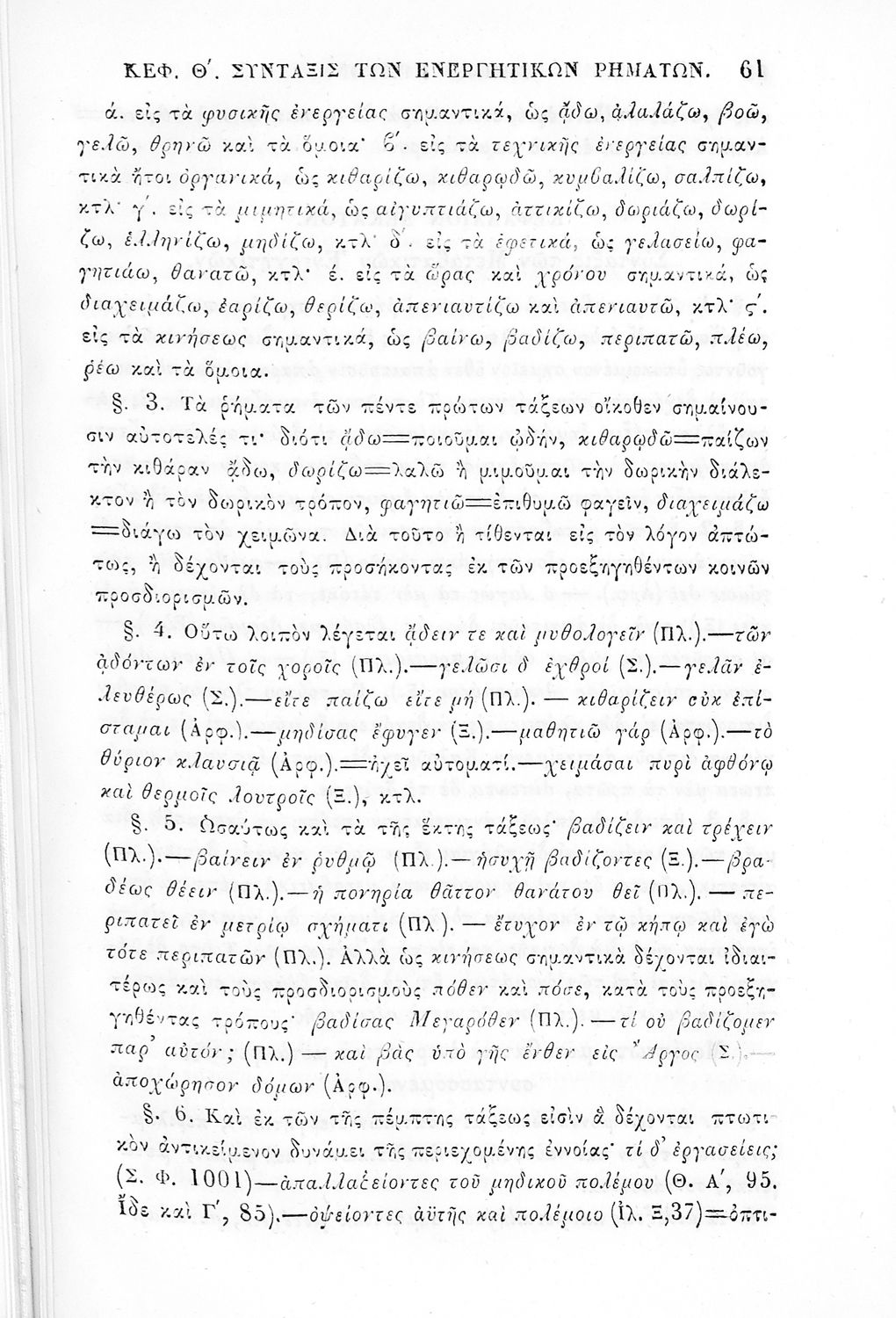 Σχολικό εγχειρίδιο για τις τάξεις του Ελληνικού και του Γυμνασίου για το μάθημα των Αρχαίων Ελληνικών και συγκεκριμένα του συντακτικού της ελληνικής γλώσσας. Το εγχειρίδιο περιλαμβάνει τους βασικούς κανόνες συντακτικού και διακρίνονται η κύρια και η υποτακτική σύνταξη, τα μέρη του λόγου και οι σύνδεσμοι, τα συντακτικά σχήματα και ιδιώματα.