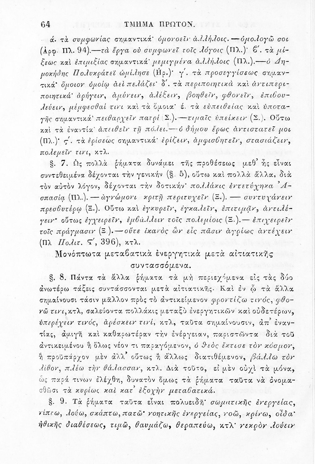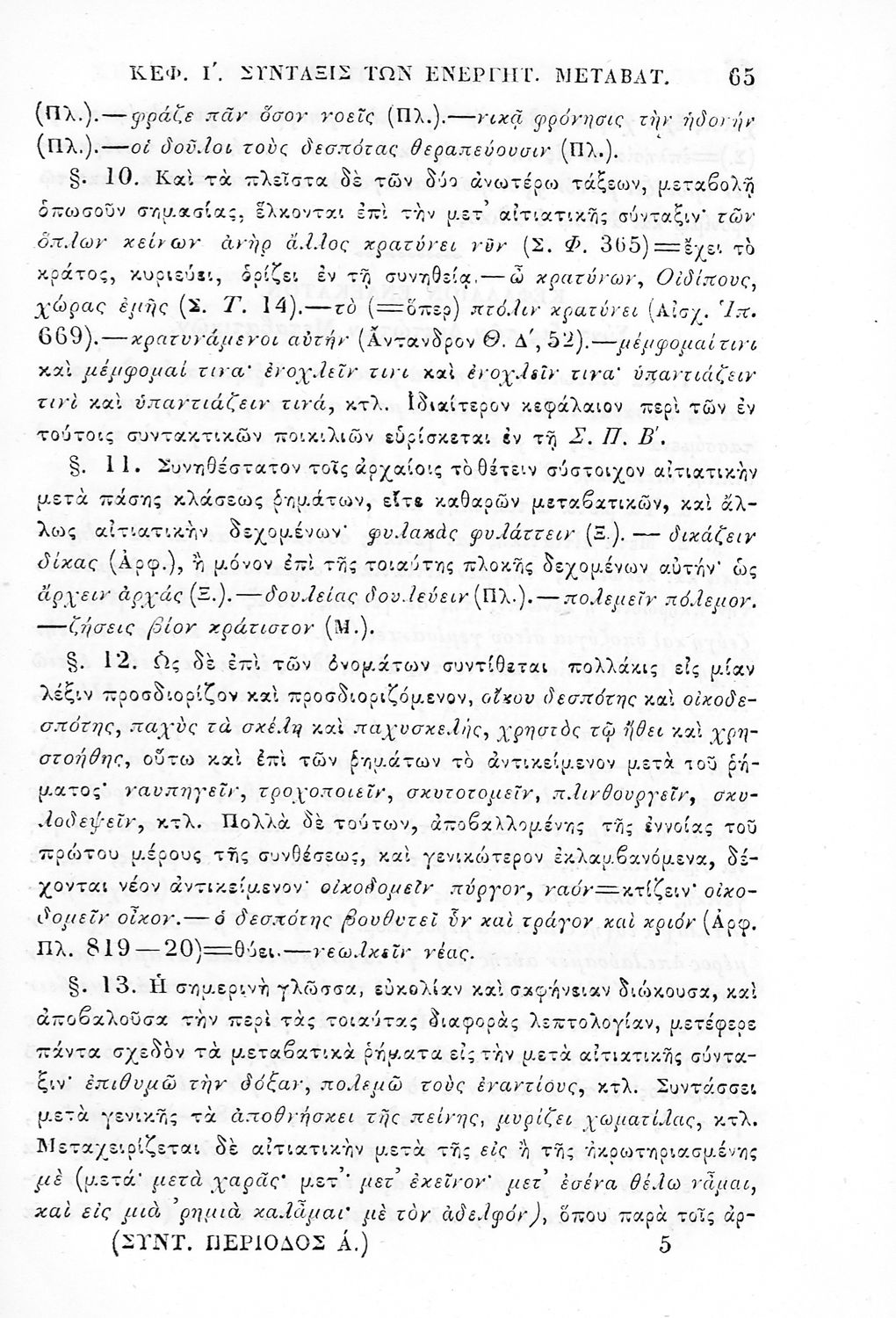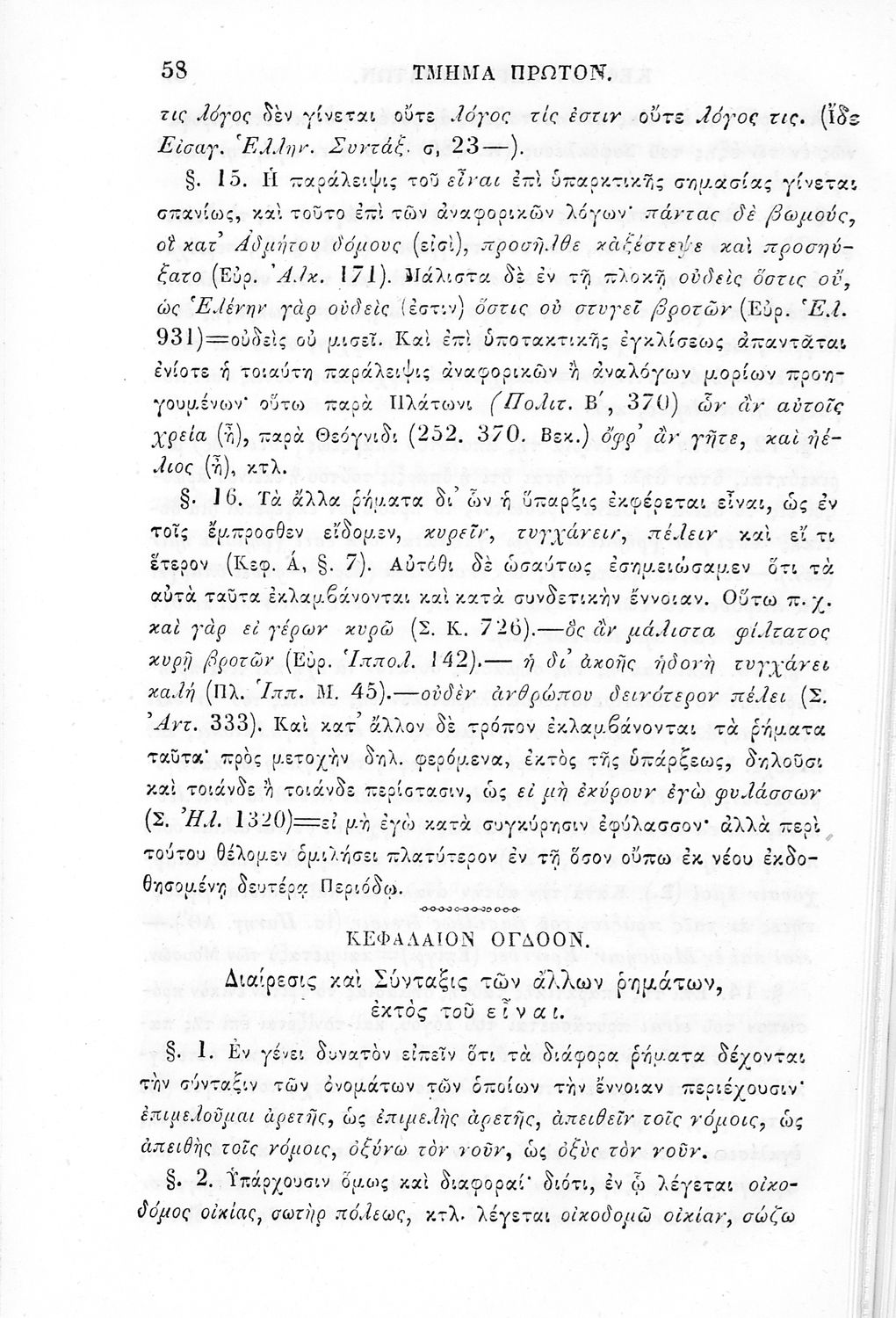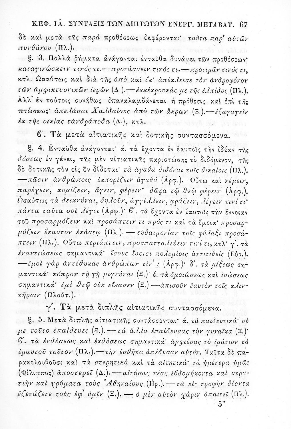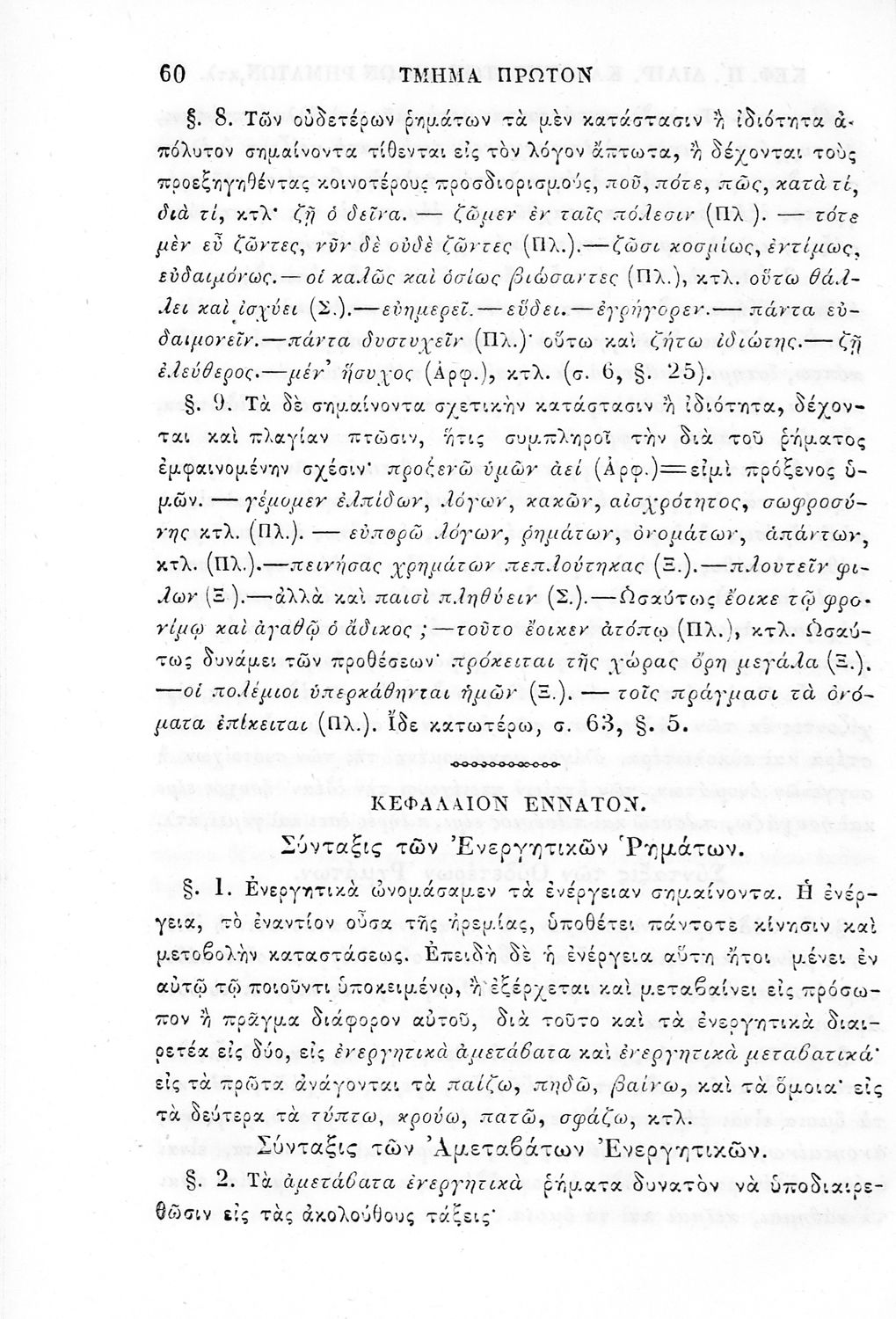Σχολικό εγχειρίδιο για τις τάξεις του Ελληνικού και του Γυμνασίου για το μάθημα των Αρχαίων Ελληνικών και συγκεκριμένα του συντακτικού της ελληνικής γλώσσας. Το εγχειρίδιο περιλαμβάνει τους βασικούς κανόνες συντακτικού και διακρίνονται η κύρια και η υποτακτική σύνταξη, τα μέρη του λόγου και οι σύνδεσμοι, τα συντακτικά σχήματα και ιδιώματα.