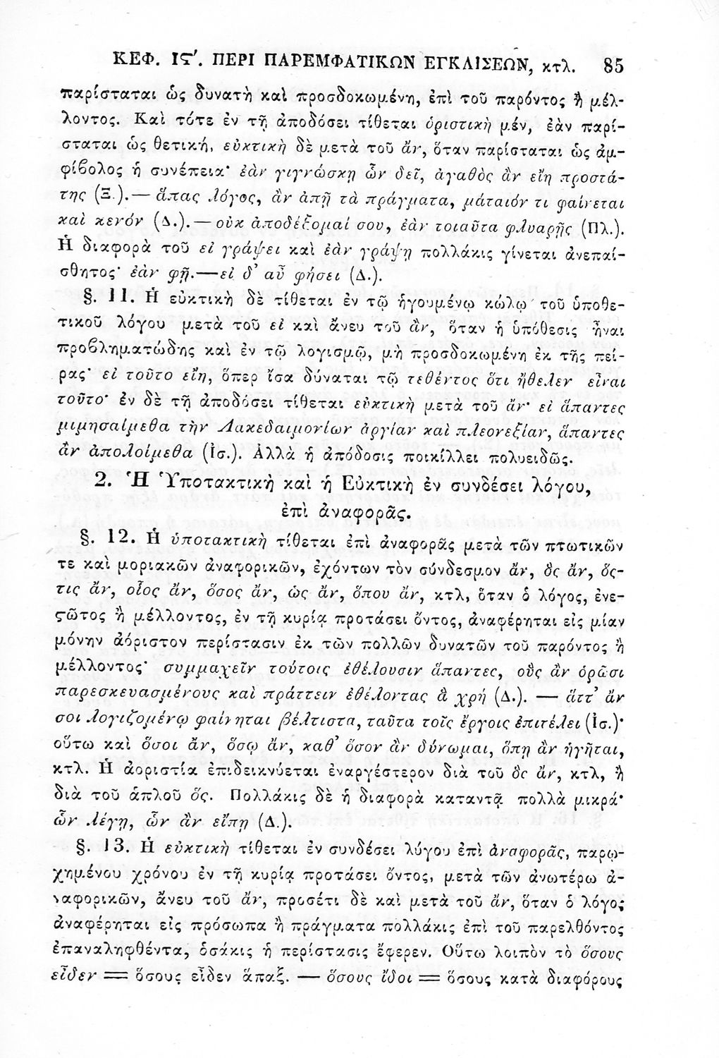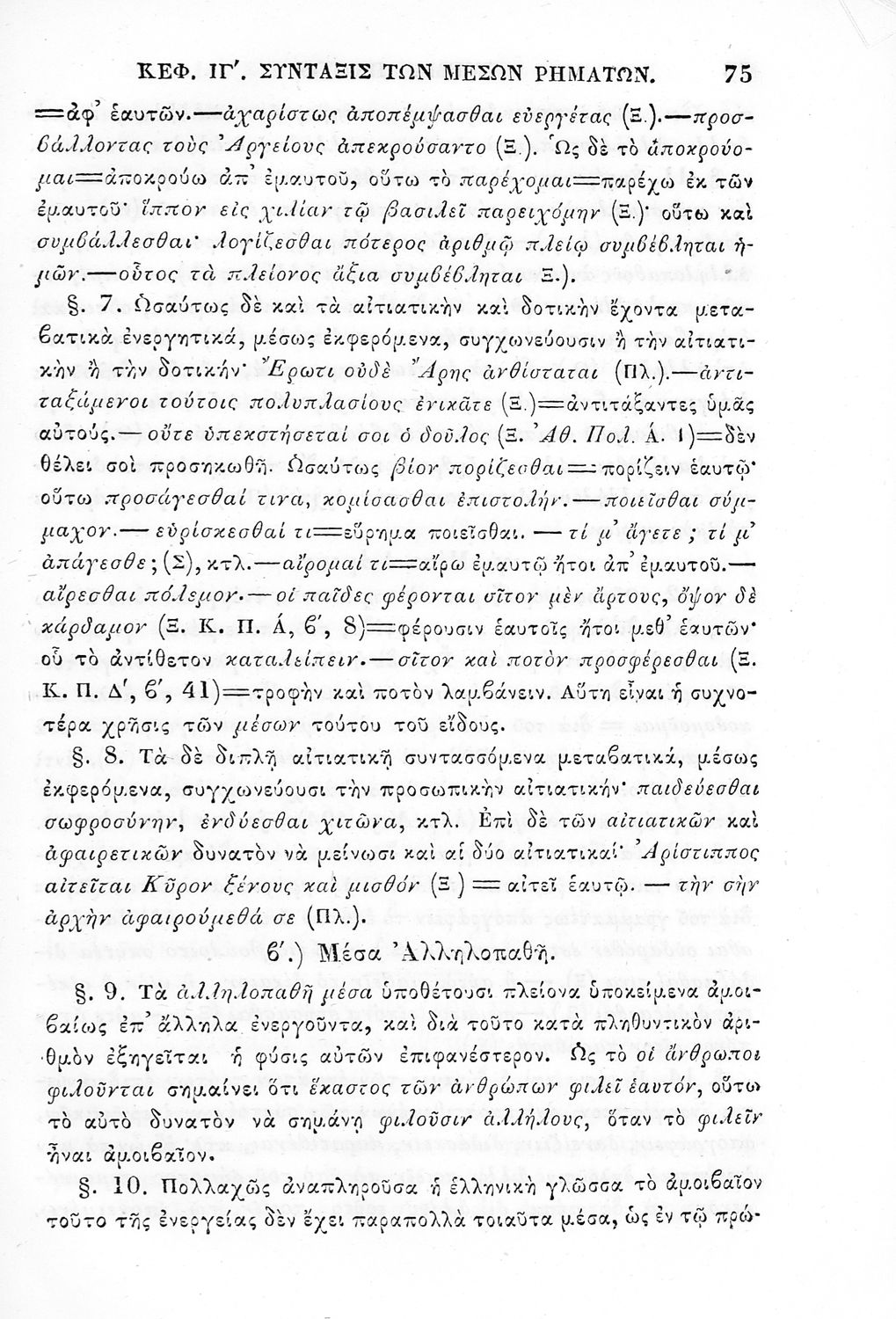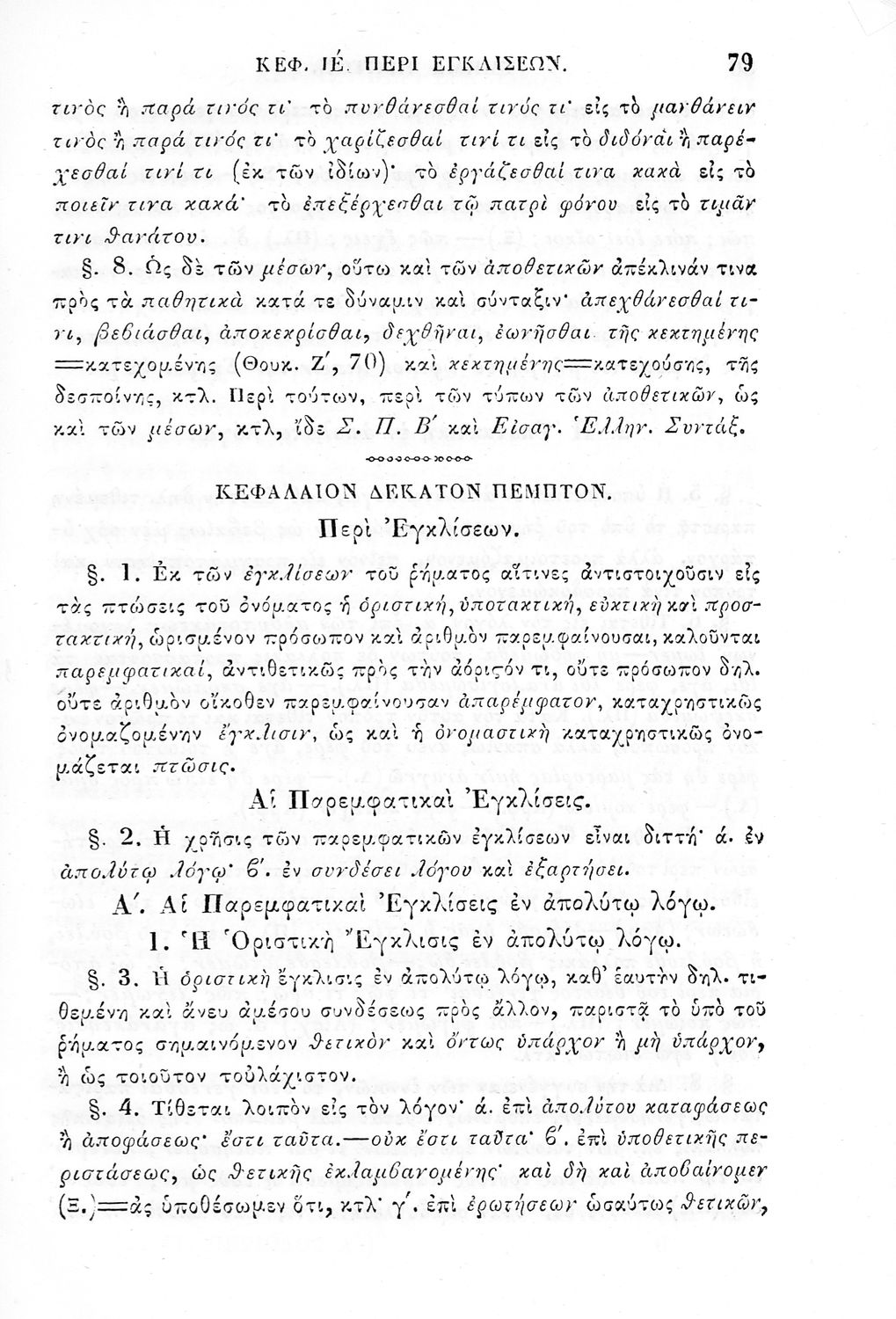 Σχολικό εγχειρίδιο για τις τάξεις του Ελληνικού και του Γυμνασίου για το μάθημα των Αρχαίων Ελληνικών και συγκεκριμένα του συντακτικού της ελληνικής γλώσσας. Το εγχειρίδιο περιλαμβάνει τους βασικούς κανόνες συντακτικού και διακρίνονται η κύρια και η υποτακτική σύνταξη, τα μέρη του λόγου και οι σύνδεσμοι, τα συντακτικά σχήματα και ιδιώματα.