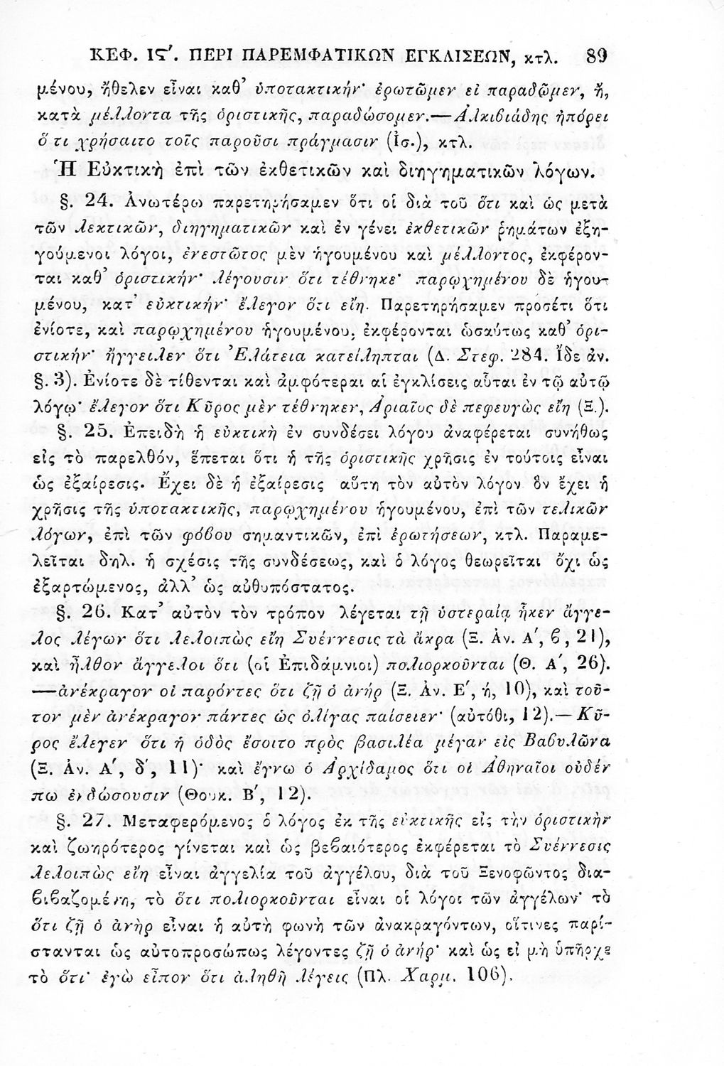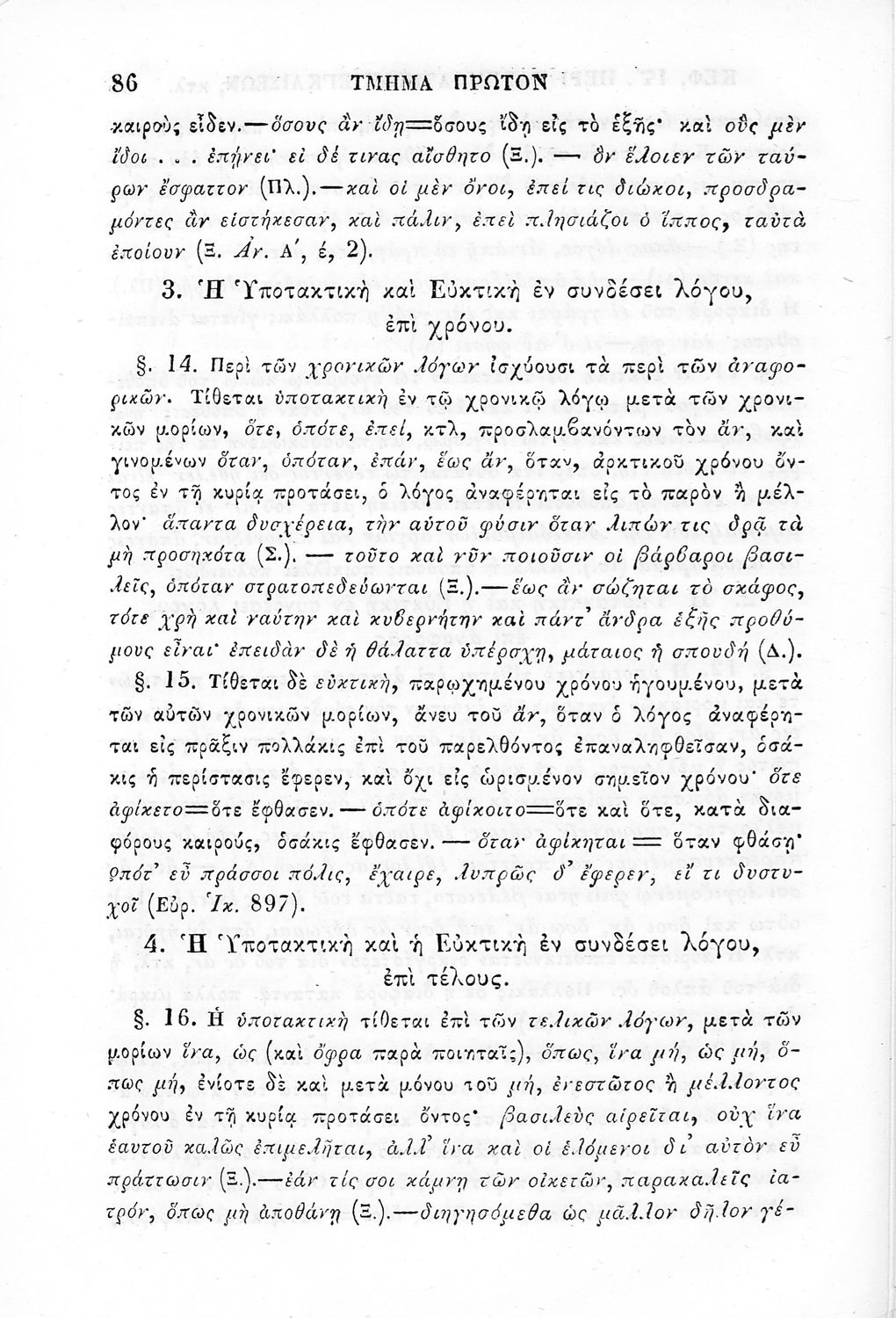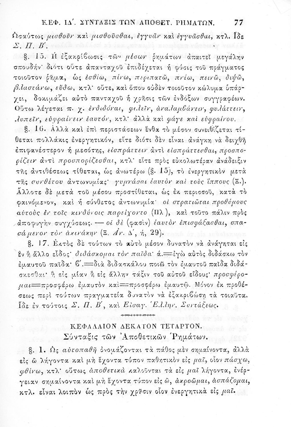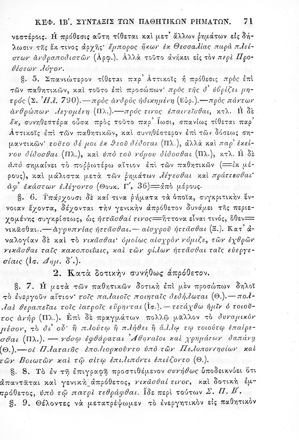 Σχολικό εγχειρίδιο για τις τάξεις του Ελληνικού και του Γυμνασίου για το μάθημα των Αρχαίων Ελληνικών και συγκεκριμένα του συντακτικού της ελληνικής γλώσσας. Το εγχειρίδιο περιλαμβάνει τους βασικούς κανόνες συντακτικού και διακρίνονται η κύρια και η υποτακτική σύνταξη, τα μέρη του λόγου και οι σύνδεσμοι, τα συντακτικά σχήματα και ιδιώματα.