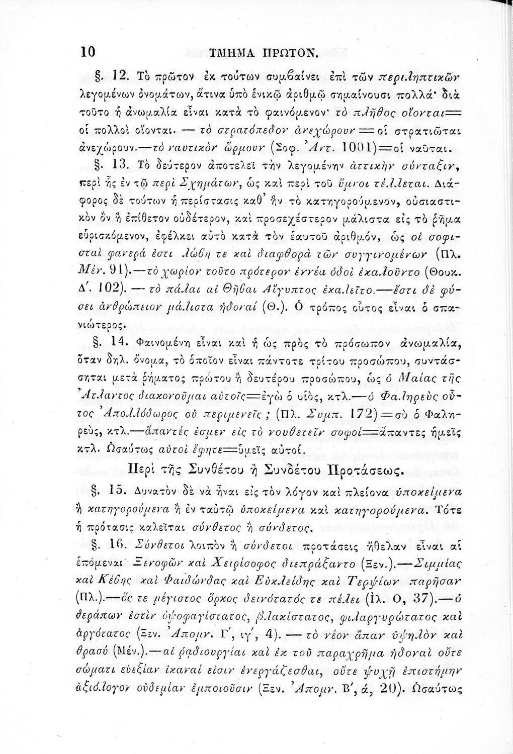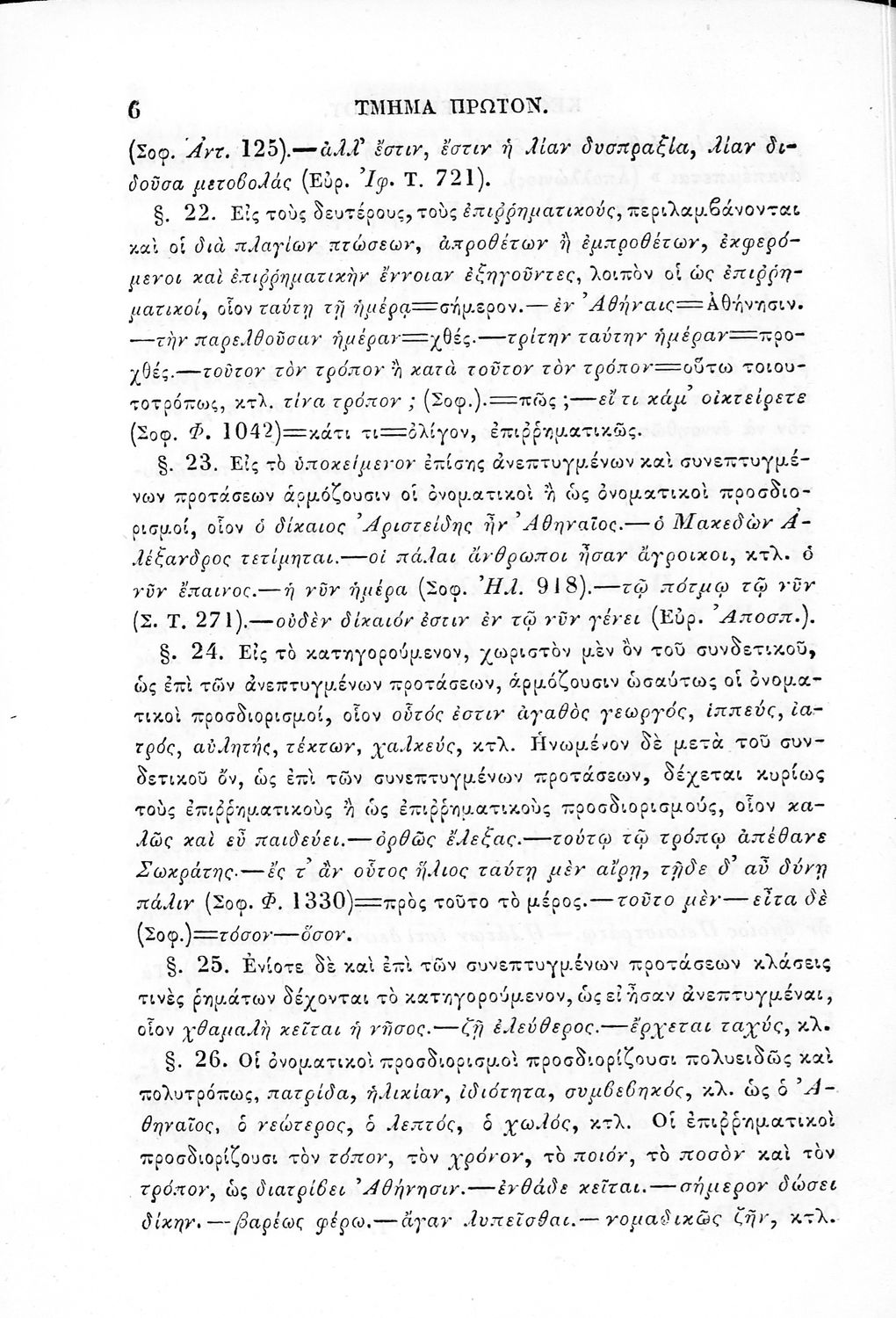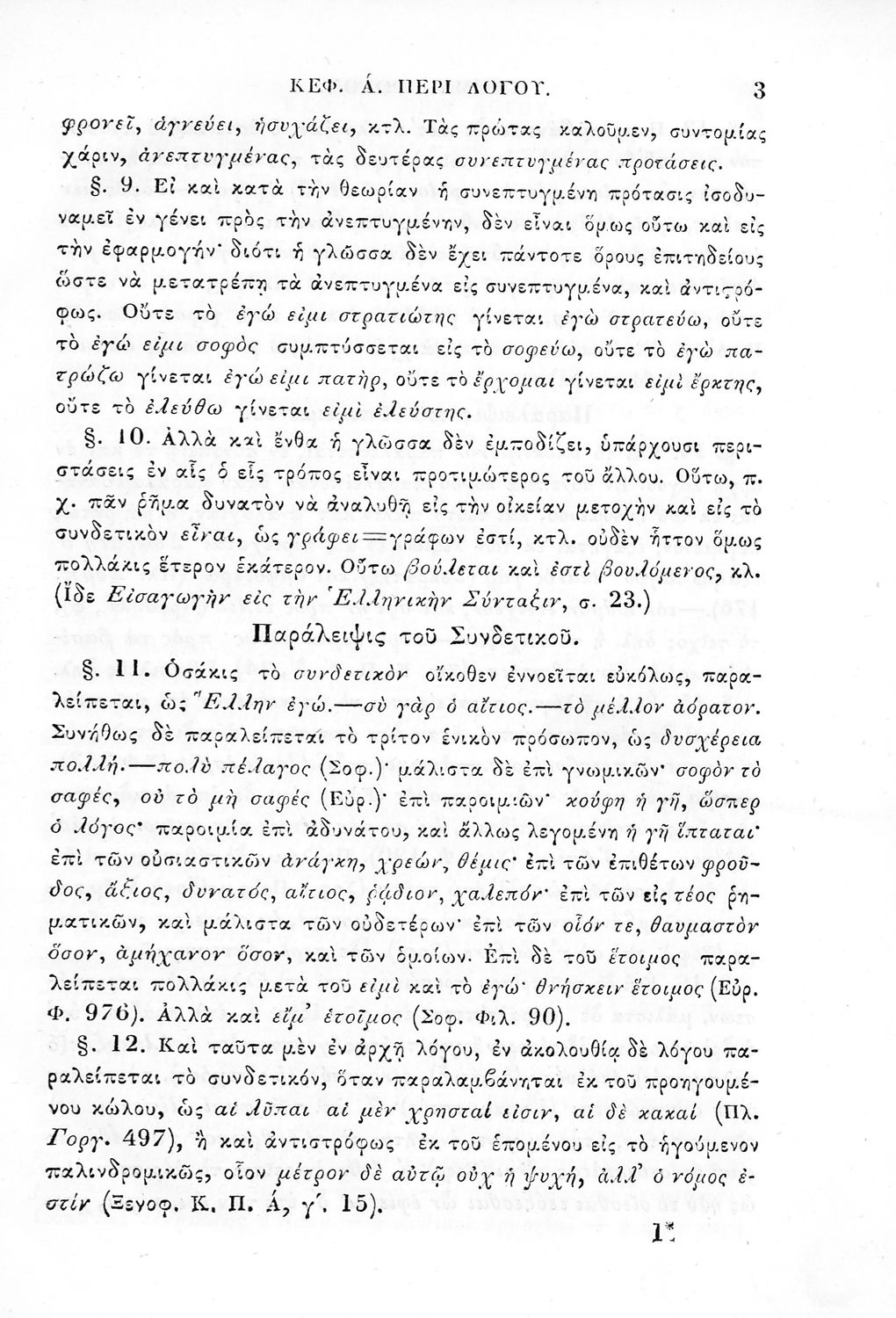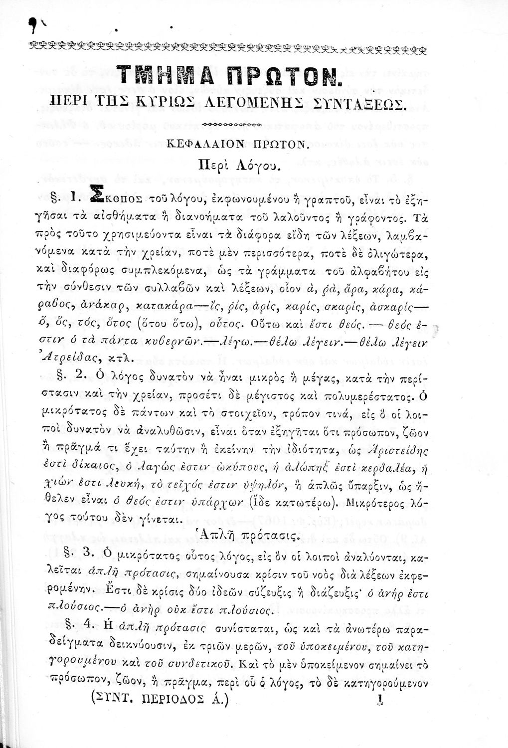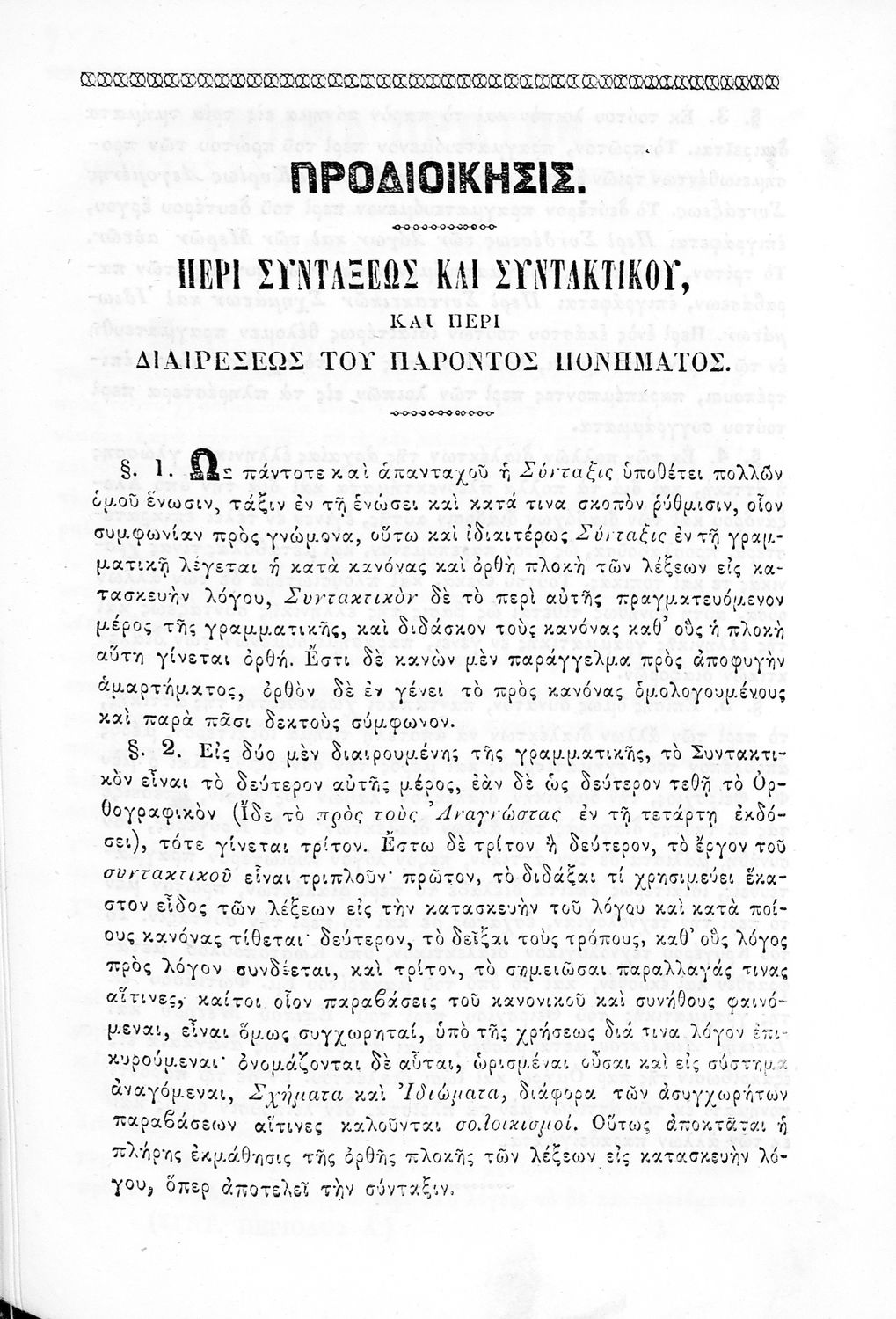 Σχολικό εγχειρίδιο για τις τάξεις του Ελληνικού και του Γυμνασίου για το μάθημα των Αρχαίων Ελληνικών και συγκεκριμένα του συντακτικού της ελληνικής γλώσσας. Το εγχειρίδιο περιλαμβάνει τους βασικούς κανόνες συντακτικού και διακρίνονται η κύρια και η υποτακτική σύνταξη, τα μέρη του λόγου και οι σύνδεσμοι, τα συντακτικά σχήματα και ιδιώματα.