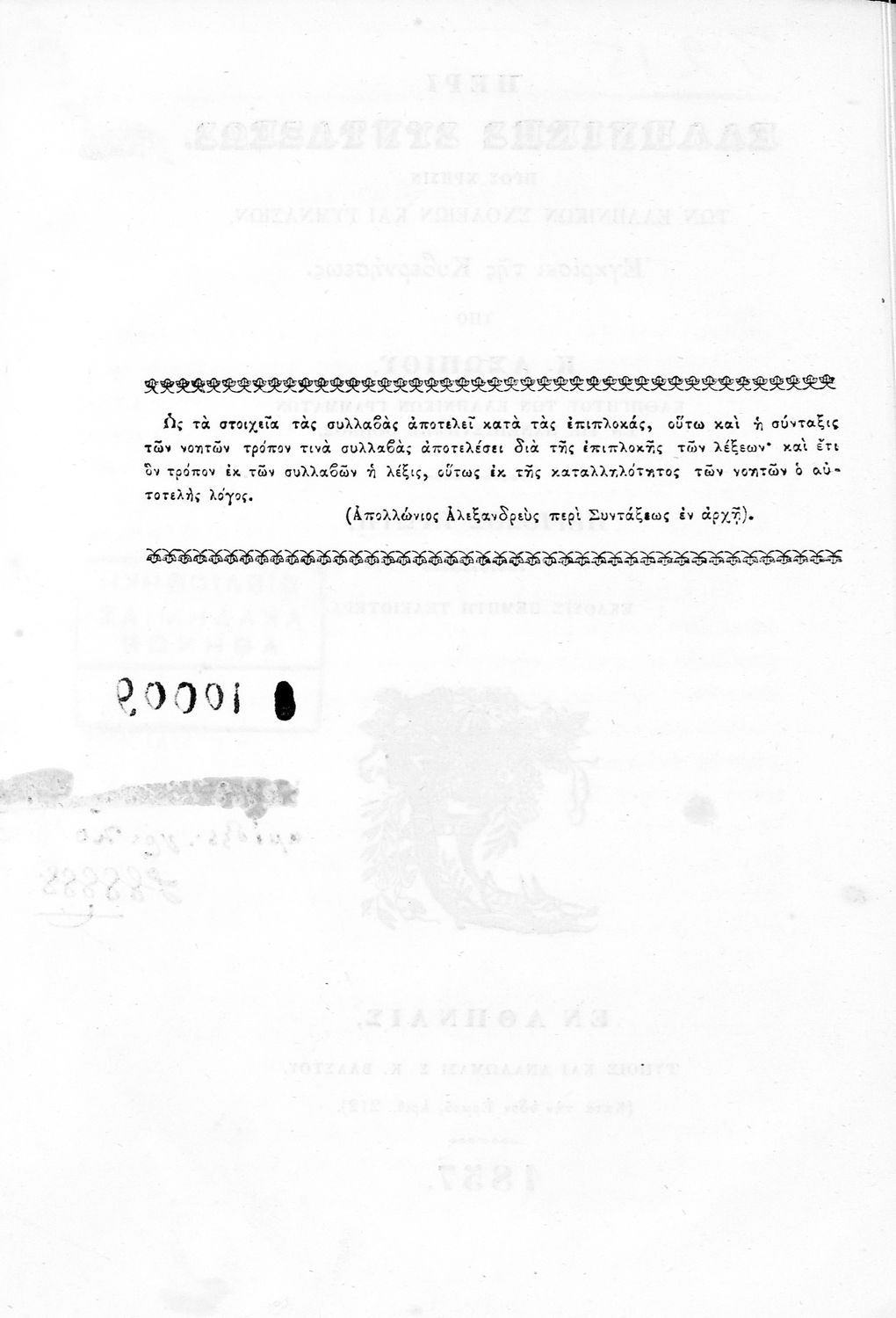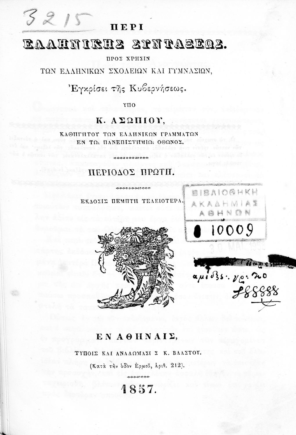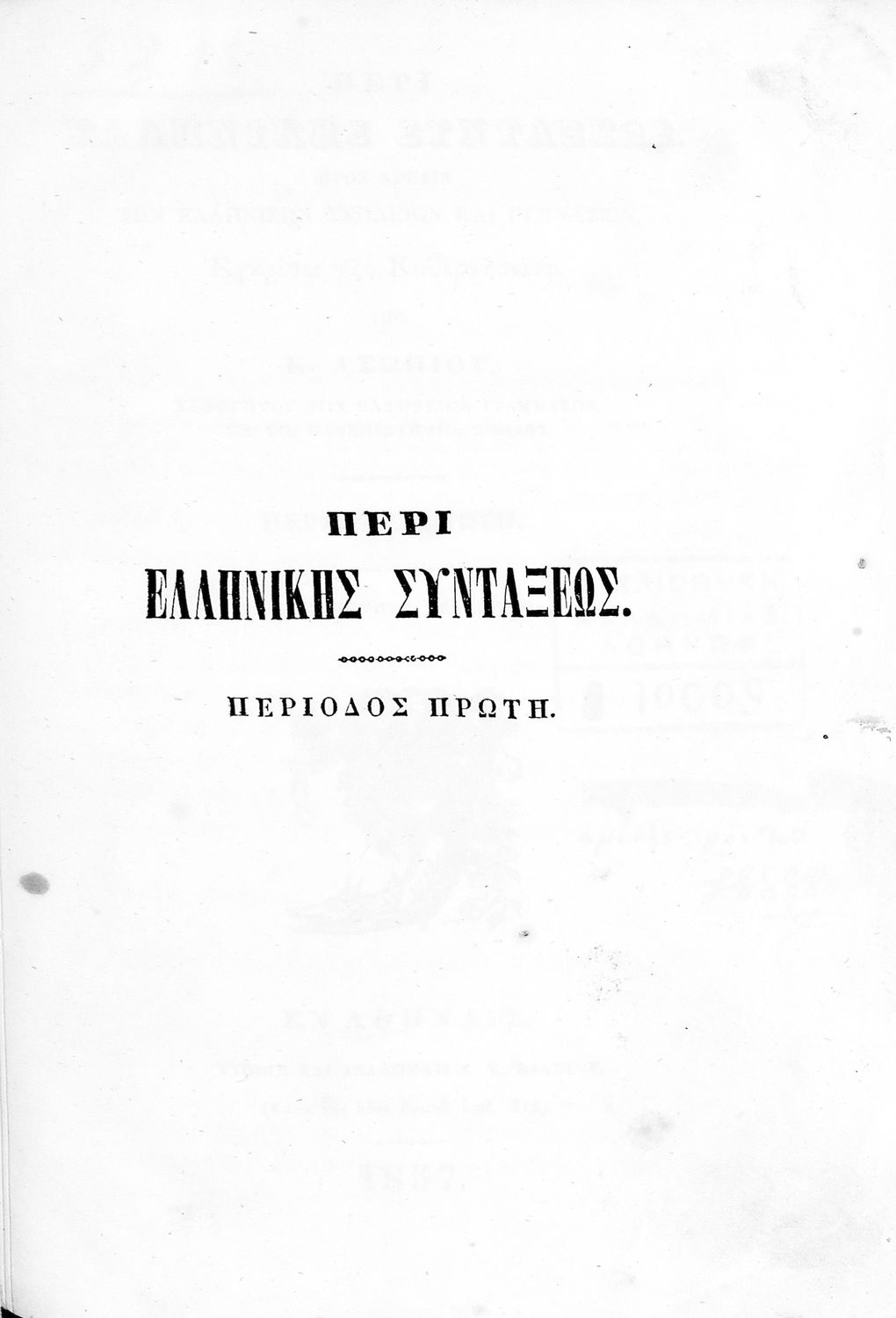 Εκδότης: Σ. Κ. Βλαστός Έτος έκδοσης: 1857 Τόπος έκδοσης: Αθήνα Έκδοση: 5η |
