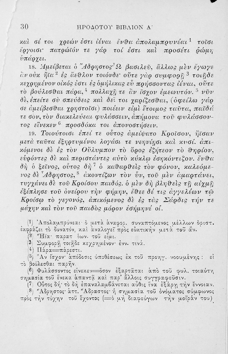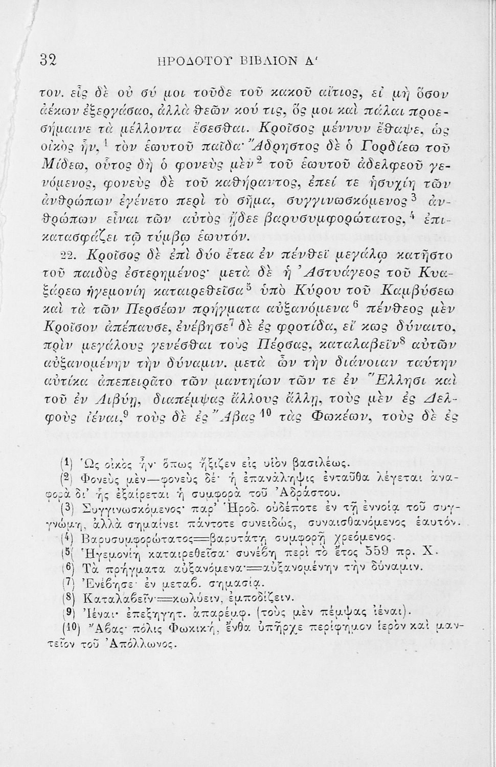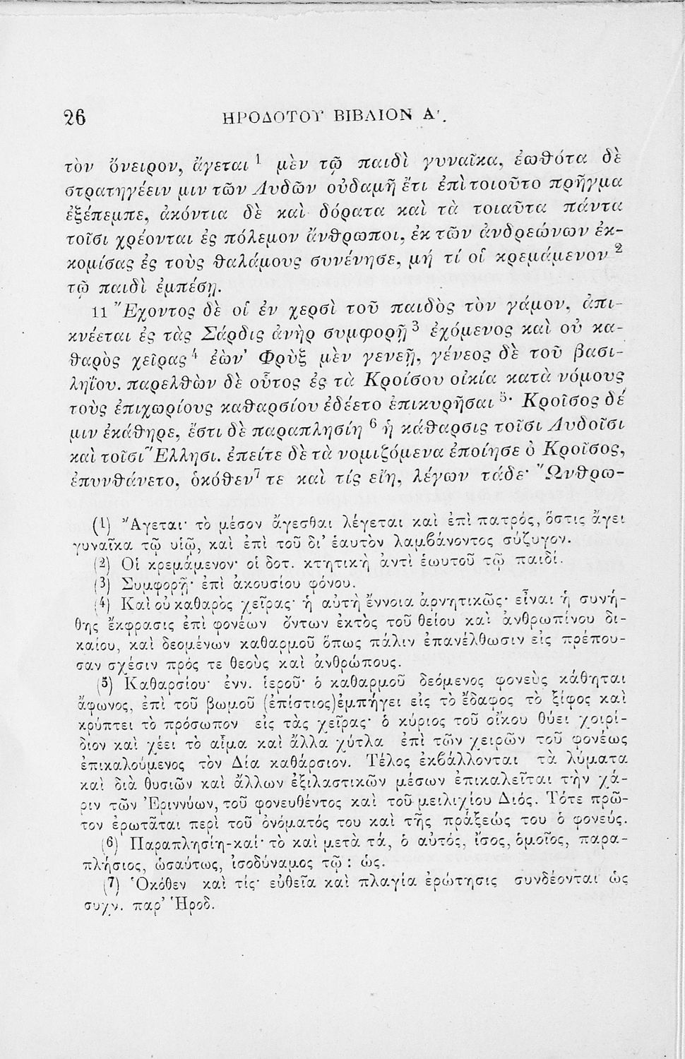 Σχολικό εγχειρίδιο Αρχαίων Ελληνικών για τα Γυμνάσια και τα Παρθεναγωγεία που περιλαμβάνει αποσπάσματα από το έργο του Ηροδότου Ιστορία και ερμηνευτικές σημειώσεις.