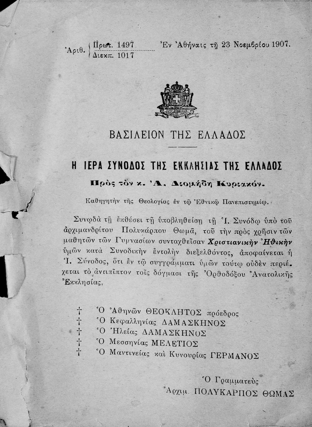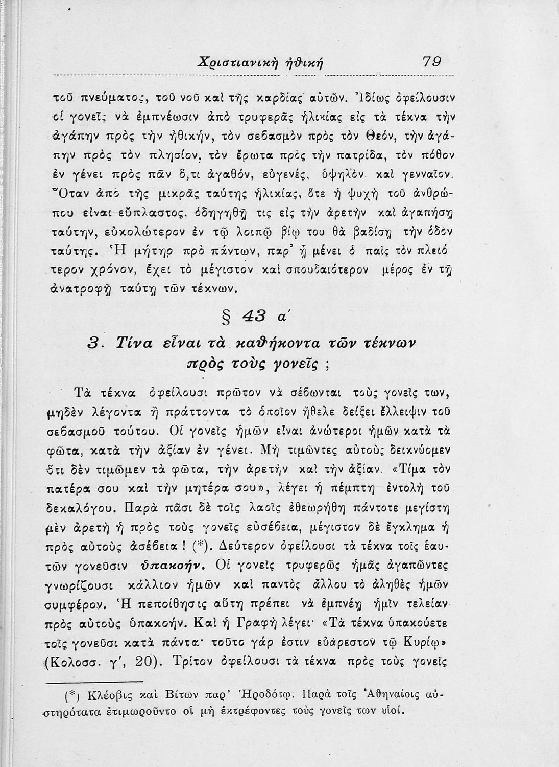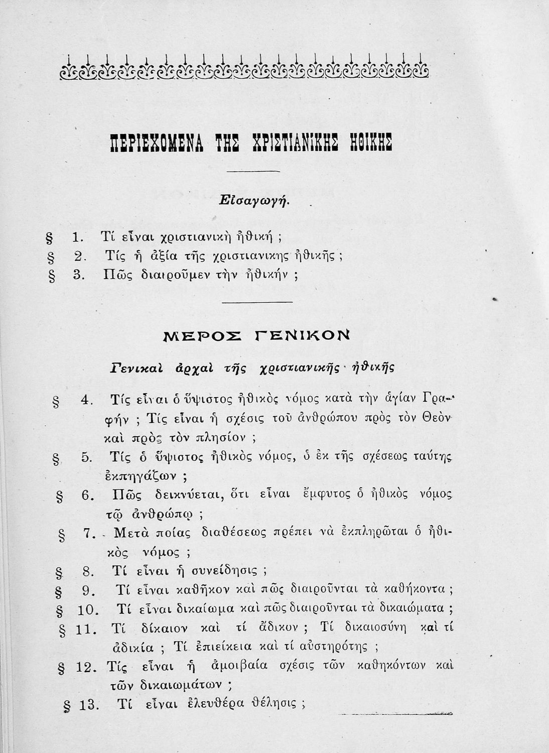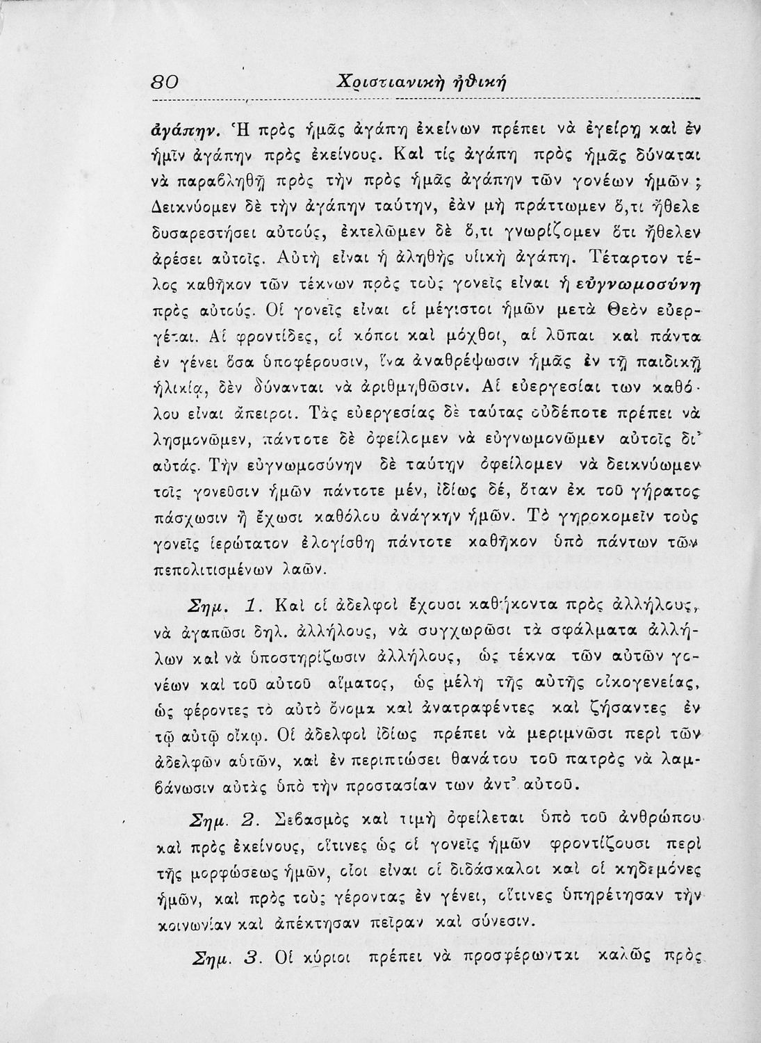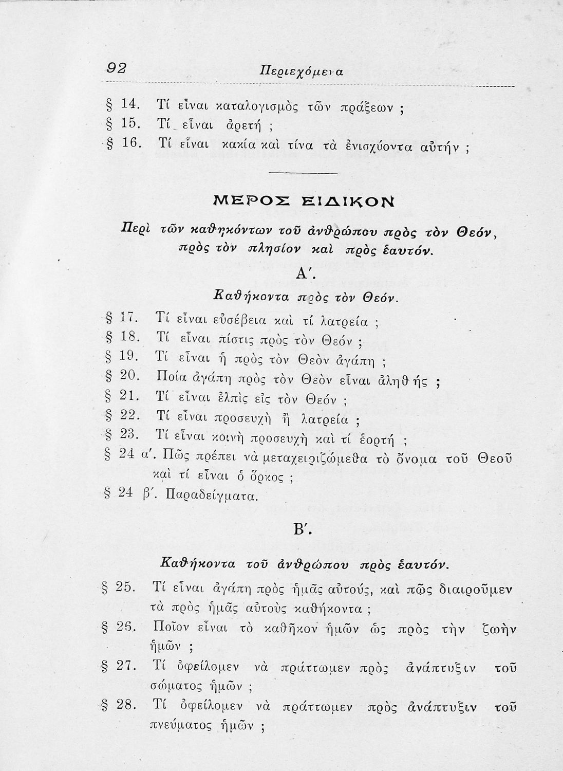 Βαθμίδα εκπαίδευσης: Δευτεροβάθμια Τάξη: Γυμνάσιο Μάθημα: Θρησκευτικά Γλώσσα: Καθαρεύουσα Παρουσίαση περιεχομένου: Σχολικό εγχειρίδιο Θρησκευτικών για τα Γυμνάσια που εστιάζει στη χριστιανική ηθική και αναλύει τα καθήκοντα του ανθρώπου προς τον Θεό, τους άλλους ανθρώπους και τον εαυτό του. |