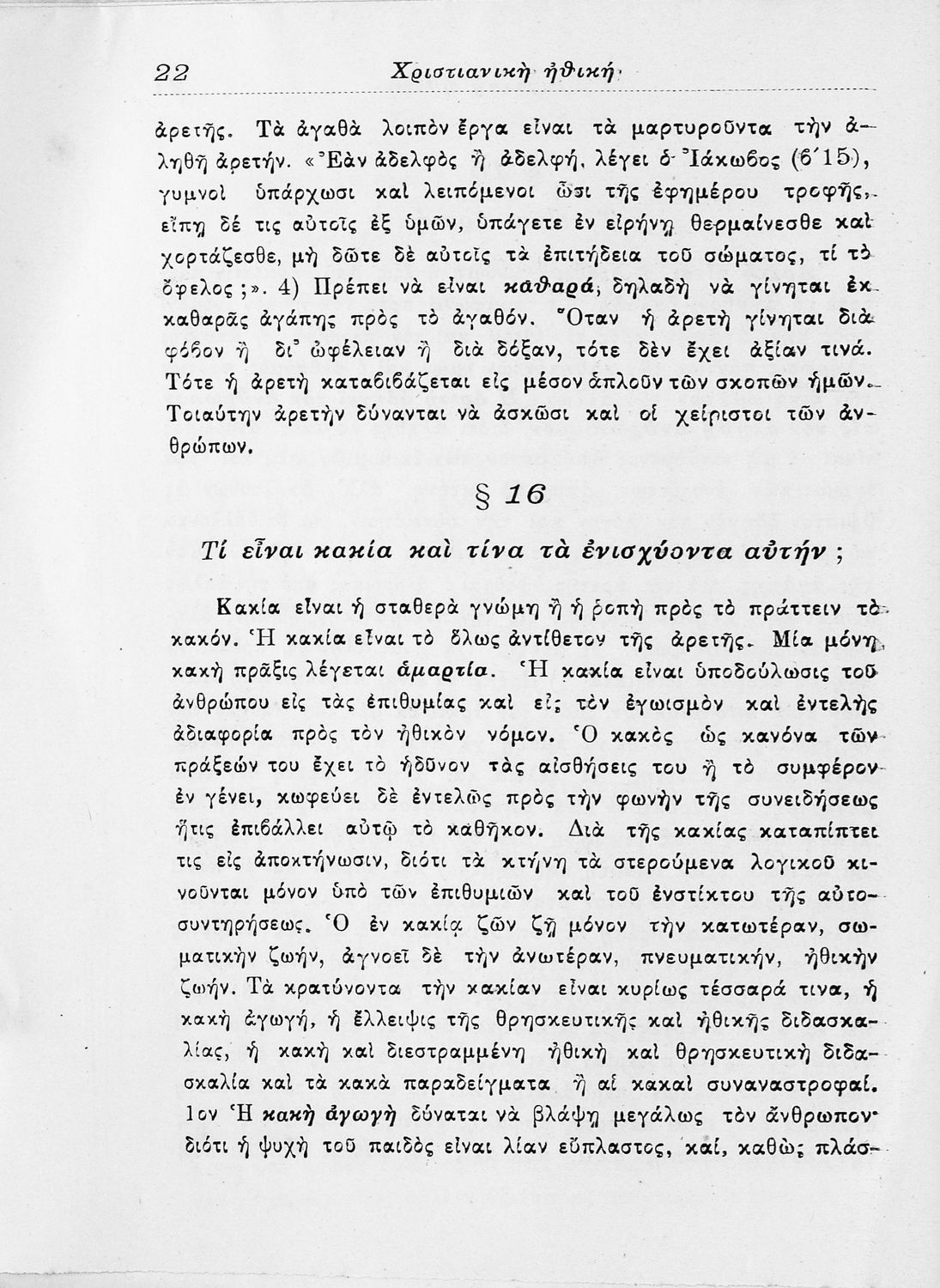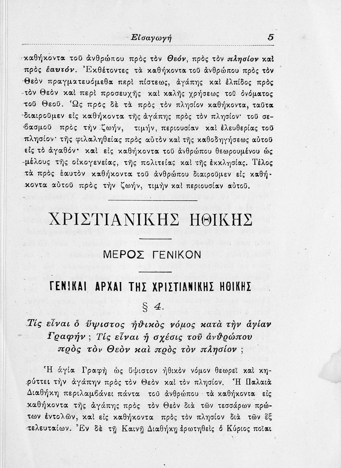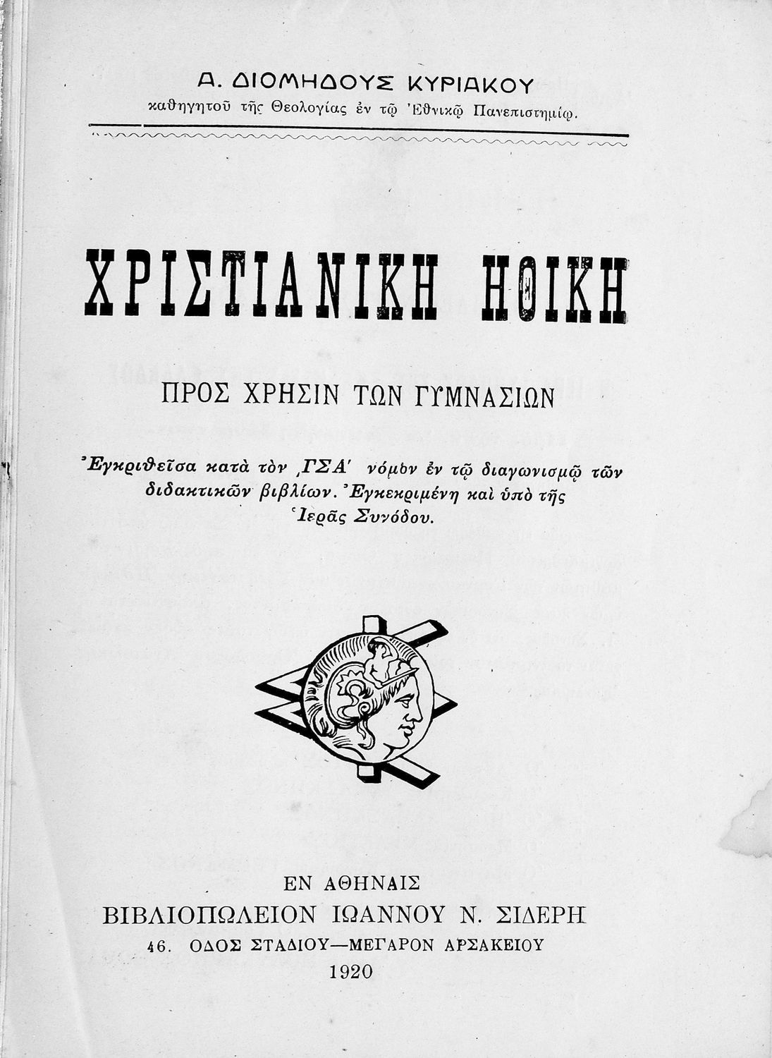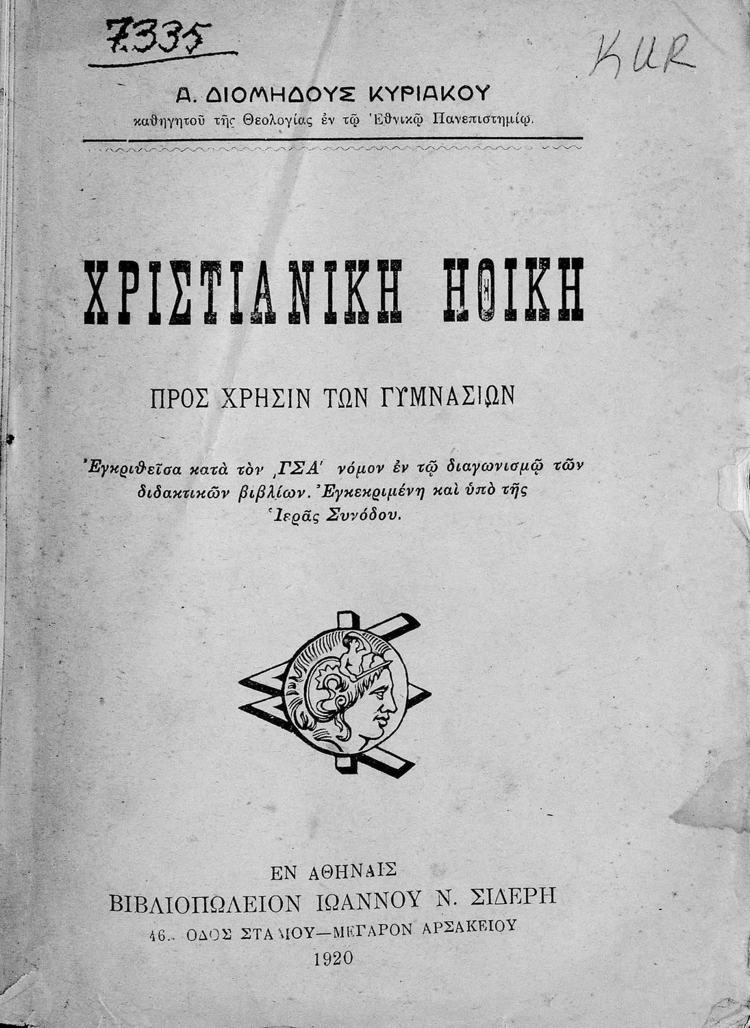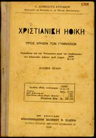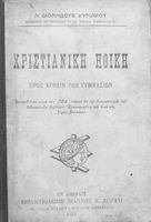 Βαθμίδα εκπαίδευσης: Δευτεροβάθμια Τάξη: Γυμνάσιο Μάθημα: Θρησκευτικά Γλώσσα: Καθαρεύουσα Παρουσίαση περιεχομένου: Σχολικό εγχειρίδιο Θρησκευτικών για τα Γυμνάσια που εστιάζει στη χριστιανική ηθική και αναλύει τα καθήκοντα του ανθρώπου προς τον Θεό, τους άλλους ανθρώπους και τον εαυτό του. |