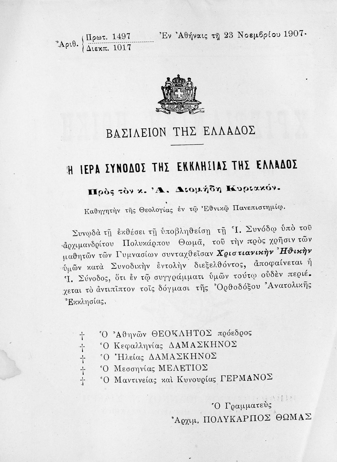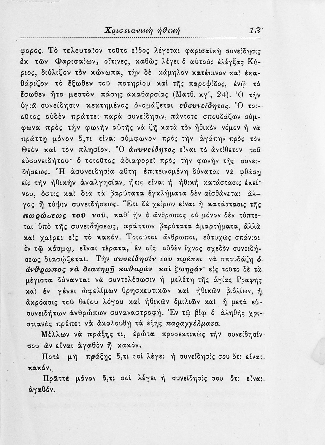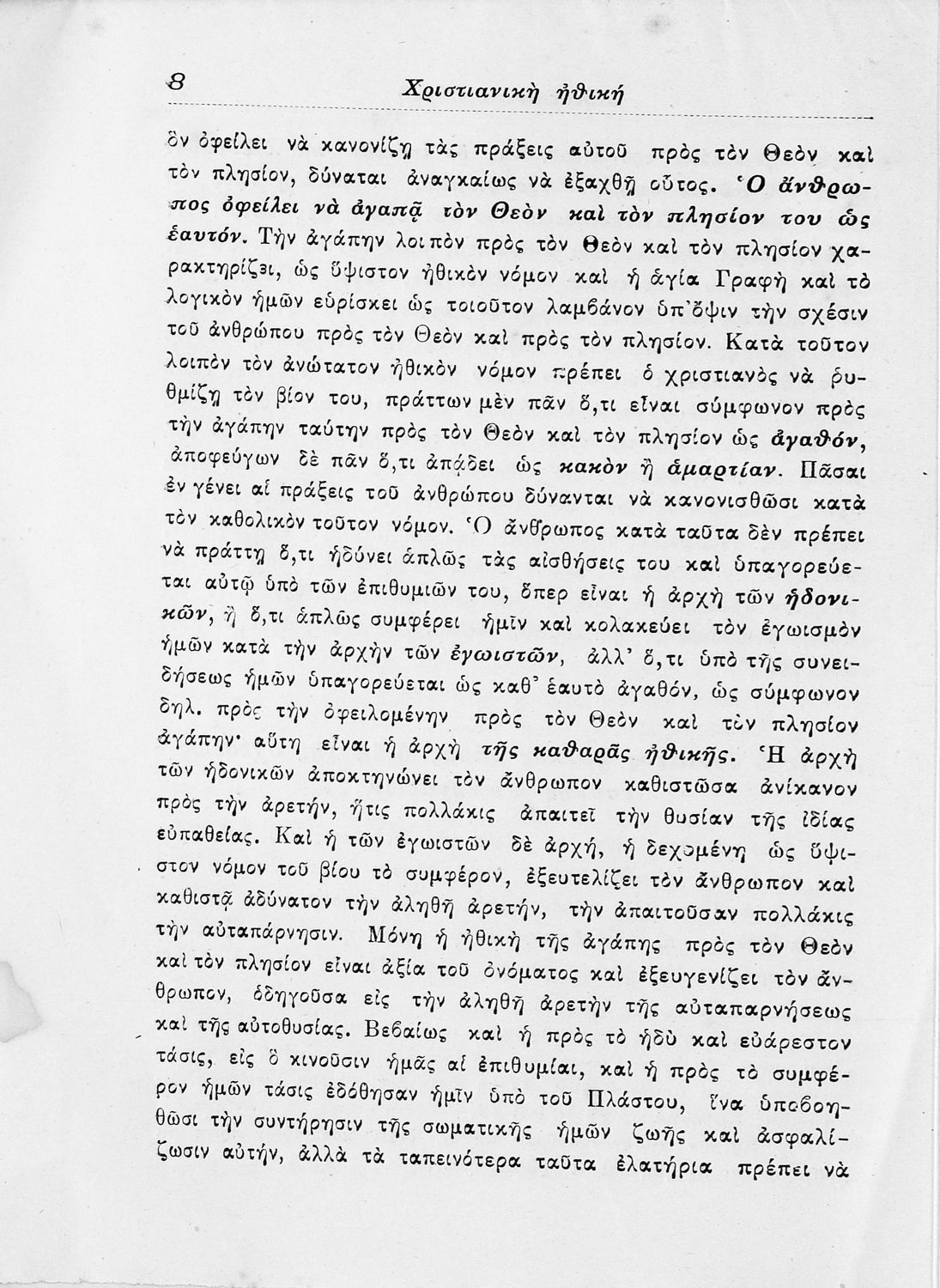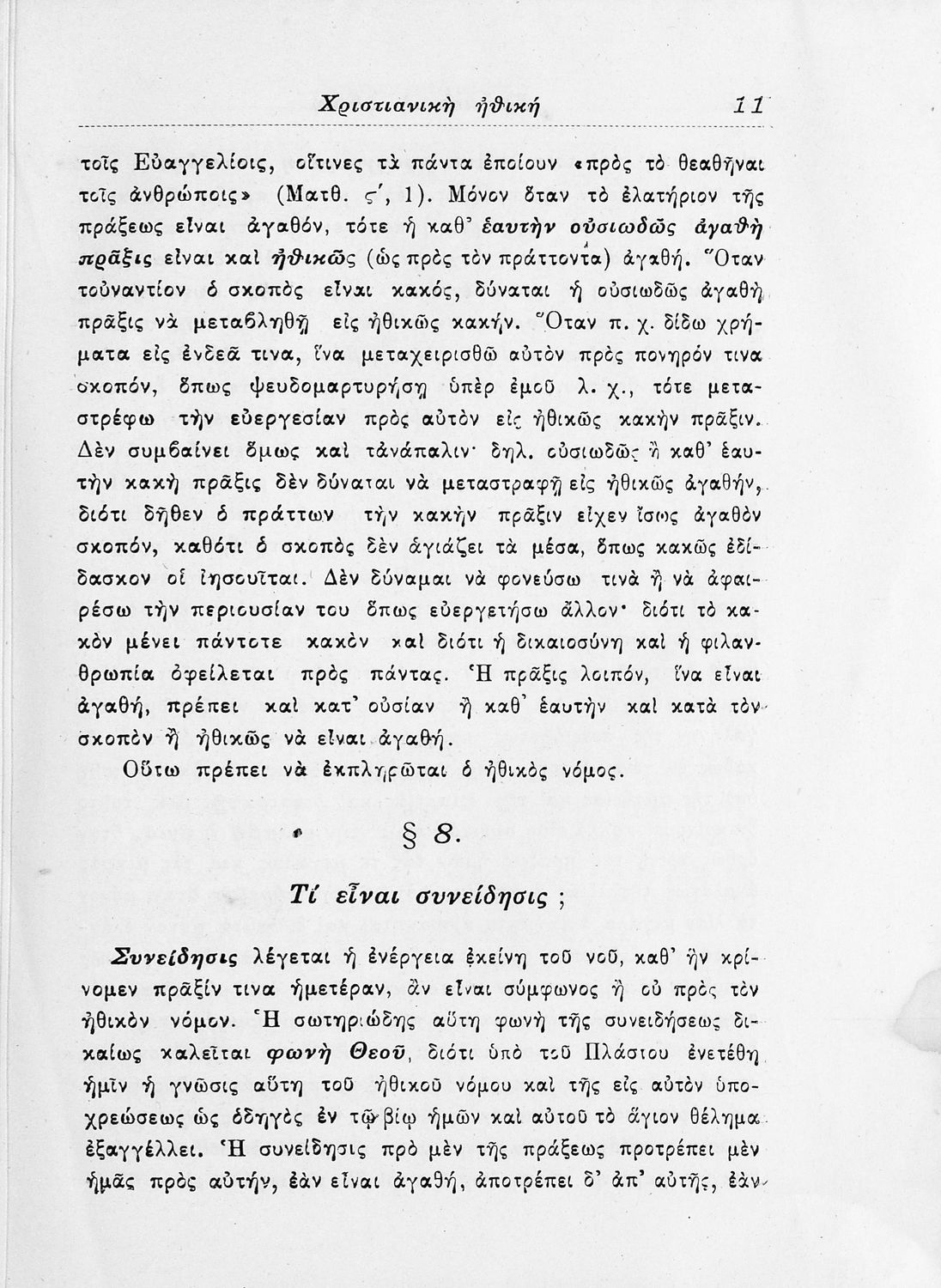 Βαθμίδα εκπαίδευσης: Δευτεροβάθμια Τάξη: Γυμνάσιο Μάθημα: Θρησκευτικά Γλώσσα: Καθαρεύουσα Παρουσίαση περιεχομένου: Σχολικό εγχειρίδιο Θρησκευτικών για τα Γυμνάσια που εστιάζει στη χριστιανική ηθική και αναλύει τα καθήκοντα του ανθρώπου προς τον Θεό, τους άλλους ανθρώπους και τον εαυτό του. |