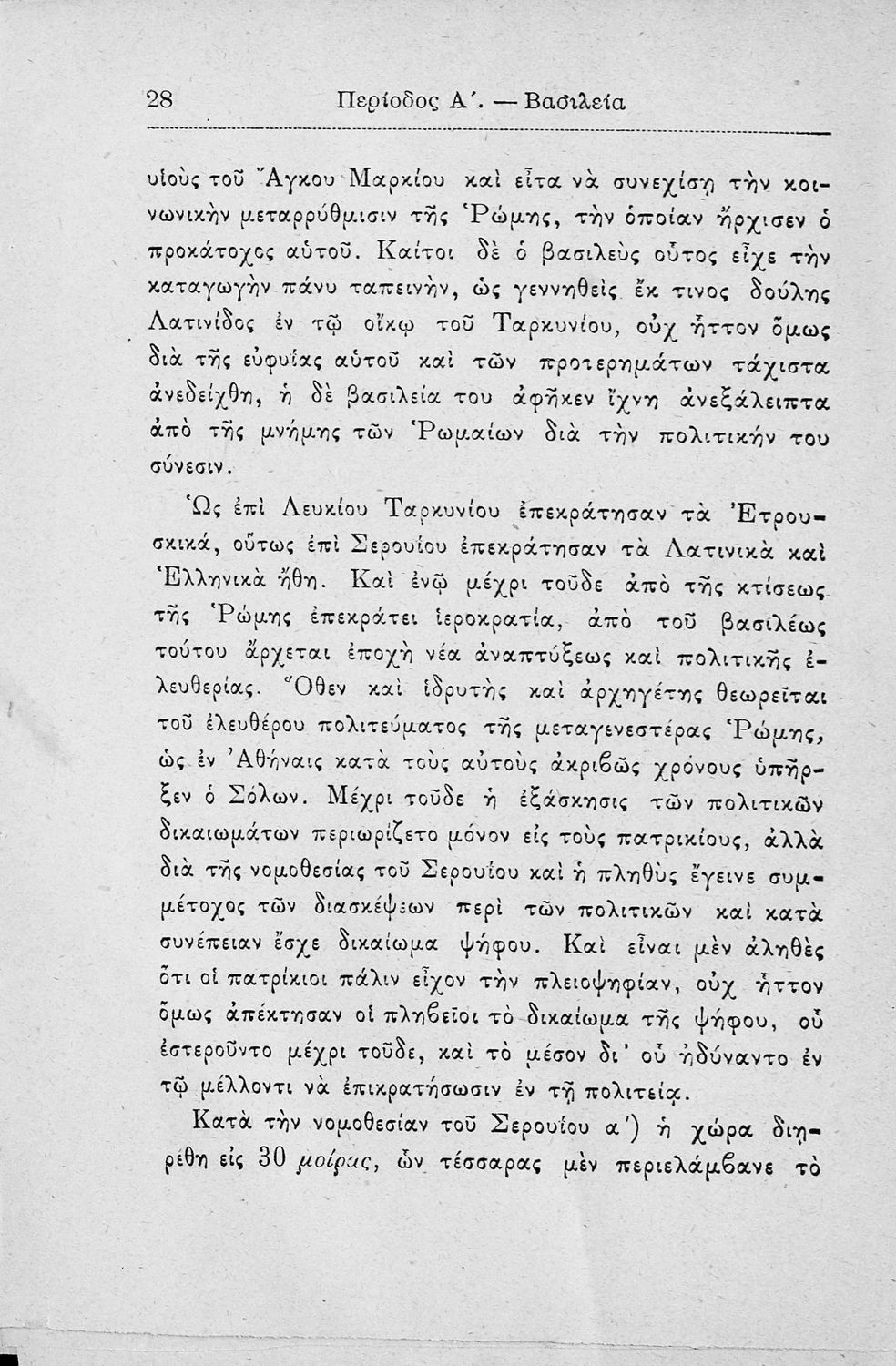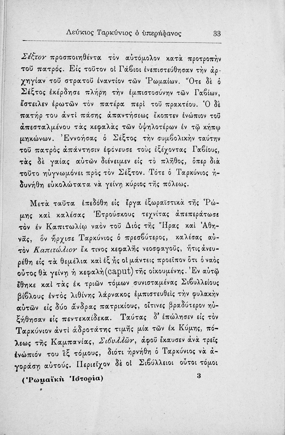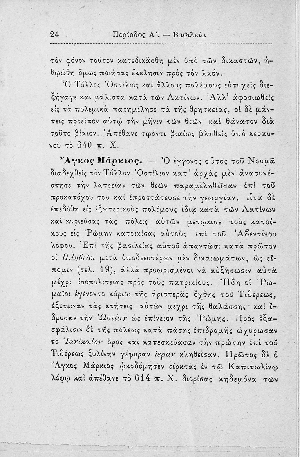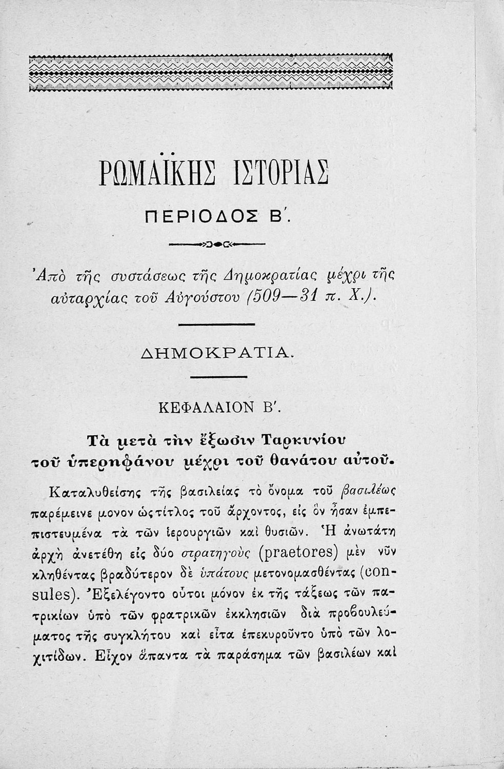 Βαθμίδα εκπαίδευσης: Δευτεροβάθμια Τάξη: Γυμνάσιο / Αστικό Σχολείο Μάθημα: Ιστορία Γλώσσα: Καθαρεύουσα Παρουσίαση περιεχομένου: Σχολικό εγχειρίδιο Ιστορίας για τα Γυμνάσια και τα Αστικά Σχολεία περιλαμβάνει την περίοδο από την ίδρυση της Ρώμης ως την κατάλυση του δυτικού ρωμαϊκού κράτους. |