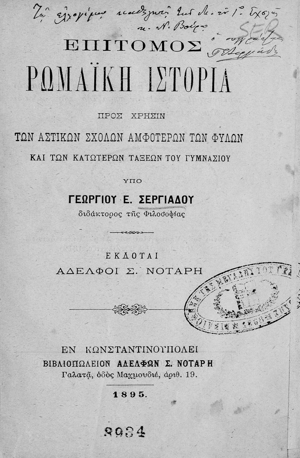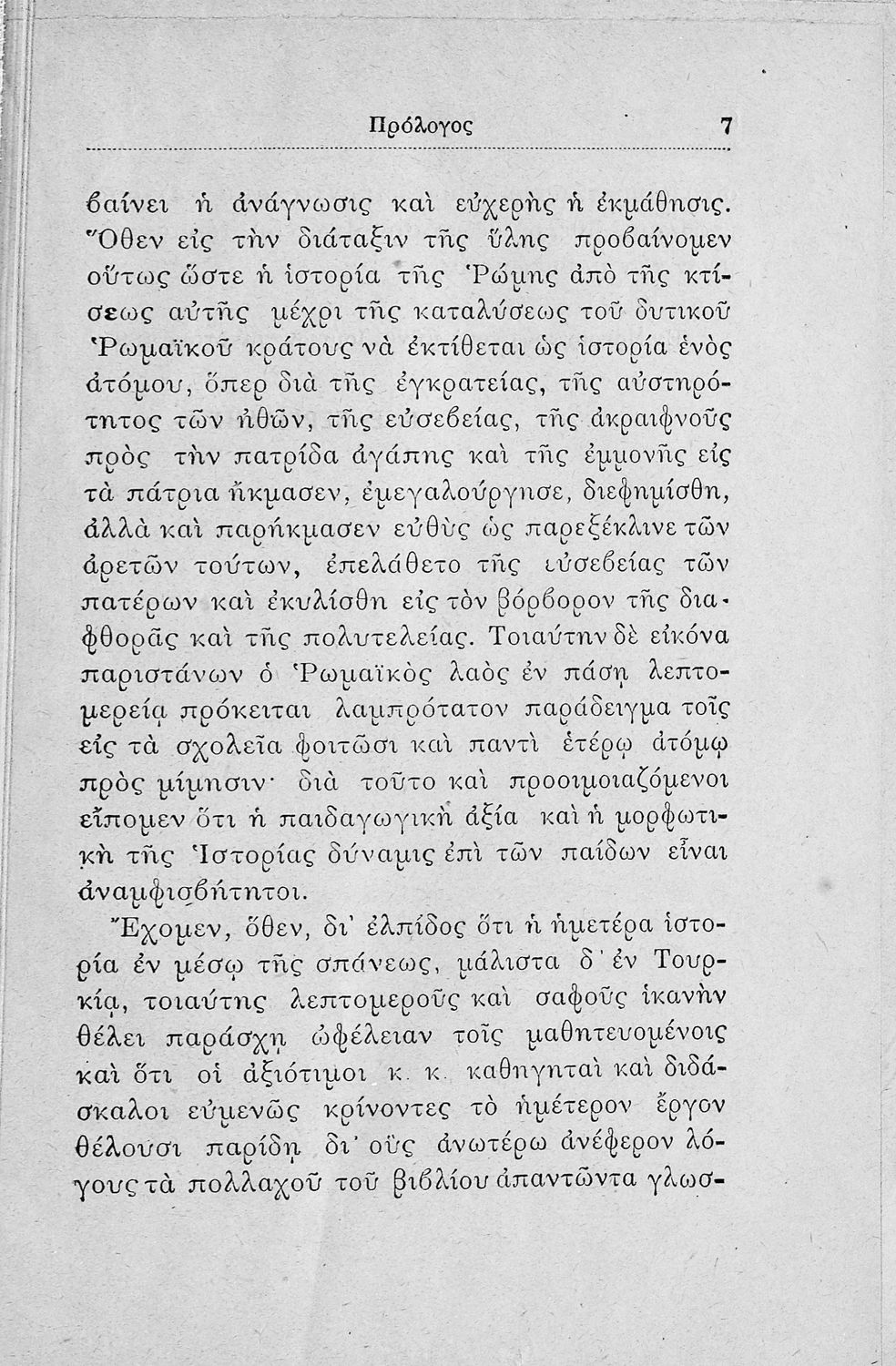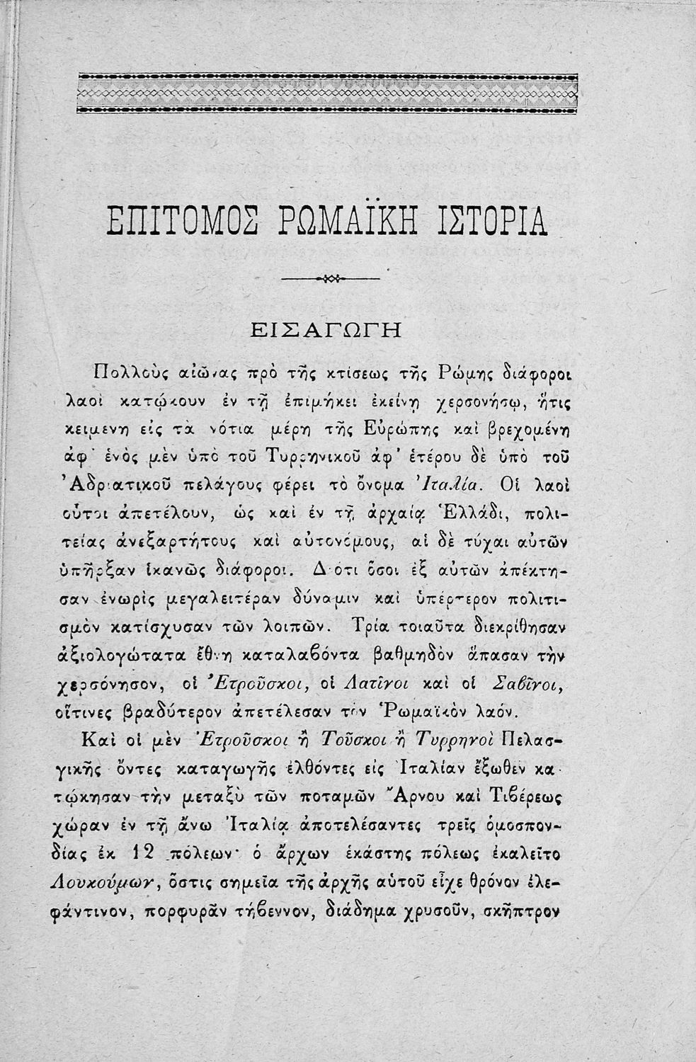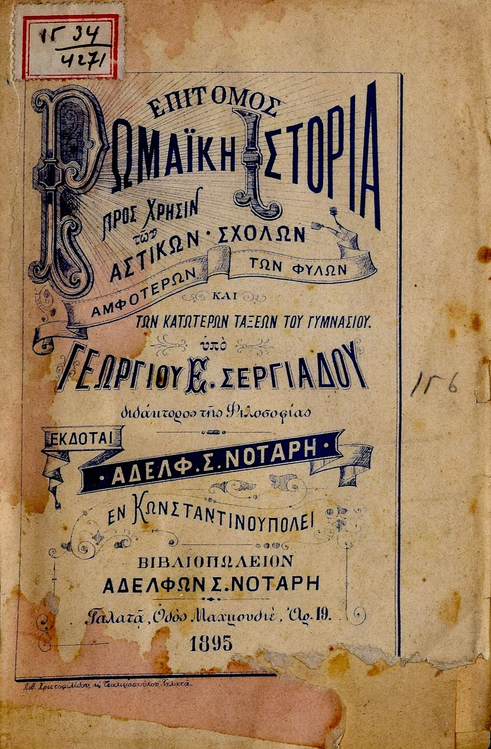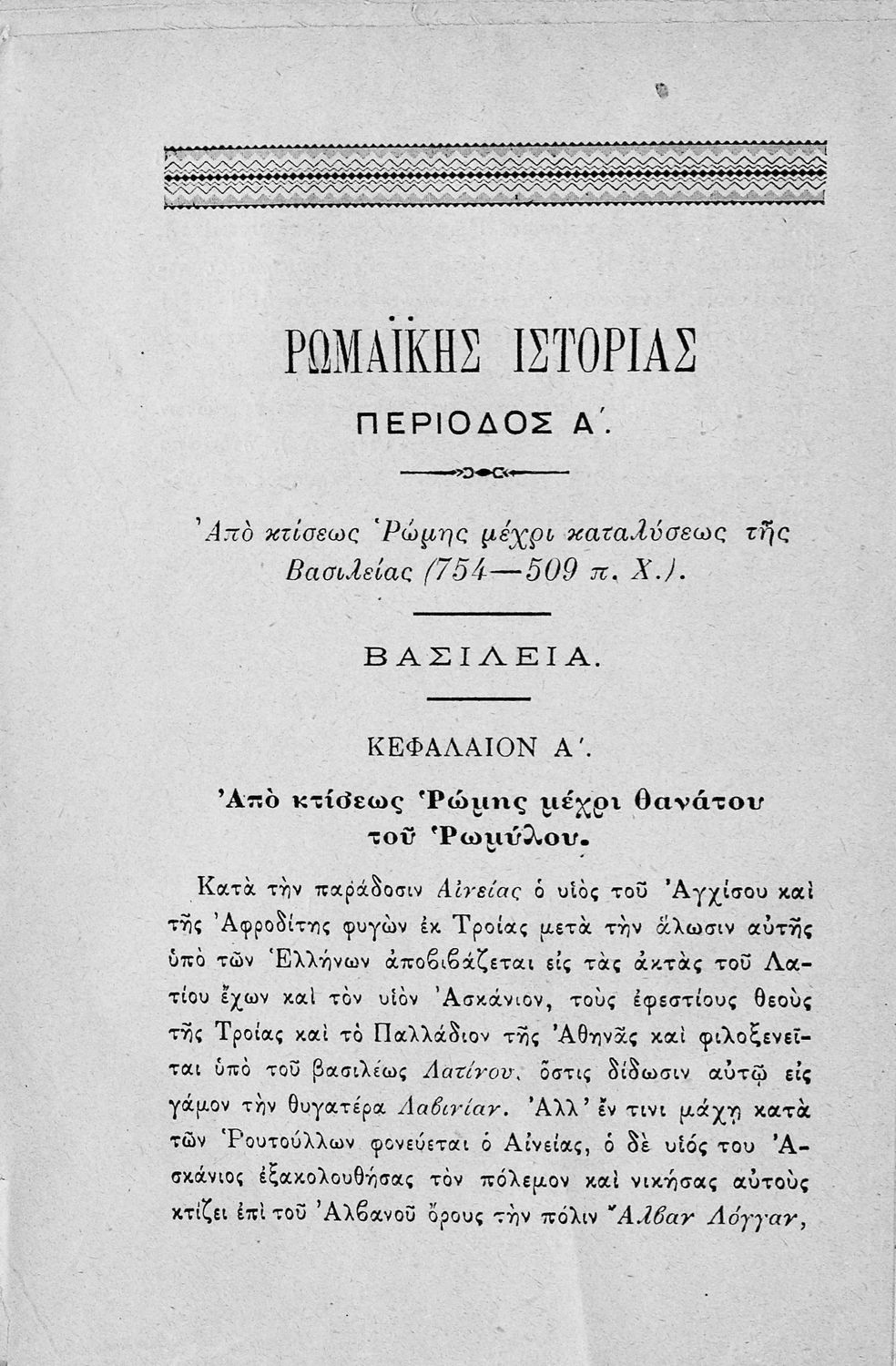 Βαθμίδα εκπαίδευσης: Δευτεροβάθμια Τάξη: Γυμνάσιο / Αστικό Σχολείο Μάθημα: Ιστορία Γλώσσα: Καθαρεύουσα Παρουσίαση περιεχομένου: Σχολικό εγχειρίδιο Ιστορίας για τα Γυμνάσια και τα Αστικά Σχολεία περιλαμβάνει την περίοδο από την ίδρυση της Ρώμης ως την κατάλυση του δυτικού ρωμαϊκού κράτους. |