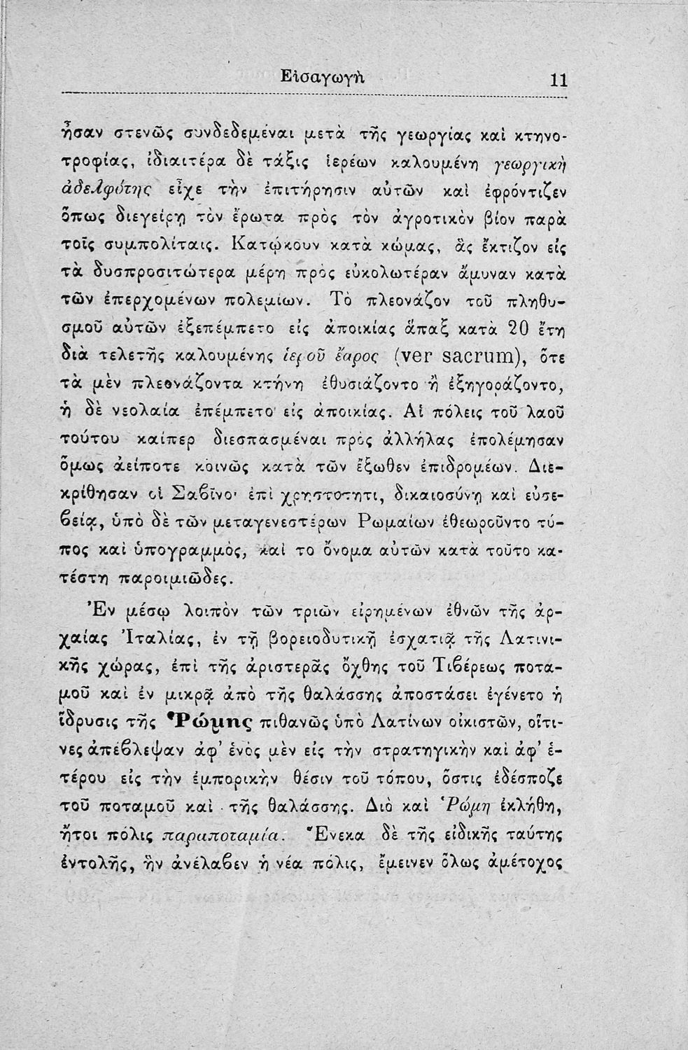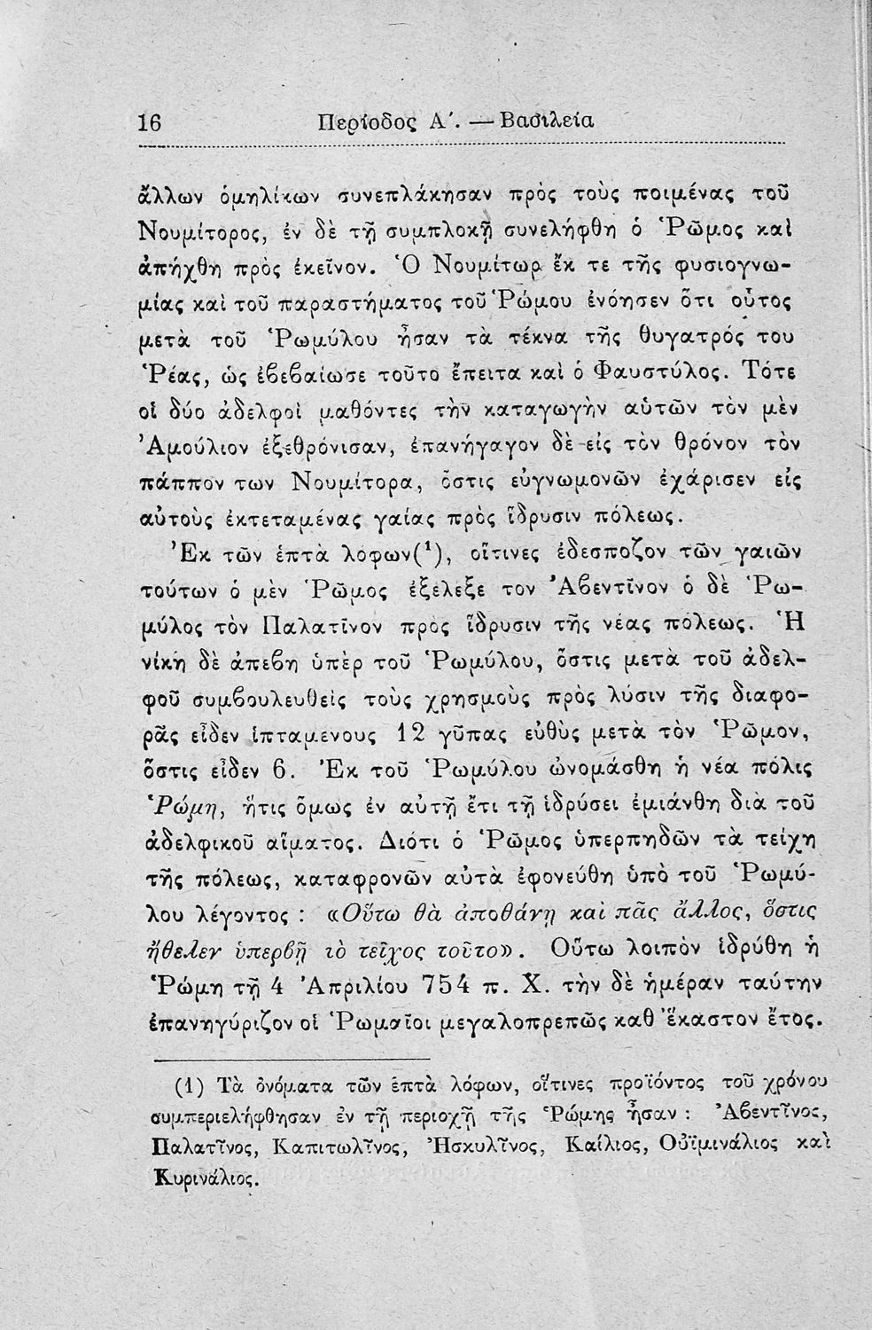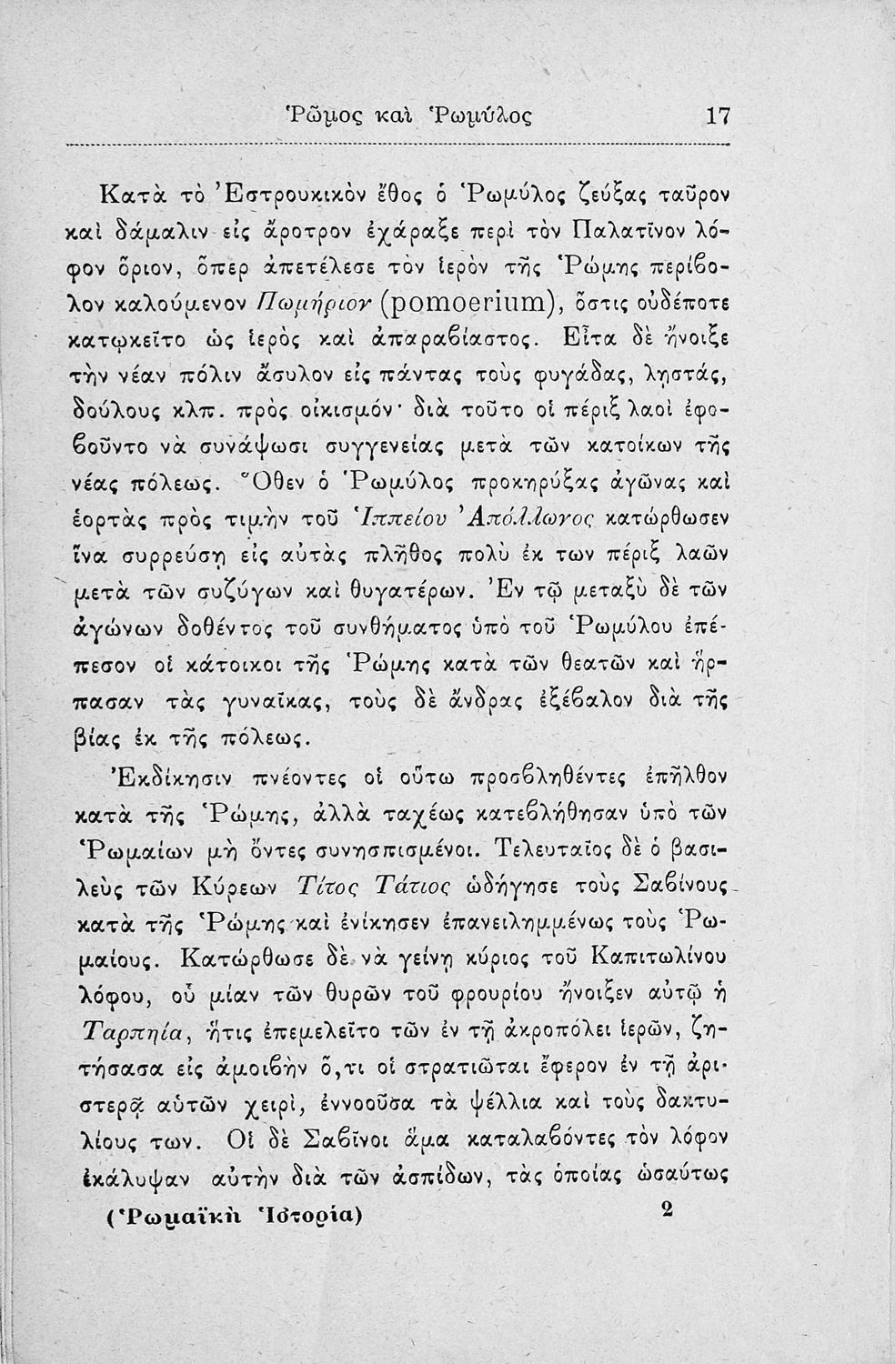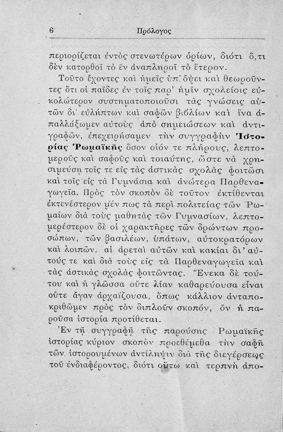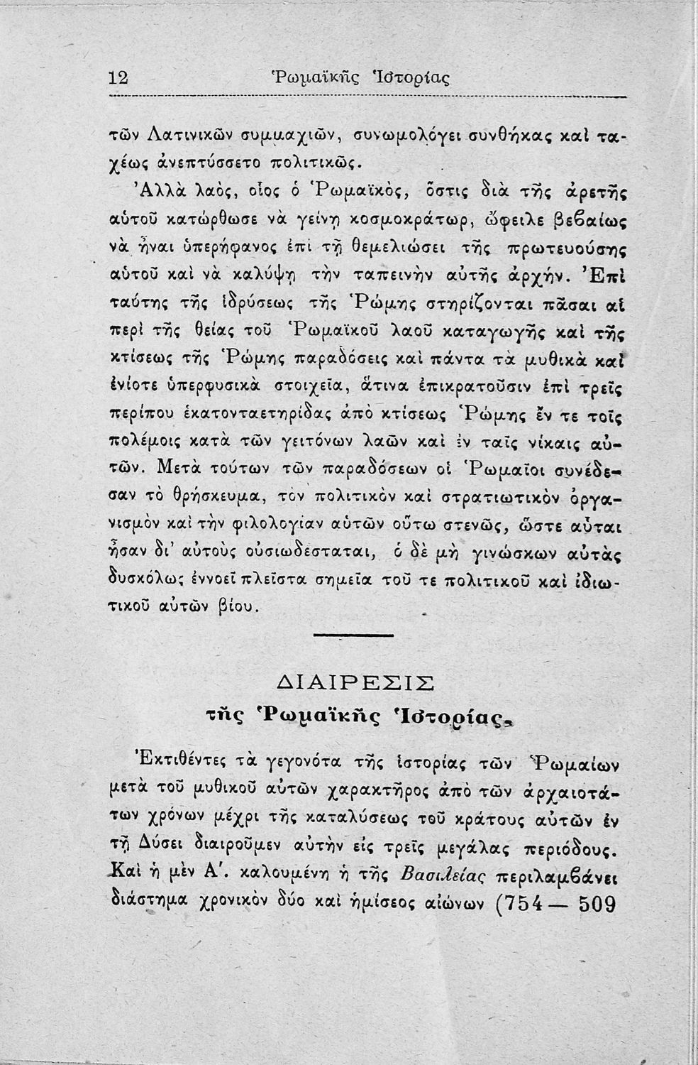Βαθμίδα εκπαίδευσης: Δευτεροβάθμια Τάξη: Γυμνάσιο / Αστικό Σχολείο Μάθημα: Ιστορία Γλώσσα: Καθαρεύουσα Παρουσίαση περιεχομένου: Σχολικό εγχειρίδιο Ιστορίας για τα Γυμνάσια και τα Αστικά Σχολεία περιλαμβάνει την περίοδο από την ίδρυση της Ρώμης ως την κατάλυση του δυτικού ρωμαϊκού κράτους. |