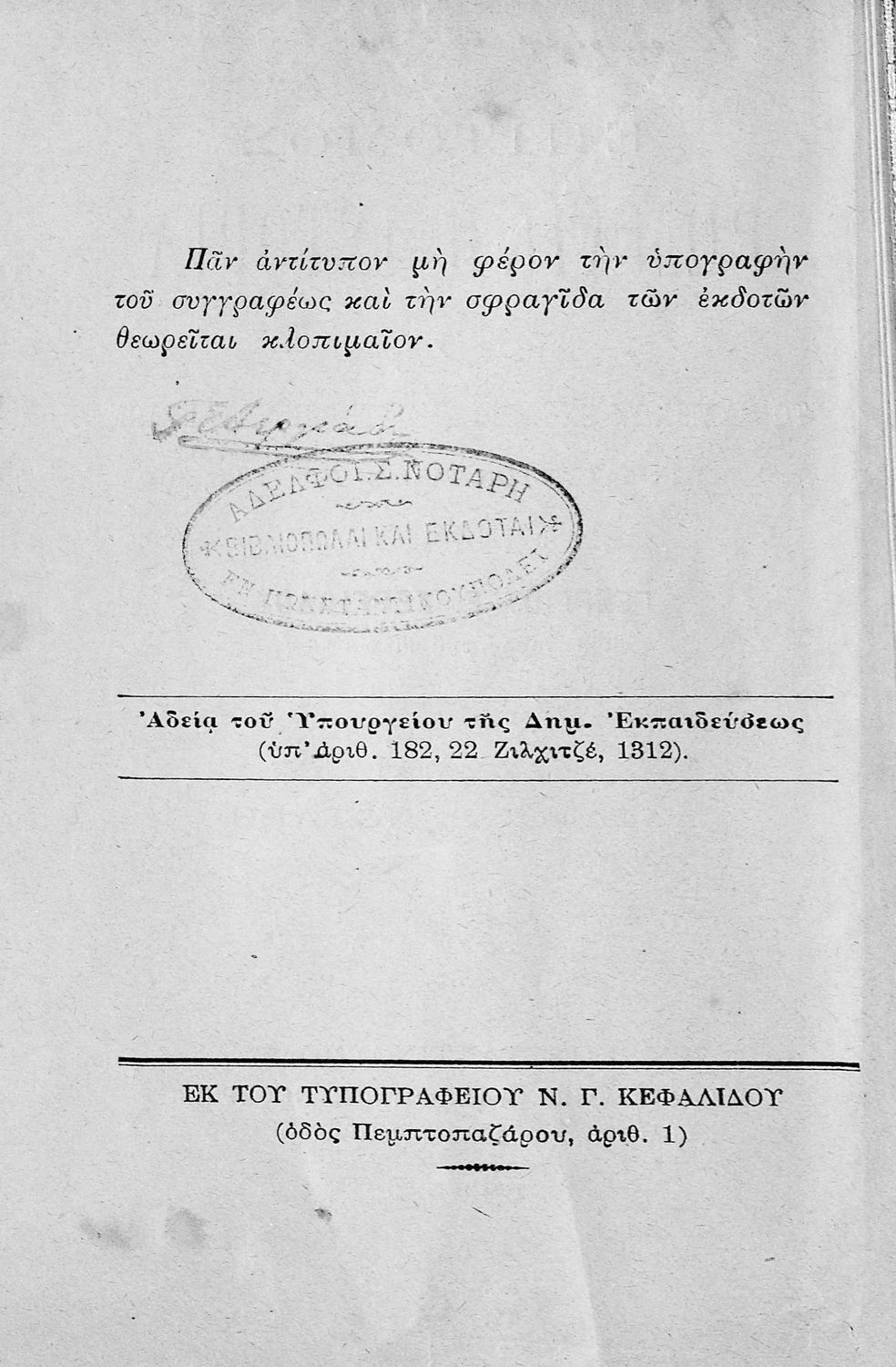 Εκδότης: Βιβλιοπωλείον Αφών Σ. Νόταρη Έτος έκδοσης: 1895 Τόπος έκδοσης: Κωνσταντινούπολη Υπουργική απόφαση / Σύμβαση: 182/ 22 Ζιλχιτζέ 1312 Έτος έγκρισης: 1812 |