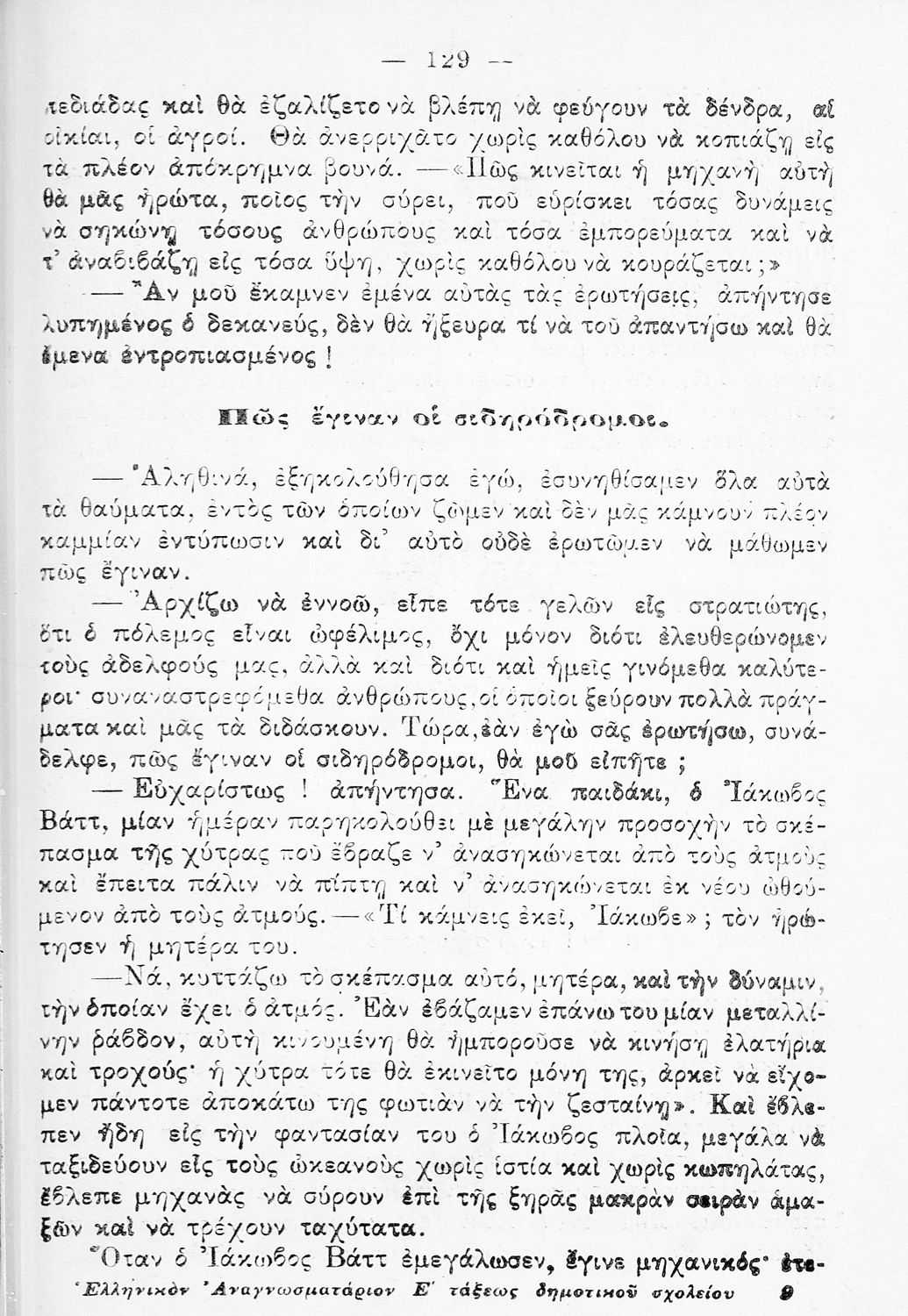 Αναγνωστικό Ε΄ Δημοτικού που περιλαμβάνει εξιστορήσεις πολεμικών γεγονότων εμπνευσμένες από την περίοδο του Βυζαντίου και των Βαλκανικών Πολέμων.