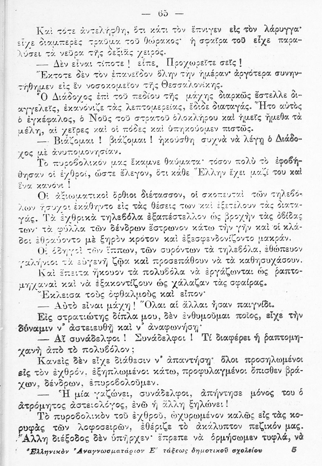 Αναγνωστικό Ε΄ Δημοτικού που περιλαμβάνει εξιστορήσεις πολεμικών γεγονότων εμπνευσμένες από την περίοδο του Βυζαντίου και των Βαλκανικών Πολέμων.