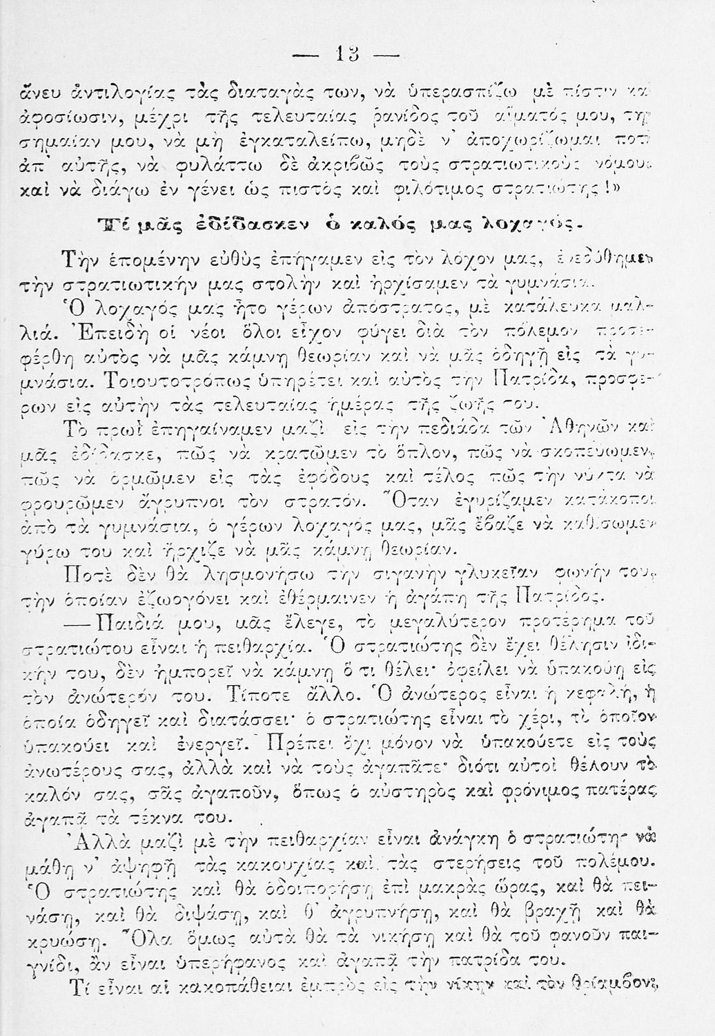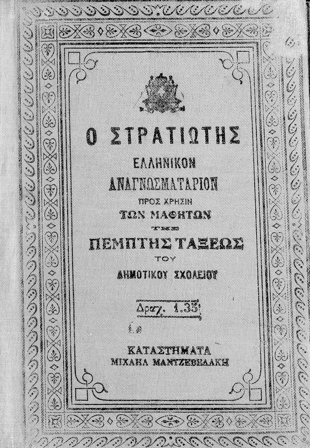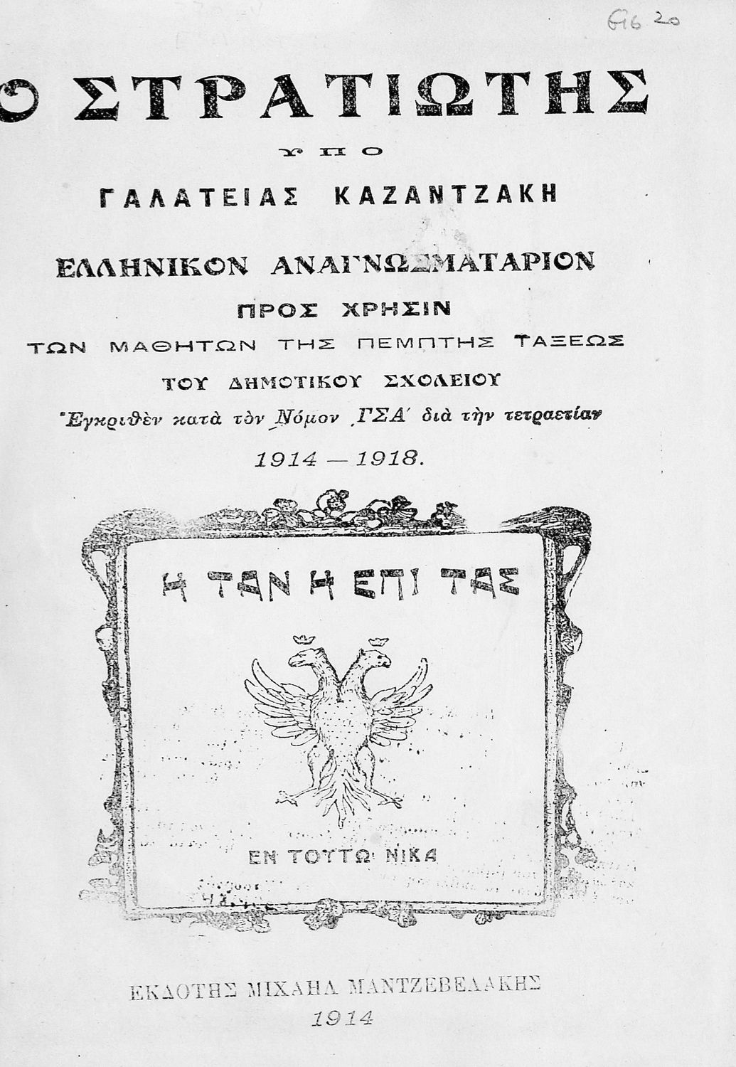 Ο στρατιώτης. Ελληνικόν αναγνωσματάριον προς χρήσιν των μαθητών της πέμπτης τάξης του Δημοτικού Σχολείου. Εγκριθέν κατά τον Νόμον ΓΣΑ΄ διά την τετραετίαν 1914-1918.
