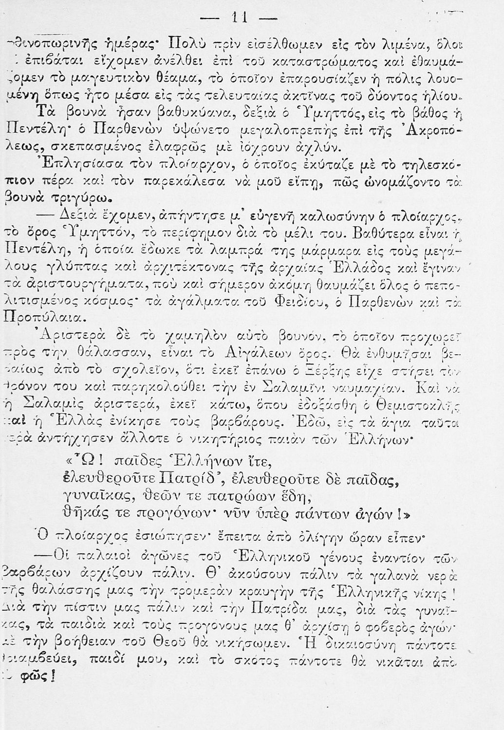 Αναγνωστικό Ε΄ Δημοτικού που περιλαμβάνει ποιήματα και πεζά ηθοποιητικού περιεχομένου που αντλούν τα θέματά τους από την αρχαία και σύγχρονη ελληνική ιστορία.