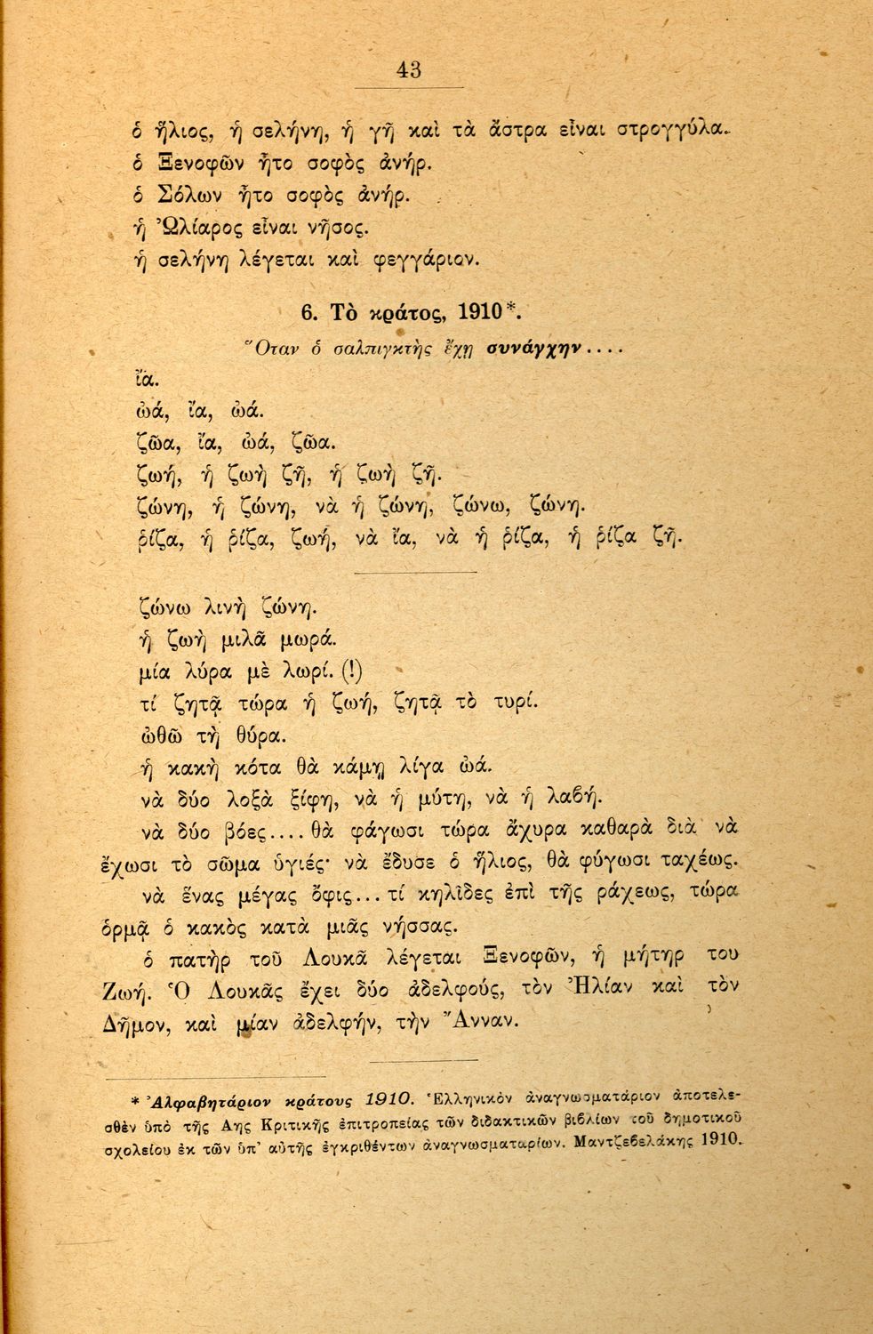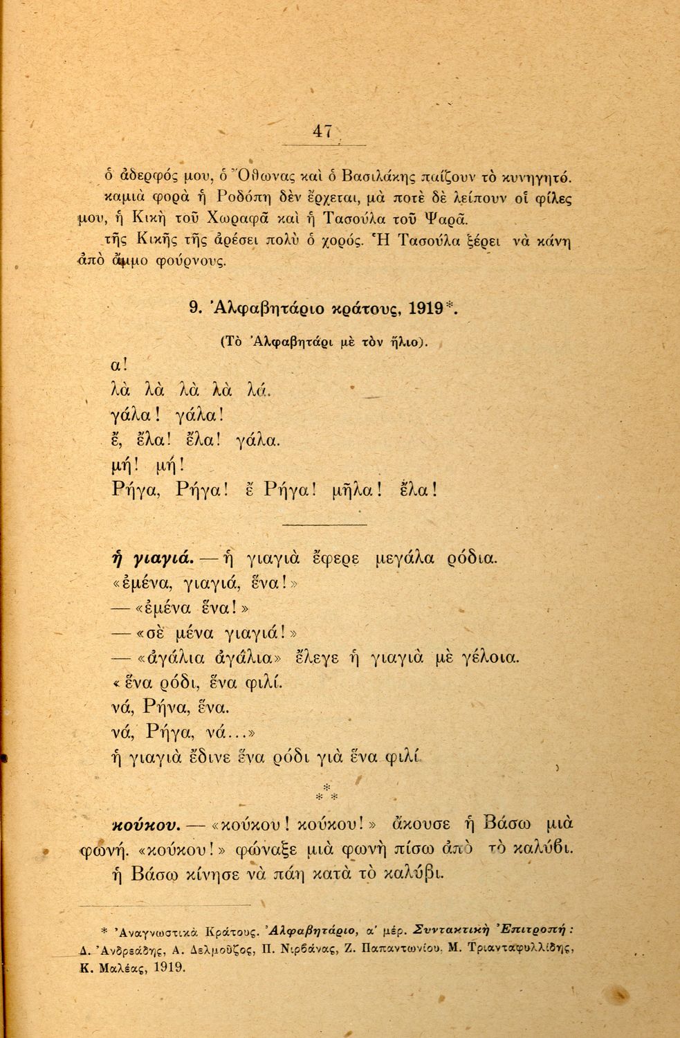 Βαθμίδα εκπαίδευσης: Πρωτοβάθμια Μάθημα: Νέα Ελληνικά Γλώσσα: Δημοτική Παρουσίαση περιεχομένου: Κείμενο του Δ. Γληνού που, με σκωπτική διάθεση, αντιπαραβάλλει τα αναγνωστικά της πρώτης εκπαιδευτικής μεταρρύθμισης του Ε. Βενιζέλου όπως Τα ψηλά βουνά ή Το Αλφαβητάρι με τον ήλιο με αυτά της προηγούμενης περιόδου από όπου και αντλεί τον τίτλο του βιβλίου. |