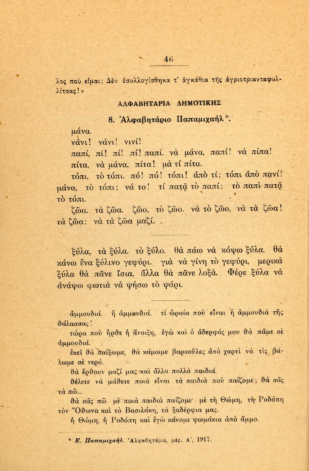 Κωδικός αναγνώρισης: 20-00105 Τίτλος: Οι χοίροι ιύζουσιν, τα χοιρίδια κοΐζουσιν, οι όφεις ιύζουσιν (Αλφαβητάριον Παπαμάρκου) Συγγραφέας: Αντ. Γαβριήλ (Δημήτρης Γληνός) Μέγεθος και υπόστρωμα: Άλλο, 22εκ., μαλακό εξώφυλλο, 74 σελίδες. |