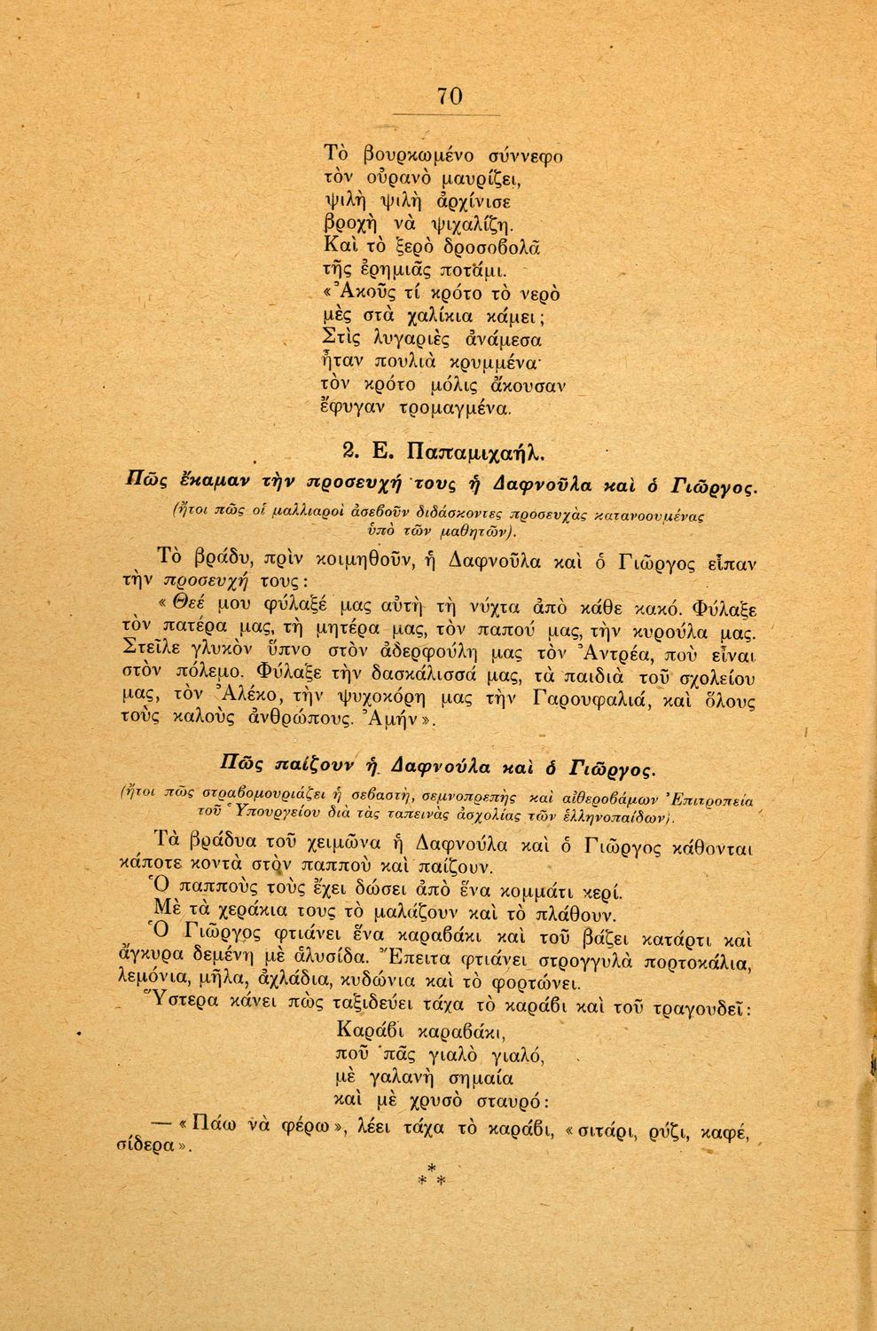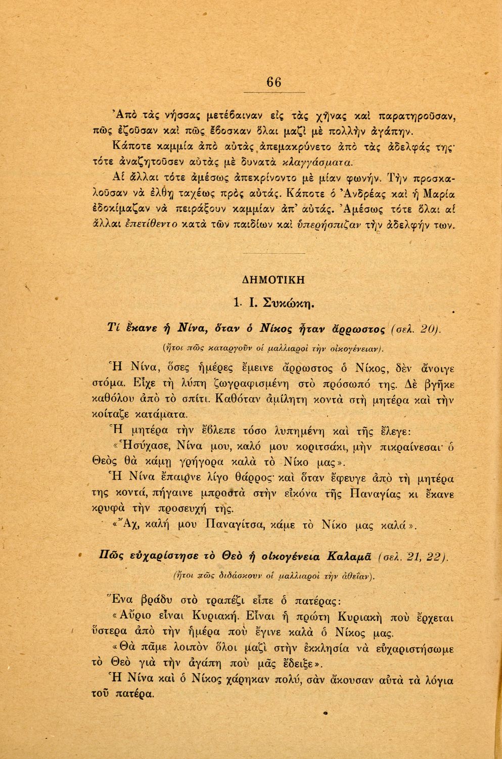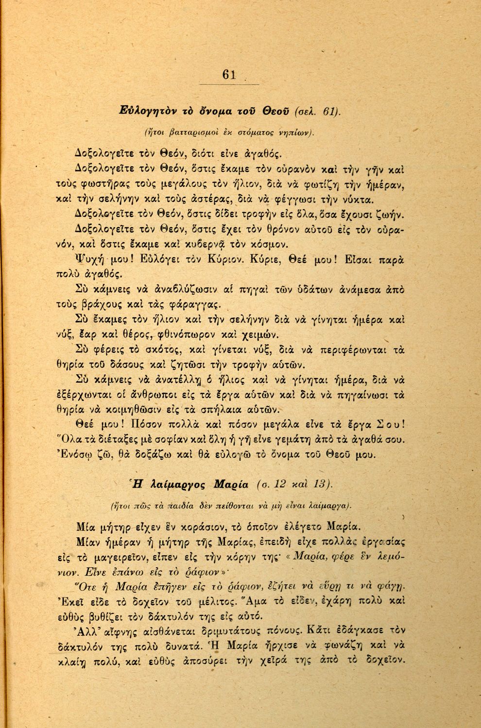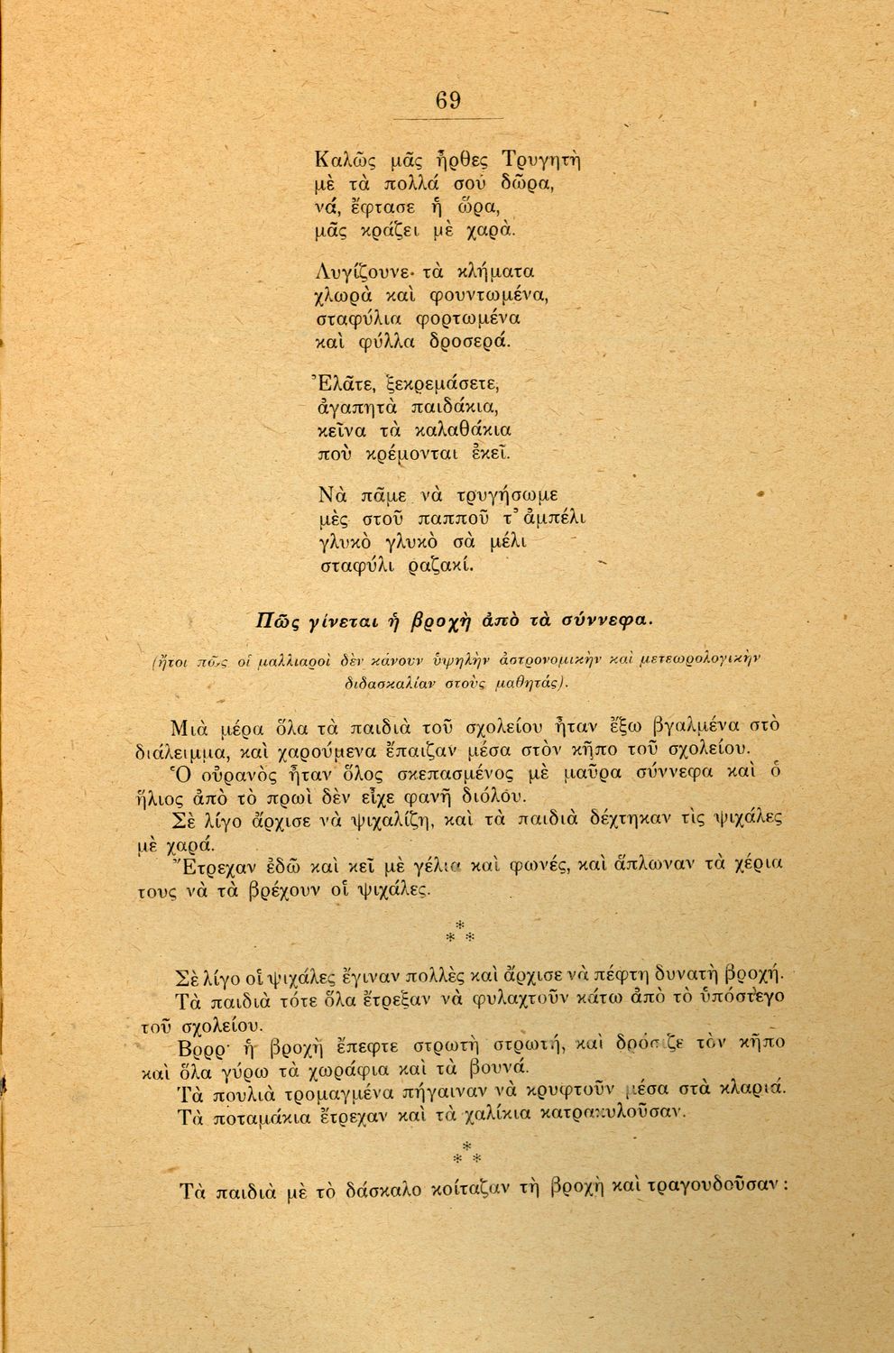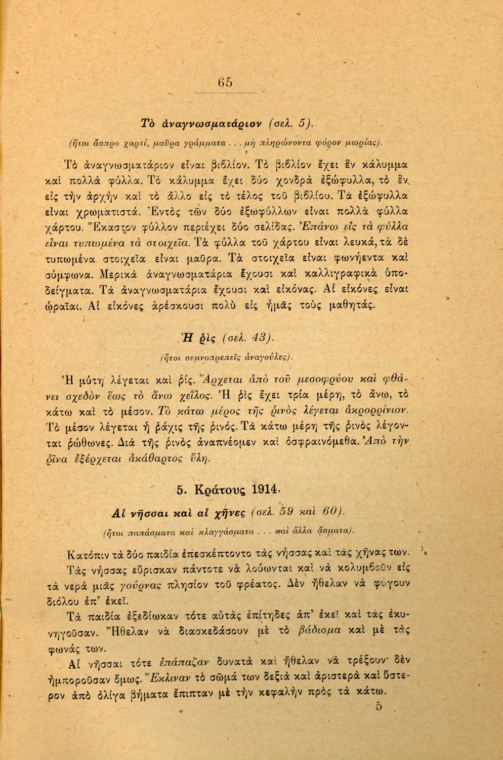 Βαθμίδα εκπαίδευσης: Πρωτοβάθμια Μάθημα: Νέα Ελληνικά Γλώσσα: Δημοτική Παρουσίαση περιεχομένου: Κείμενο του Δ. Γληνού που, με σκωπτική διάθεση, αντιπαραβάλλει τα αναγνωστικά της πρώτης εκπαιδευτικής μεταρρύθμισης του Ε. Βενιζέλου όπως Τα ψηλά βουνά ή Το Αλφαβητάρι με τον ήλιο με αυτά της προηγούμενης περιόδου από όπου και αντλεί τον τίτλο του βιβλίου. |