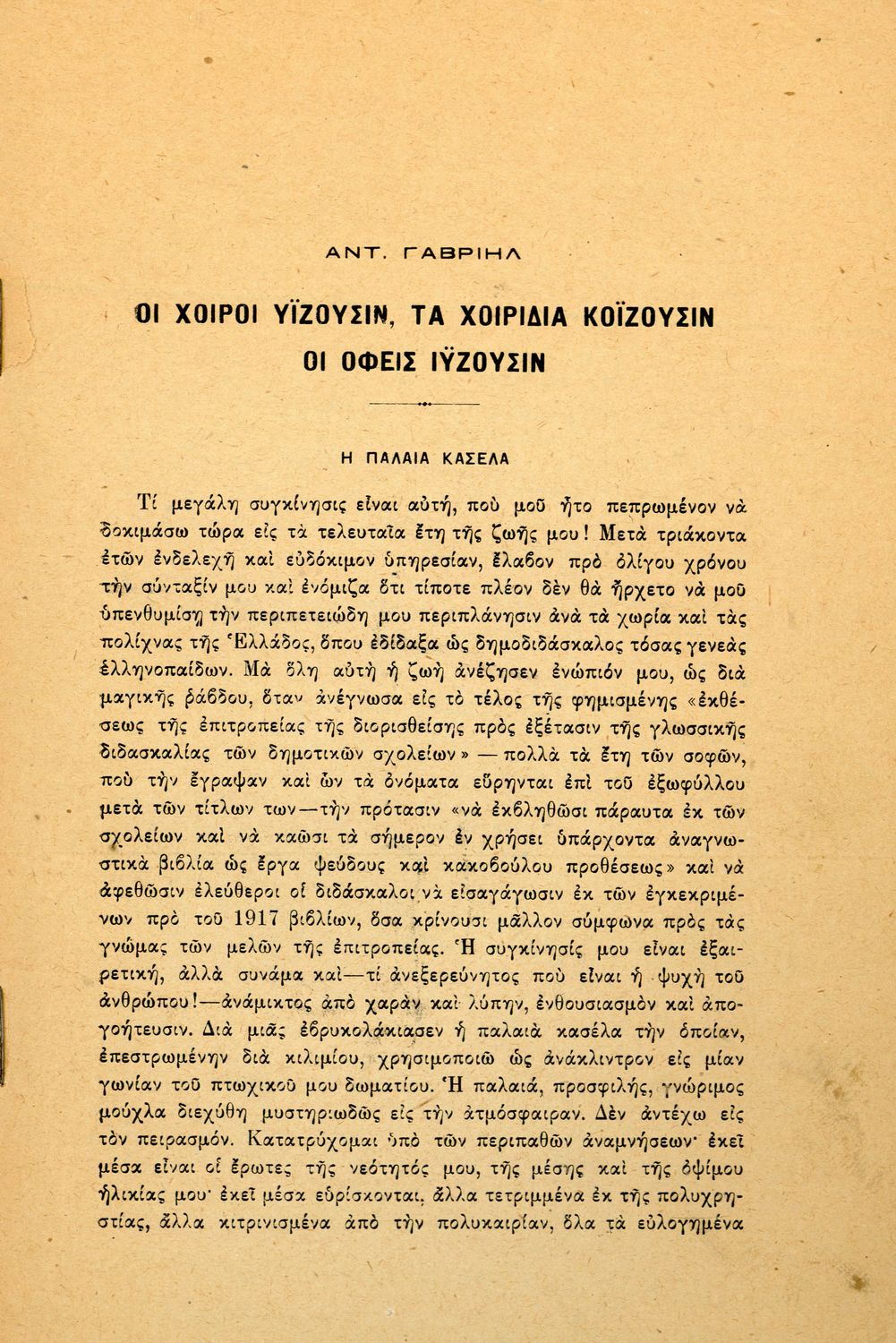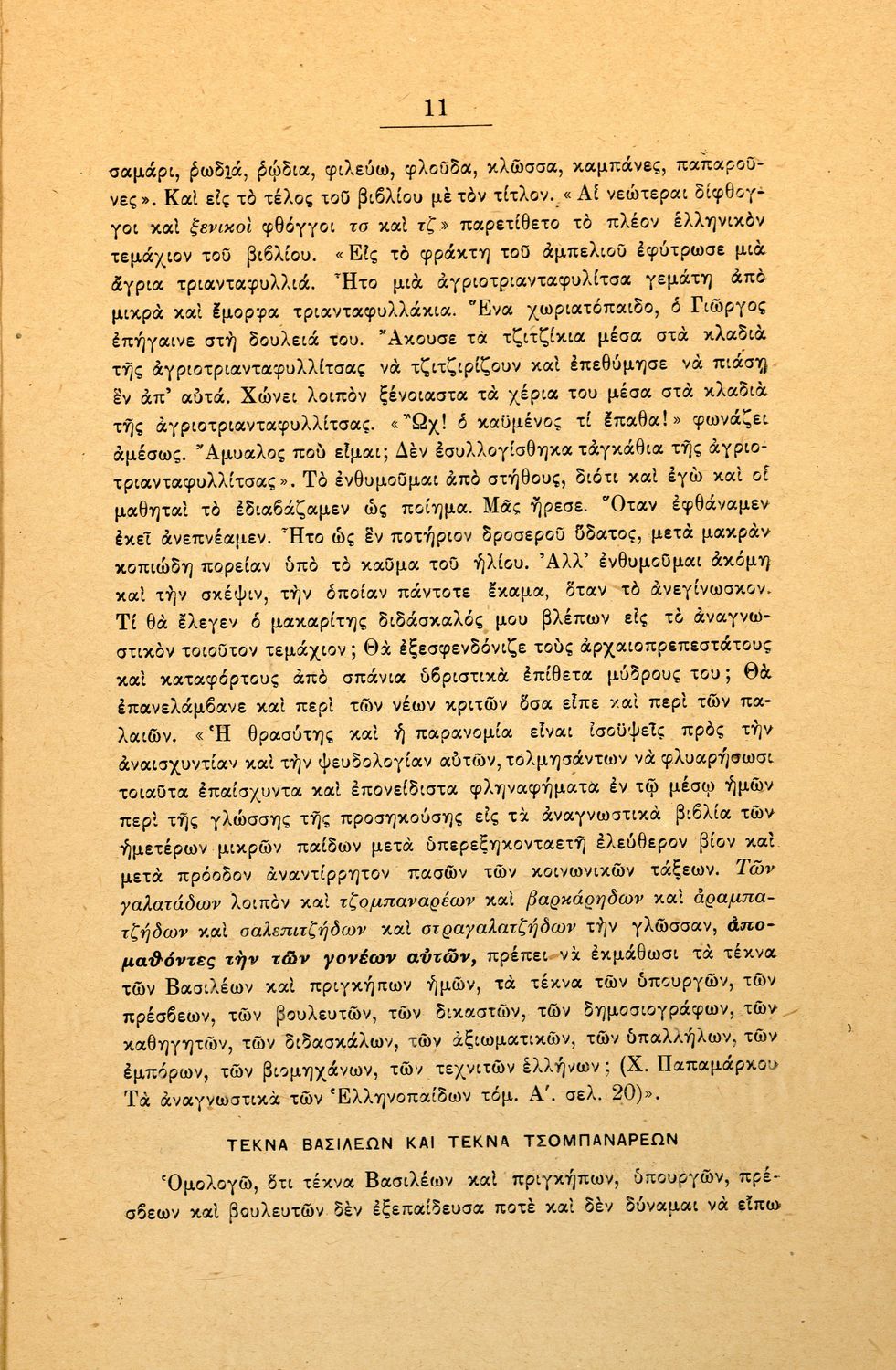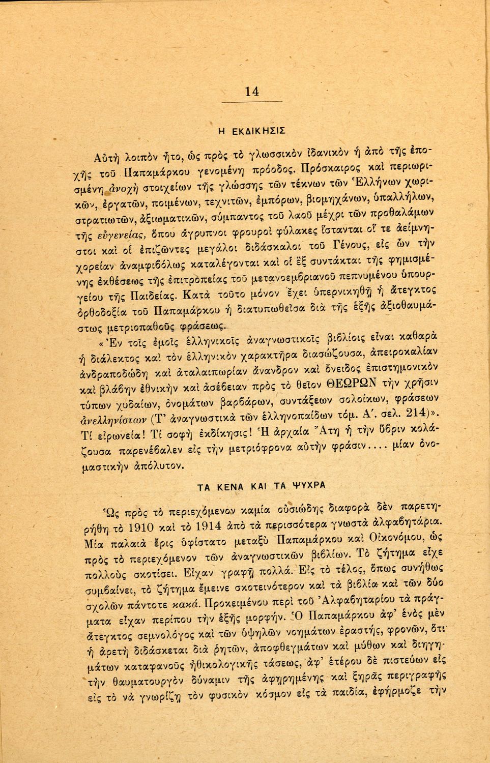 Κείμενο του Δ. Γληνού που, με σκωπτική διάθεση, αντιπαραβάλλει τα αναγνωστικά της πρώτης εκπαιδευτικής μεταρρύθμισης του Ε. Βενιζέλου όπως Τα ψηλά βουνά ή Το Αλφαβητάρι με τον ήλιο με αυτά της προηγούμενης ...