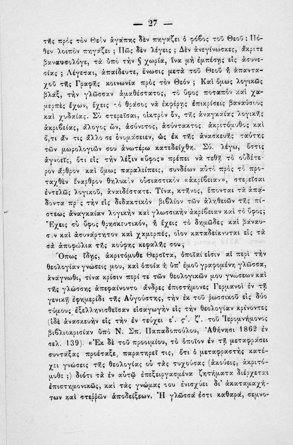 Τίτλος: Επίκρισις εις την προς το υπουργείον των εκκλησιαστικών κτλ. Έκθεσιν του εισηγητού Ν. Δαμαλά περί των εν τοις σχολείοις και γυμνασίοις διδακτικών βιβλίων των θρησκευτικών μαθημάτων