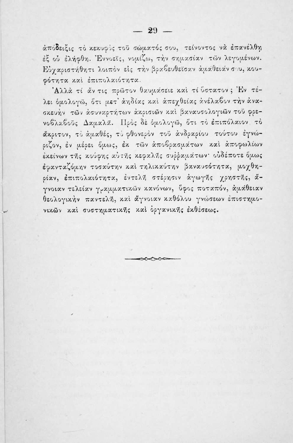 Παρουσίαση περιεχομένου: Σύγγραμμα που επιτίθεται στον Ν. Δαμαλά για την εισηγητική έκθεσή του με θέμα τον τρόπο διδασκαλίας και τα διδακτικά βιβλία των Θρησκευτικών της Μέσης Εκπαίδευσης.