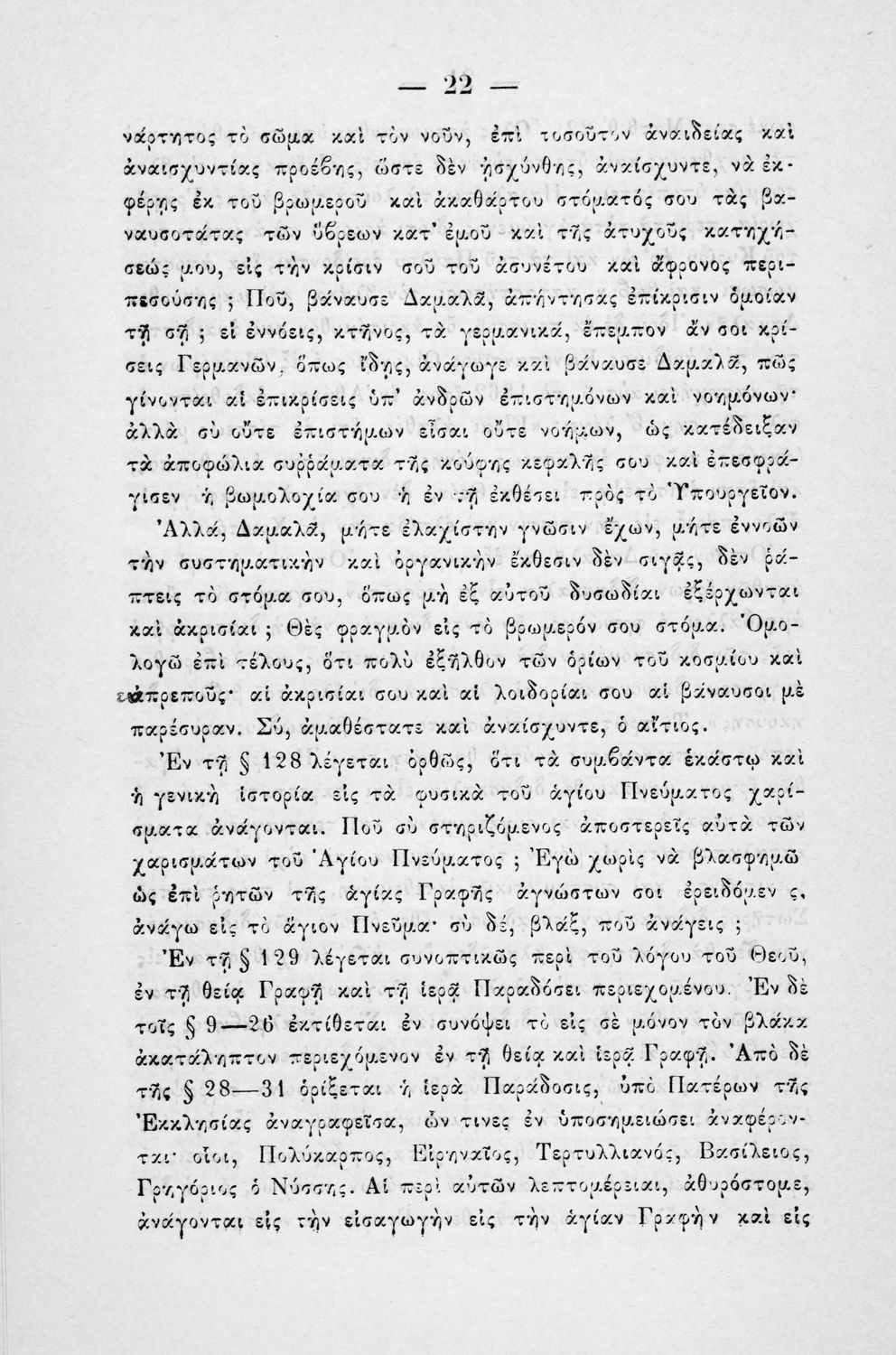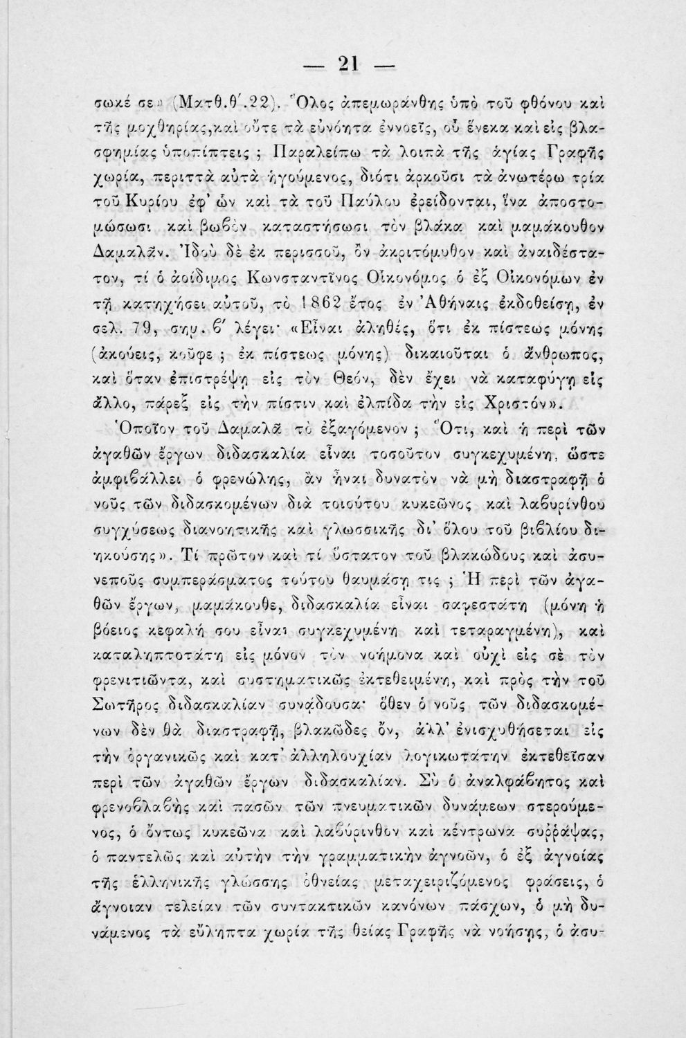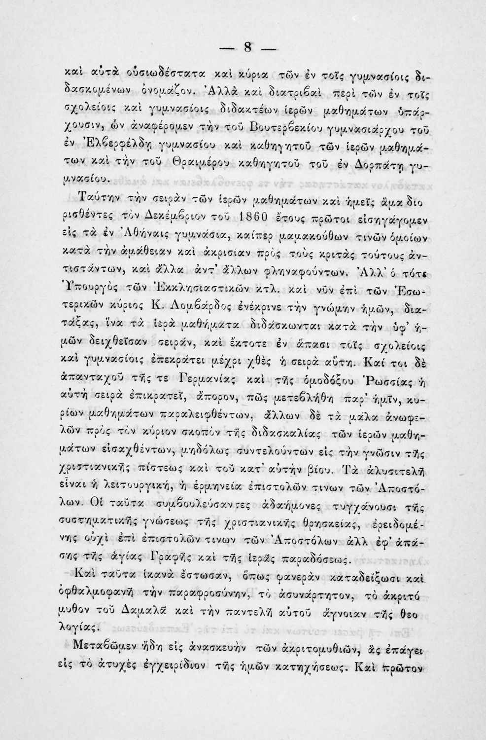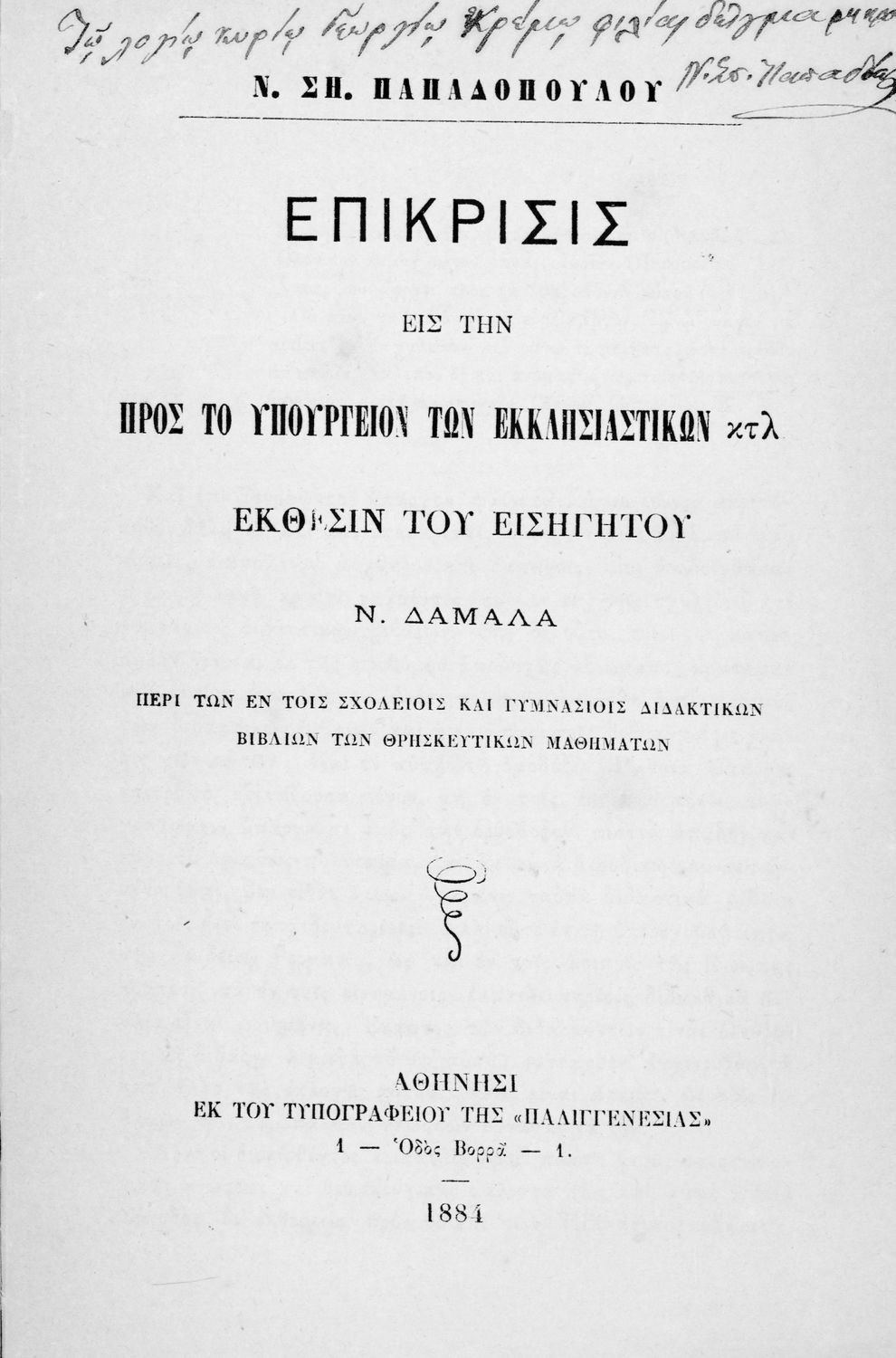Σύγγραμμα που επιτίθεται στον Ν. Δαμαλά για την εισηγητική έκθεσή του με θέμα τον τρόπο διδασκαλίας και τα διδακτικά βιβλία των Θρησκευτικών της Μέσης Εκπαίδευσης.