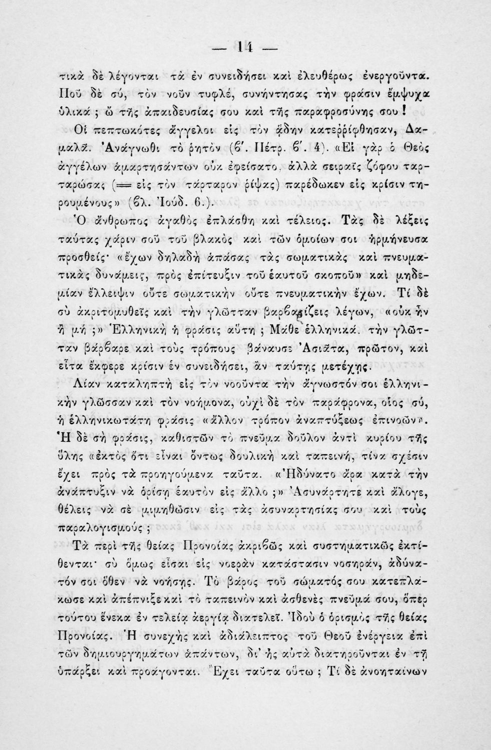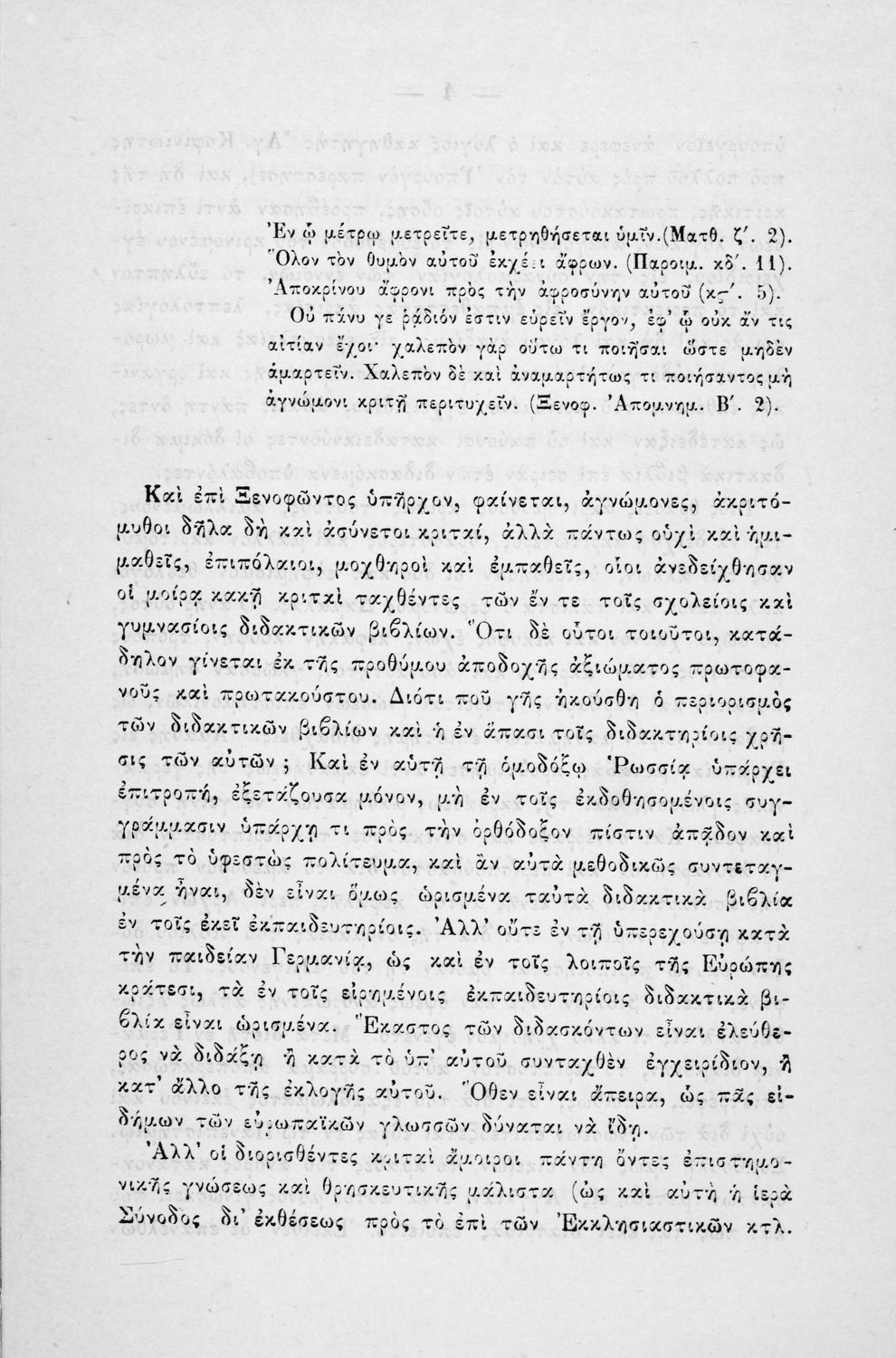 Βαθμίδα εκπαίδευσης: Δευτεροβάθμια Τάξη: Γυμνάσιο Μάθημα: Θρησκευτικά Γλώσσα: Καθαρεύουσα Παρουσίαση περιεχομένου: Σύγγραμμα που επιτίθεται στον Ν. Δαμαλά για την εισηγητική έκθεσή του με θέμα τον τρόπο διδασκαλίας και τα διδακτικά βιβλία των Θρησκευτικών της Μέσης Εκπαίδευσης. |