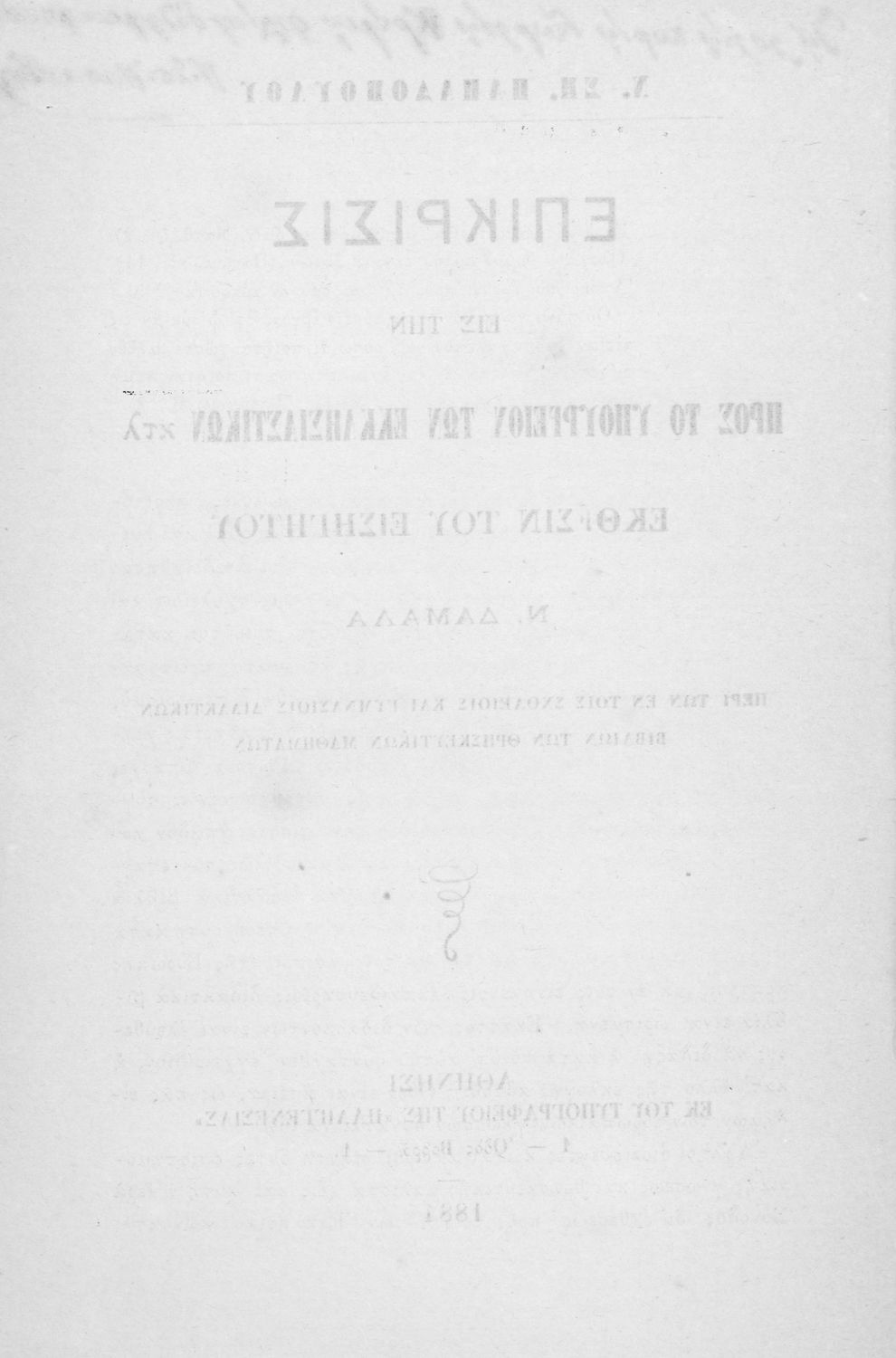 Εκδότης: Τυπογραφείο Παλιγγενεσία Έτος έκδοσης: 1885 Τόπος έκδοσης: Αθήνα |