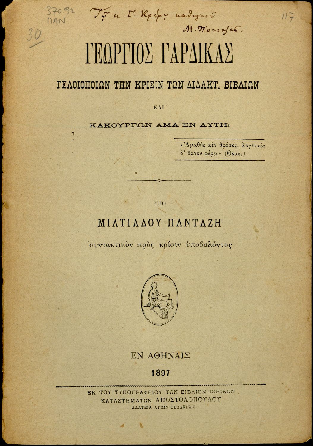 Γεώργιος Γαρδίκας Γελοιοποιών την κρίσιν των διδακτ. Βιβλίων και κακούργων άμα εν αυτή