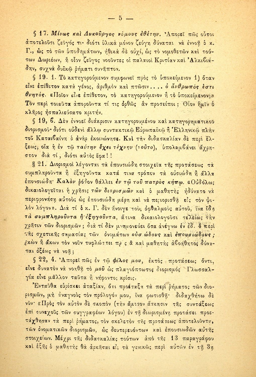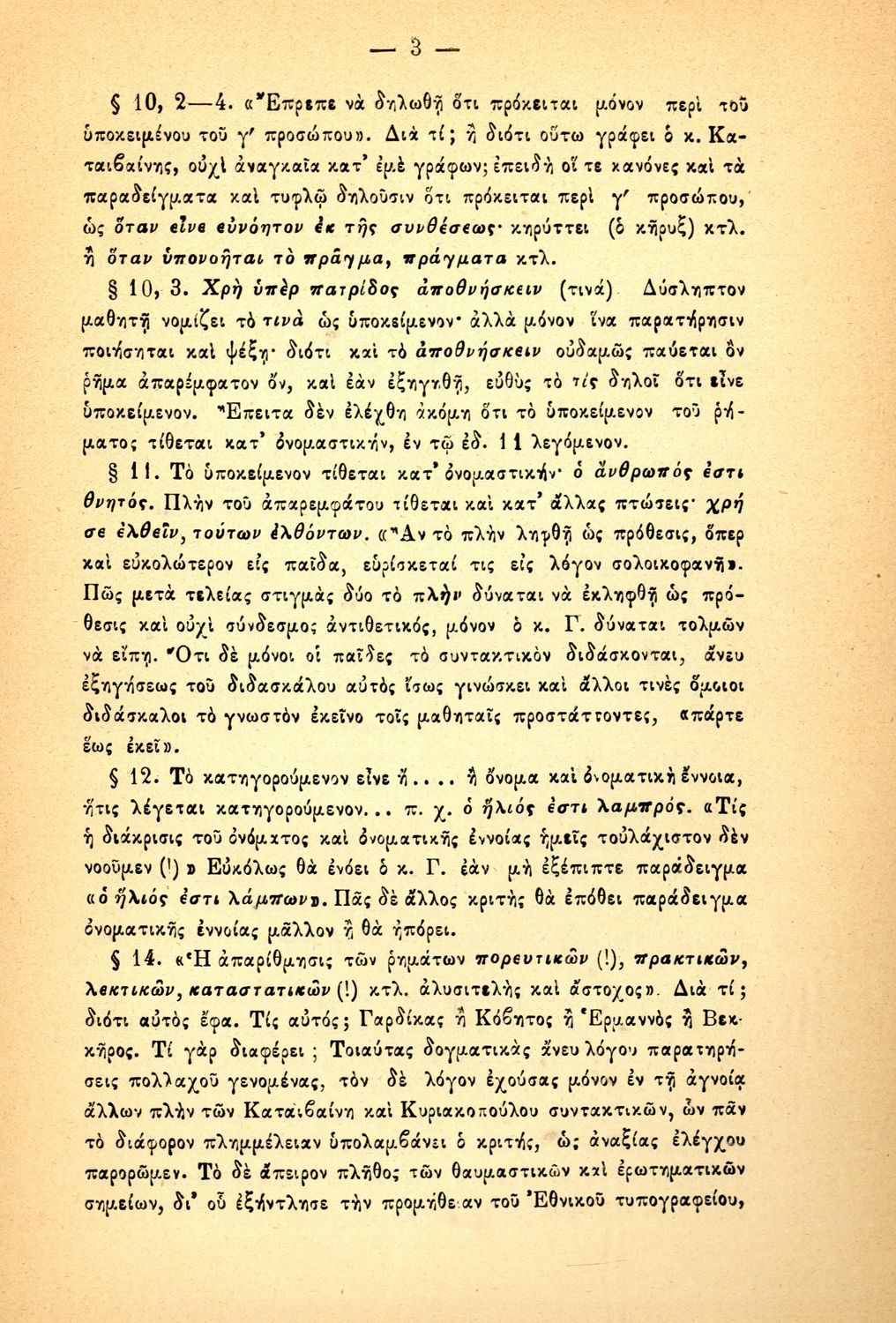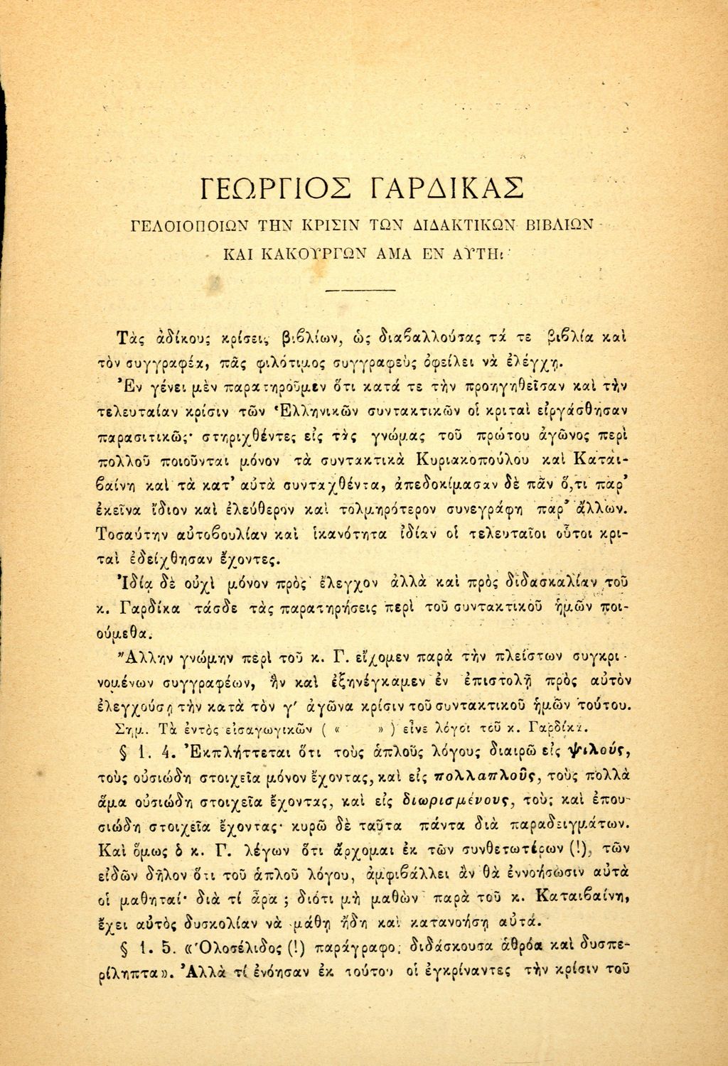 Παρουσίαση περιεχομένου: Σύγγραμμα του καθηγητή Φιλολογίας στο Πανεπιστήμιο Αθηνών Μιλτιάδη Πανταζή που ασκεί δριμεία κριτική στον Γεώργιο Γαρδίκα, επίσης καθηγητή της Ελληνικής Φιλολογίας στο Πανεπιστήμιο Αθηνών, λόγω της αρνητικής κρίσης που έλαβε το συντακτικό που κατέθεσε προς κρίση κατά των διαγωνισμό διδακτικών βιβλίων. Ο συγγραφέας δεν παραλείπει να κατακρίνει τον τρόπο που εγκρίνονται τα διδακτικά βιβλία και ορίζονται ως ακατάλληλα για διδασκαλία.