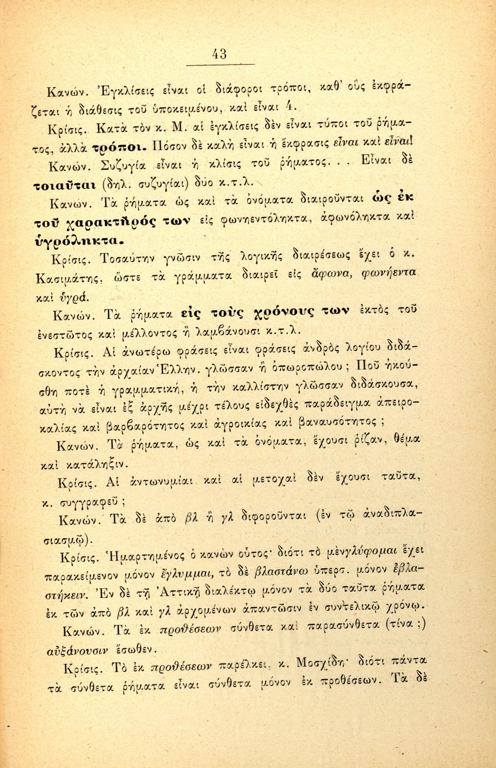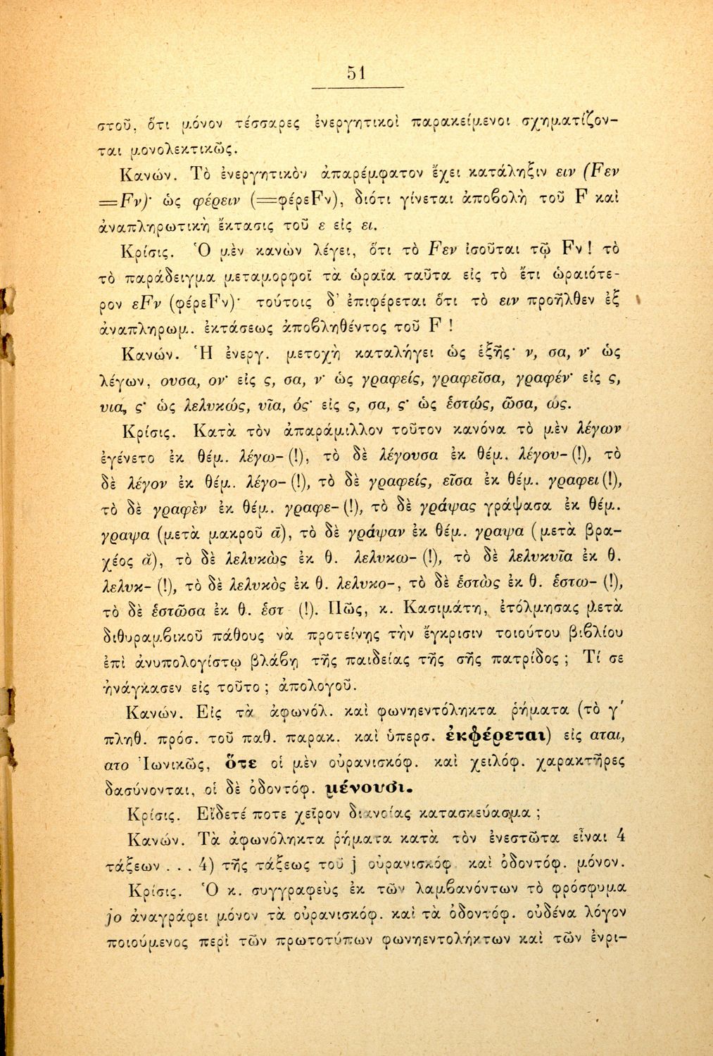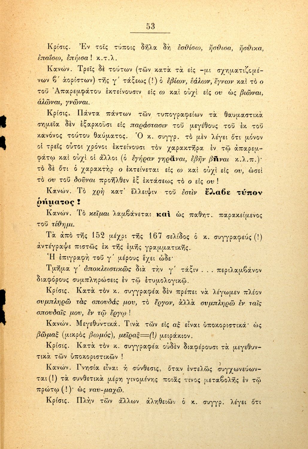 Γλώσσα: Καθαρεύουσα Παρουσίαση περιεχομένου: Σύγγραμμα που ασκεί δριμεία κριτική τόσο στην Ελληνική Γραμματική της Αττικής Διαλέκτου του Δημήτρη Μοσχίδη όσο και στην επιτροπή, υπό τον Κοσμά Κασιμάτη, που την ενέκρινε στον σχετικό διαγωνισμό του 1901. |