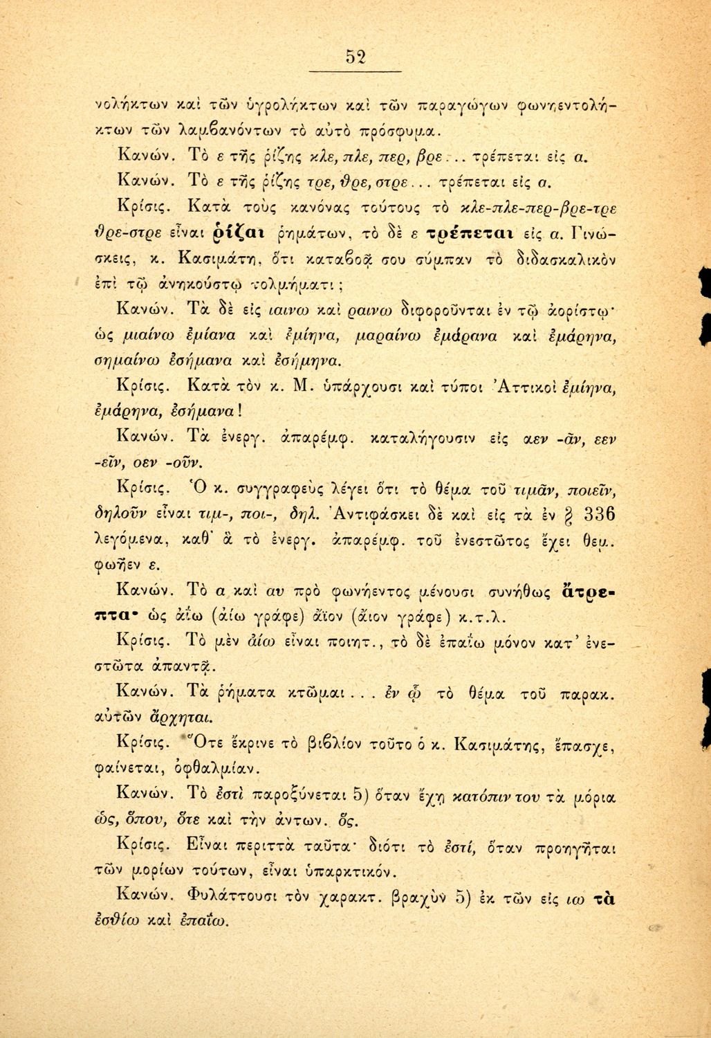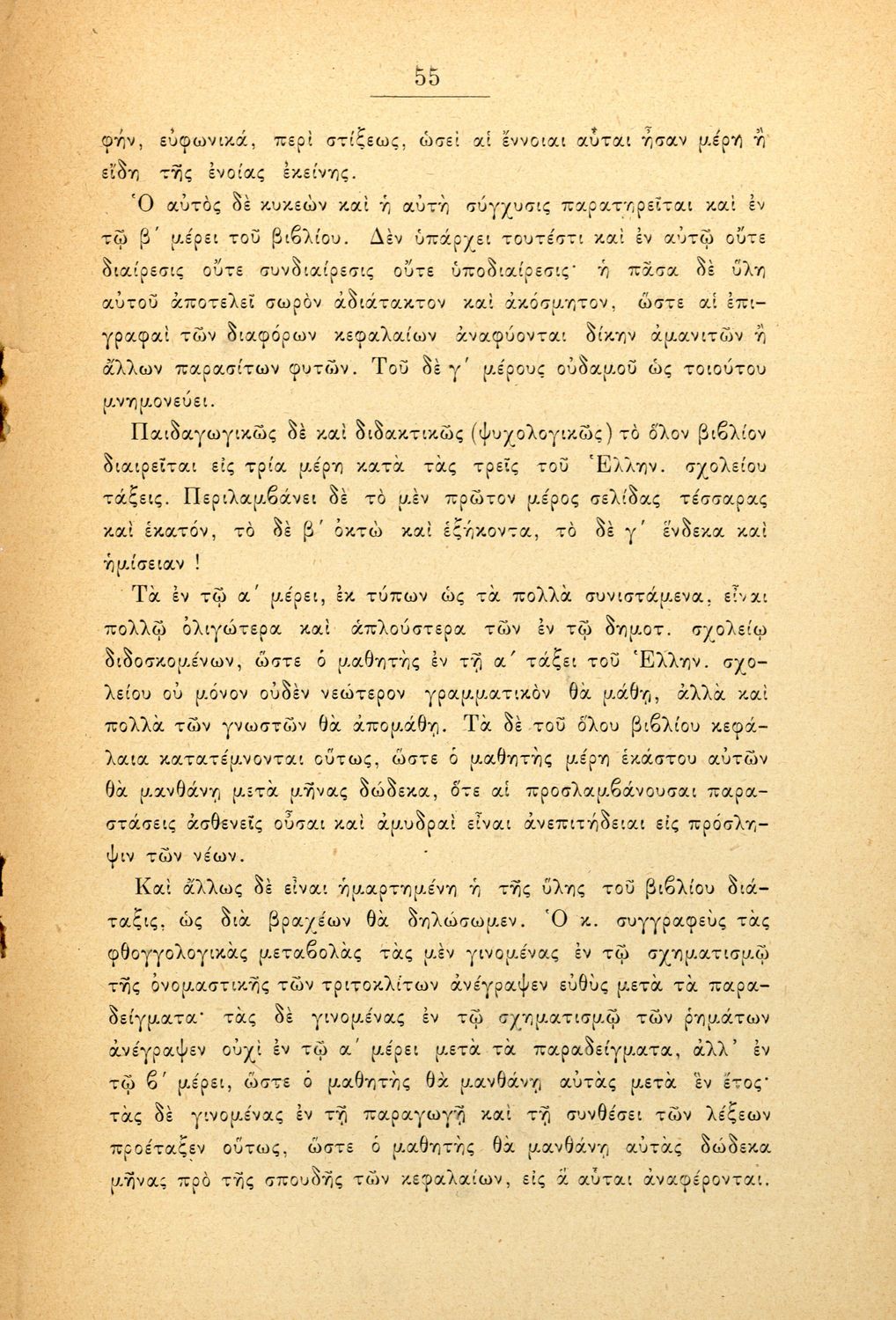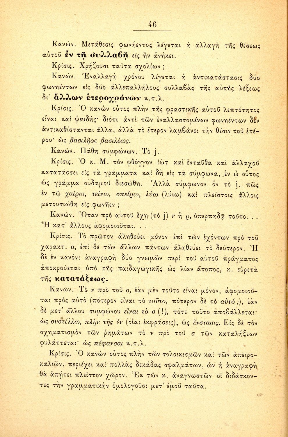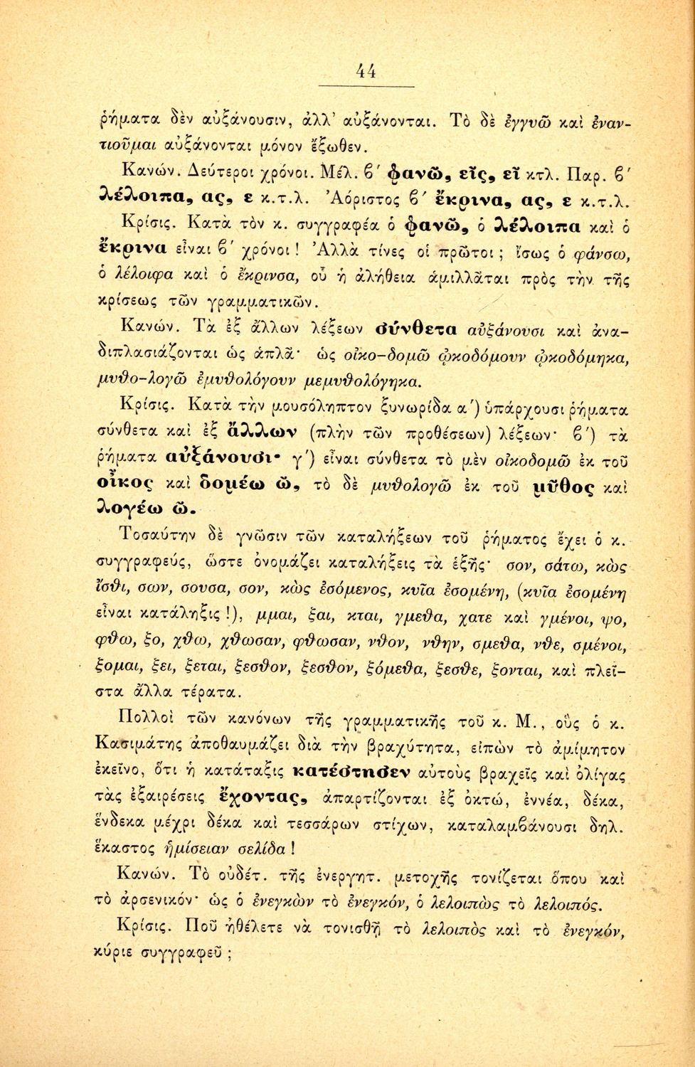 Γλώσσα: Καθαρεύουσα Παρουσίαση περιεχομένου: Σύγγραμμα που ασκεί δριμεία κριτική τόσο στην Ελληνική Γραμματική της Αττικής Διαλέκτου του Δημήτρη Μοσχίδη όσο και στην επιτροπή, υπό τον Κοσμά Κασιμάτη, που την ενέκρινε στον σχετικό διαγωνισμό του 1901. |