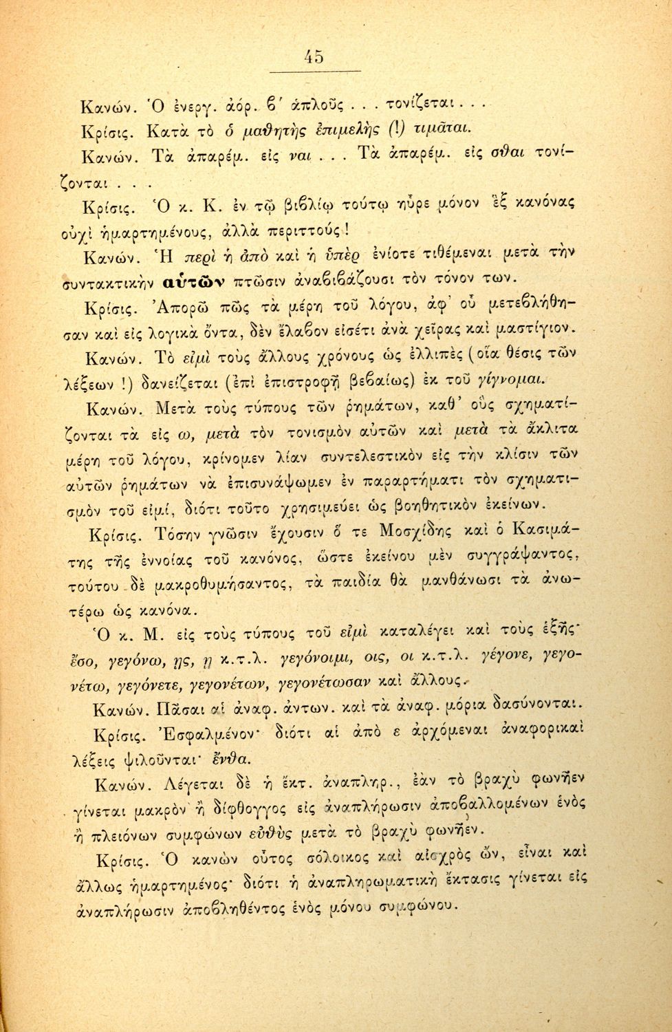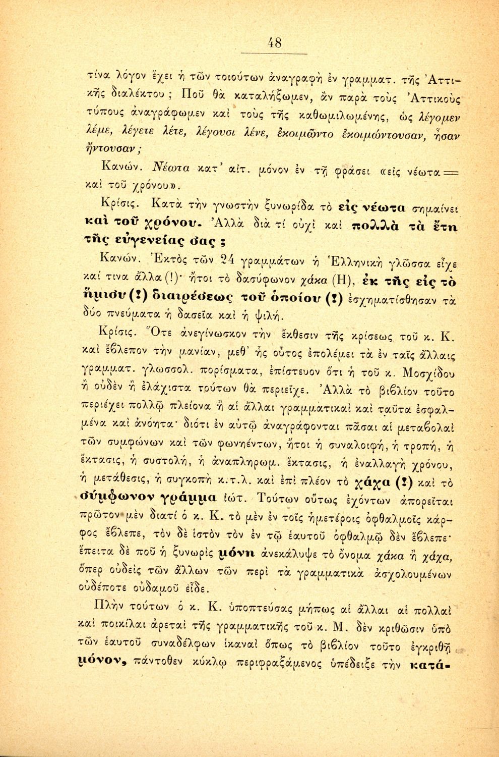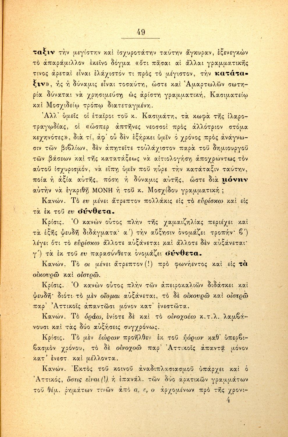 Σύγγραμμα που ασκεί δριμεία κριτική τόσο στην Ελληνική Γραμματική της Αττικής Διαλέκτου του Δημήτρη Μοσχίδη όσο και στην επιτροπή, υπό τον Κοσμά Κασιμάτη, που την ενέκρινε στον σχετικό διαγωνισμό του 1901.