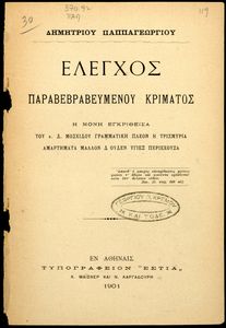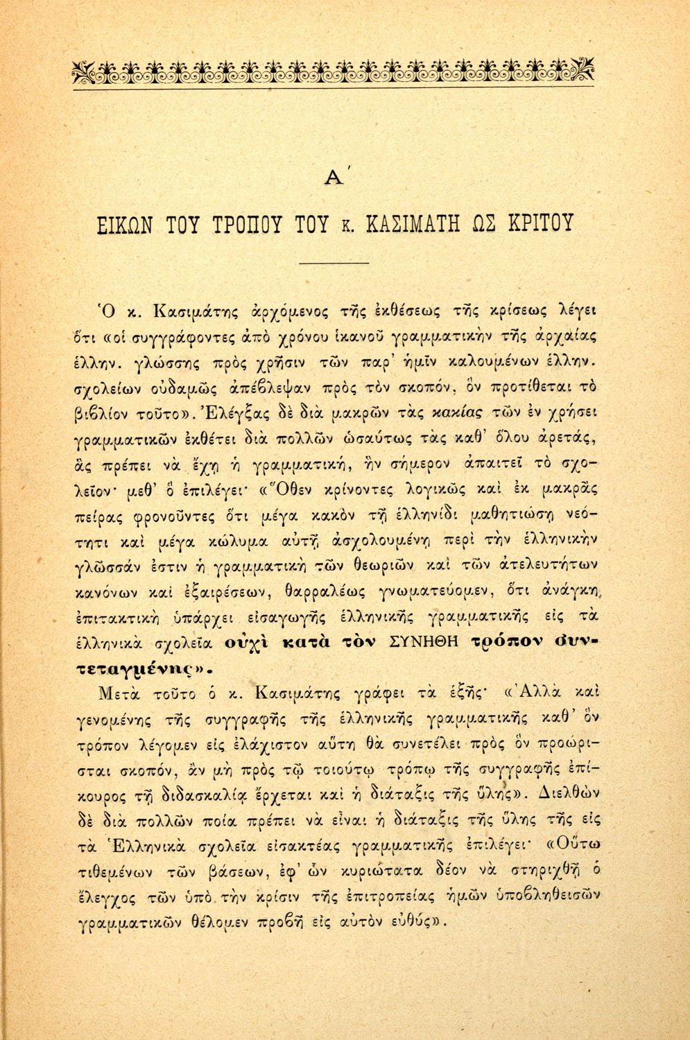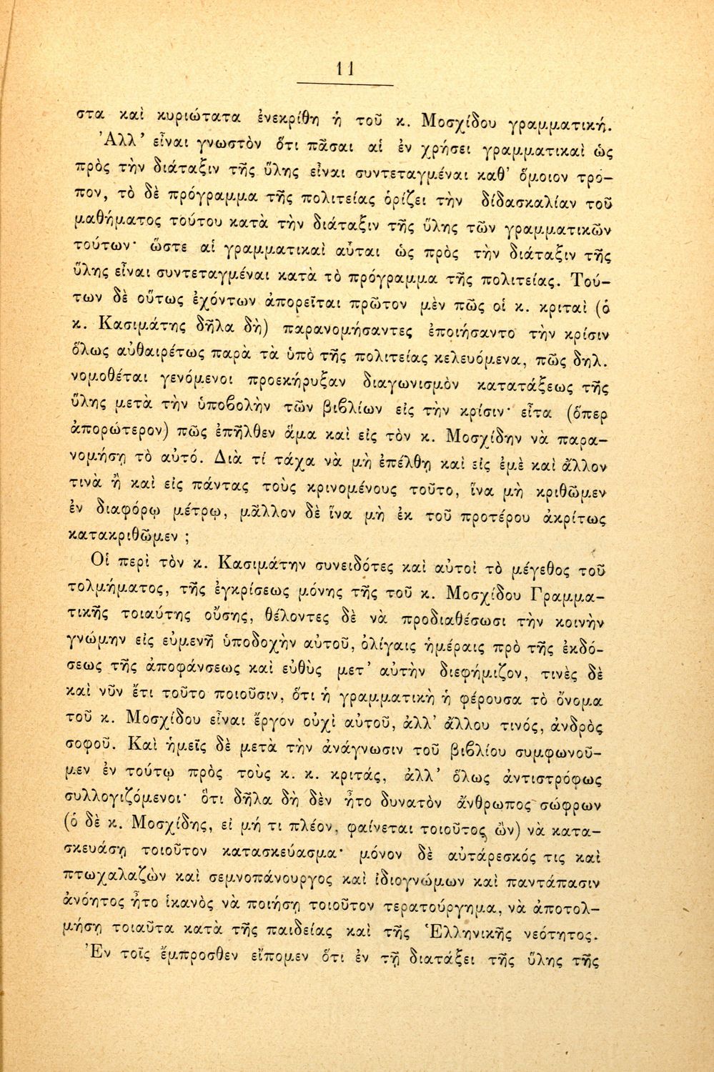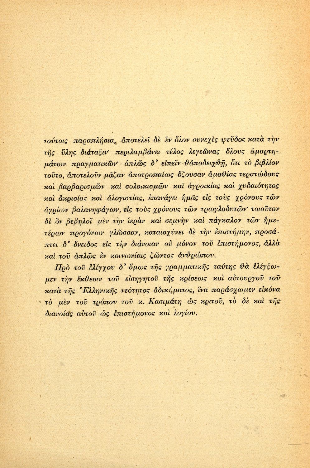 Γλώσσα: Καθαρεύουσα Παρουσίαση περιεχομένου: Σύγγραμμα που ασκεί δριμεία κριτική τόσο στην Ελληνική Γραμματική της Αττικής Διαλέκτου του Δημήτρη Μοσχίδη όσο και στην επιτροπή, υπό τον Κοσμά Κασιμάτη, που την ενέκρινε στον σχετικό διαγωνισμό του 1901. |