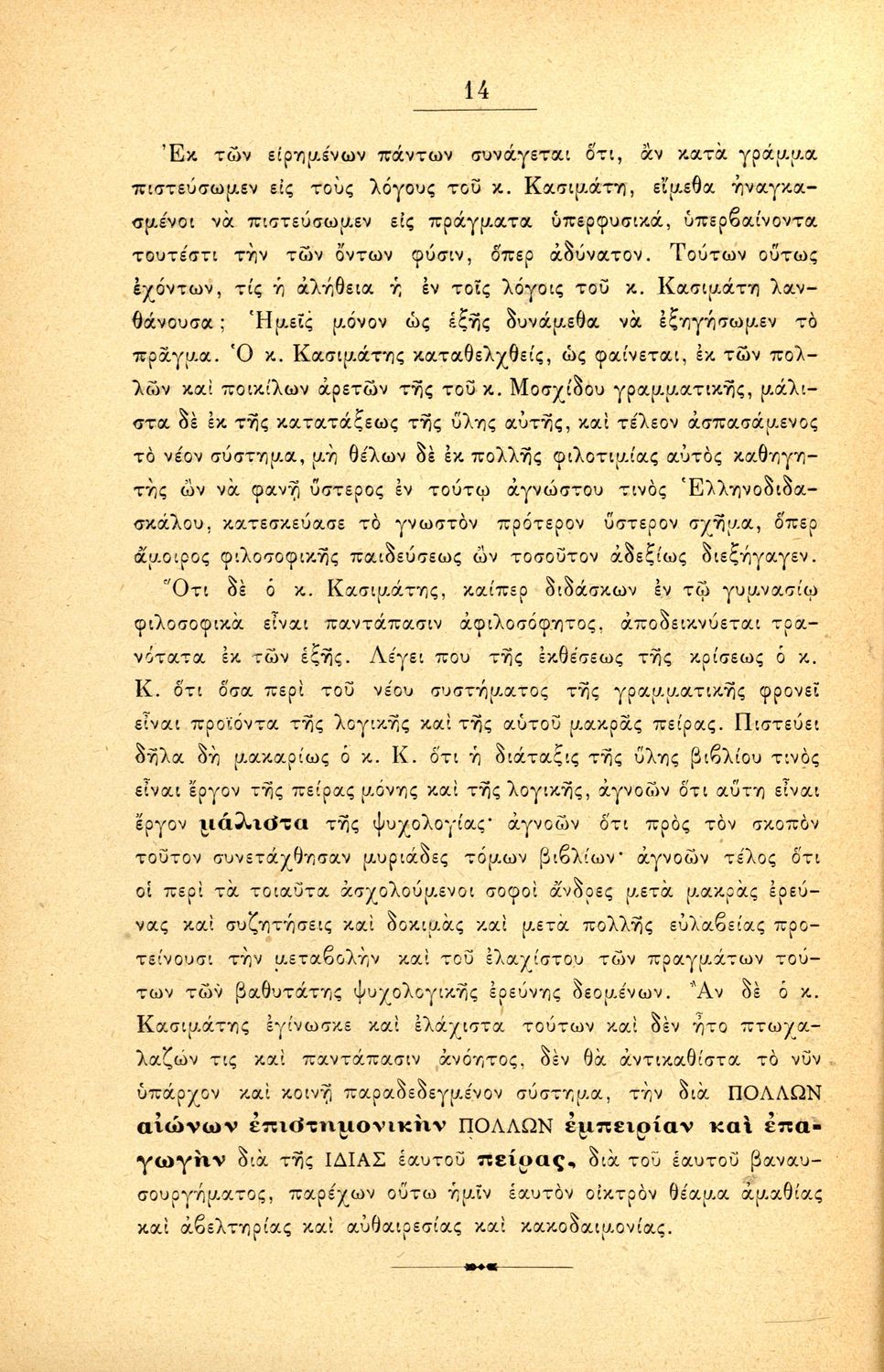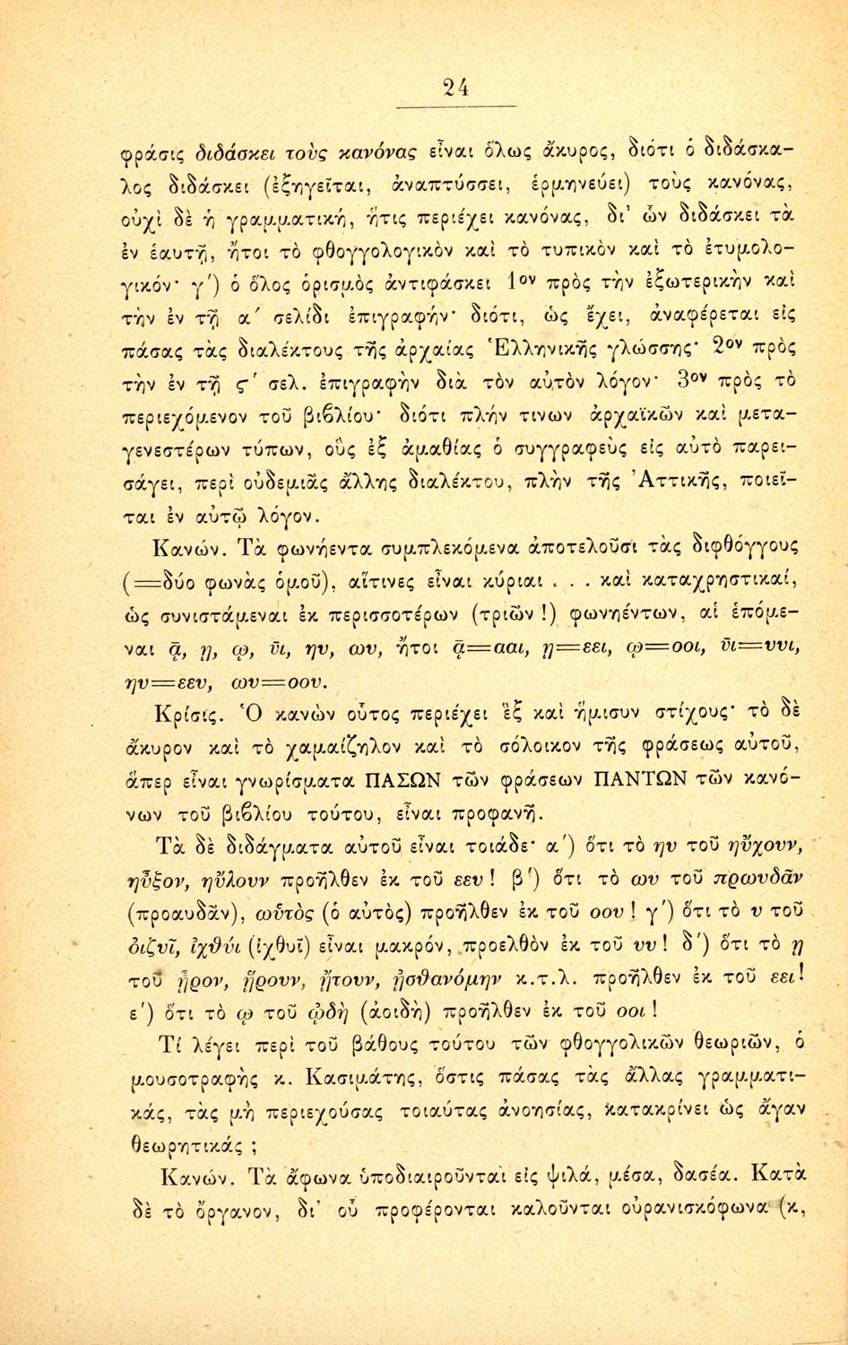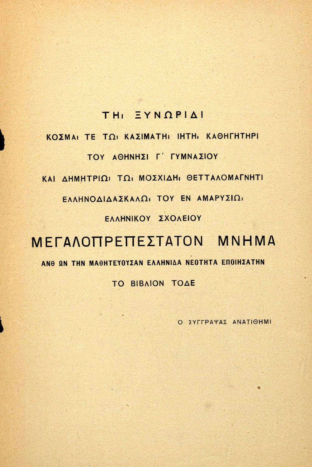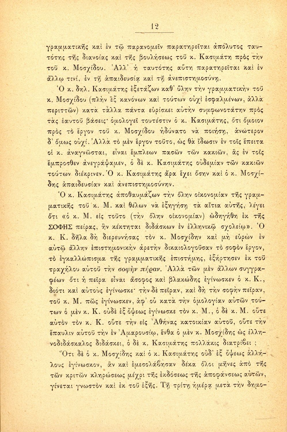 Γλώσσα: Καθαρεύουσα Παρουσίαση περιεχομένου: Σύγγραμμα που ασκεί δριμεία κριτική τόσο στην Ελληνική Γραμματική της Αττικής Διαλέκτου του Δημήτρη Μοσχίδη όσο και στην επιτροπή, υπό τον Κοσμά Κασιμάτη, που την ενέκρινε στον σχετικό διαγωνισμό του 1901. |