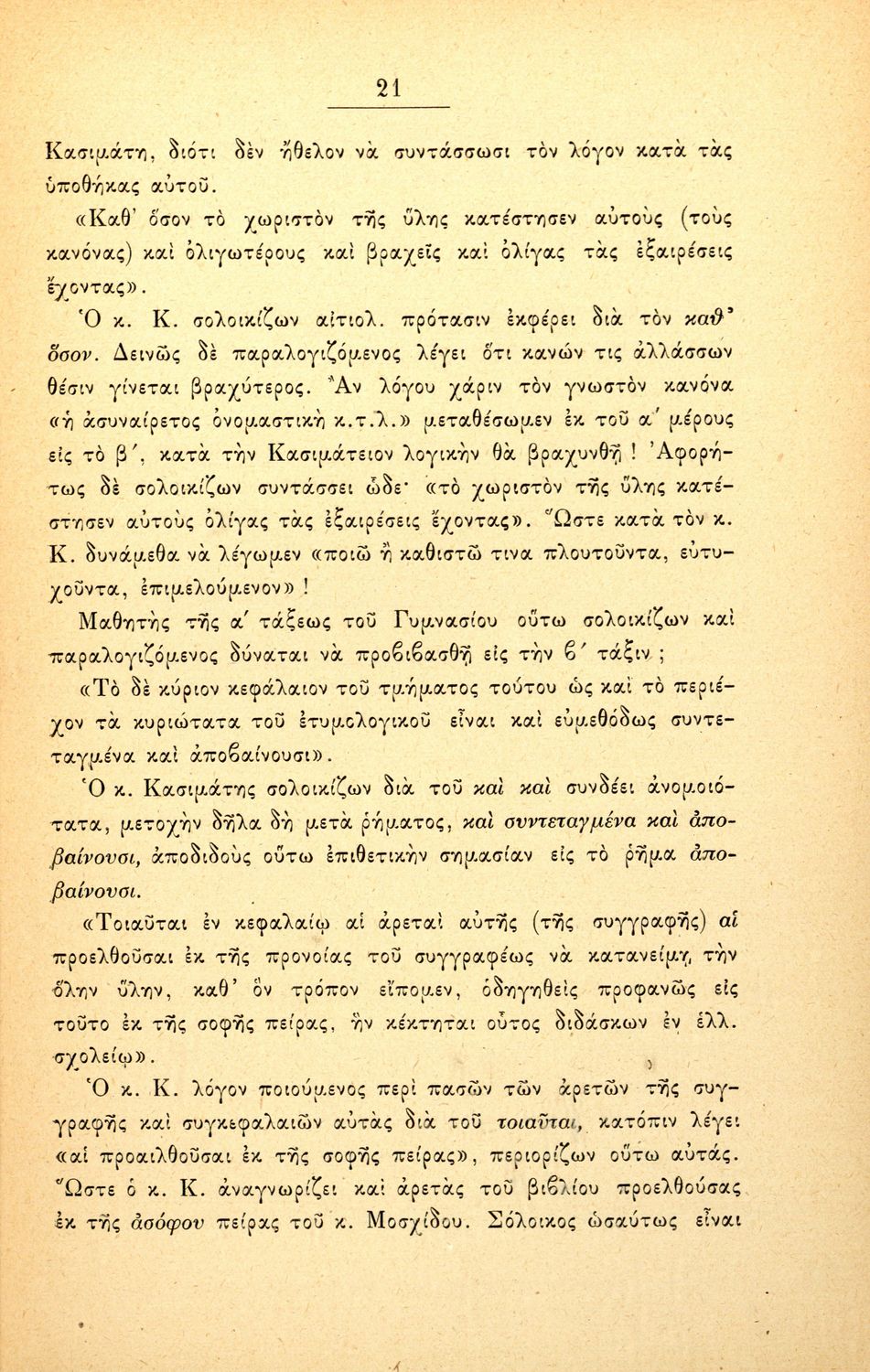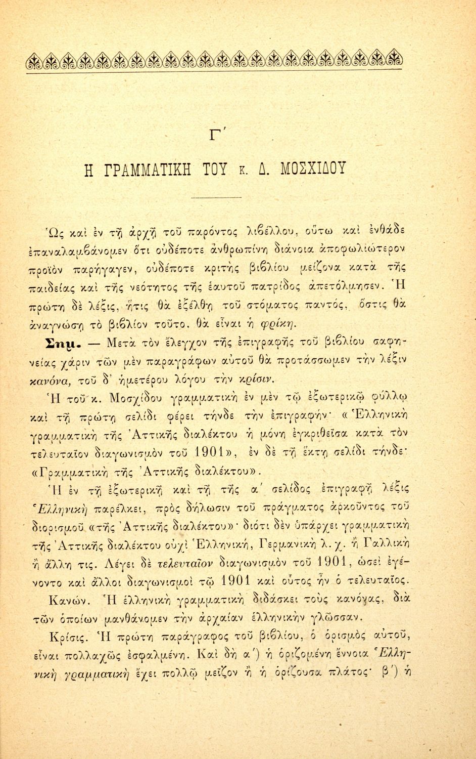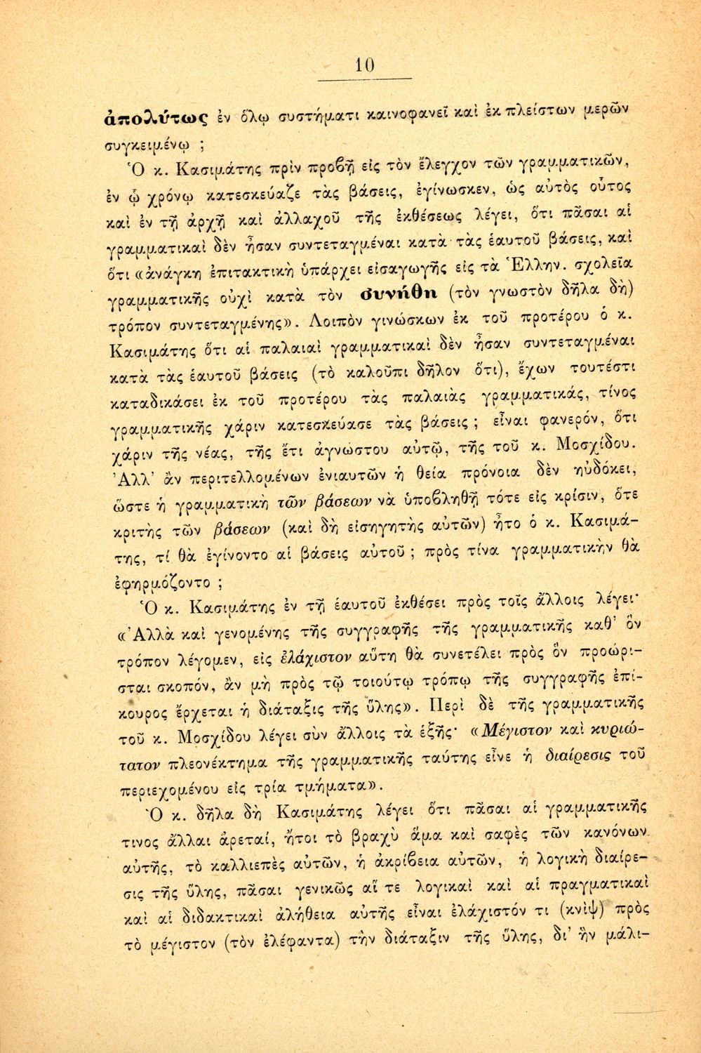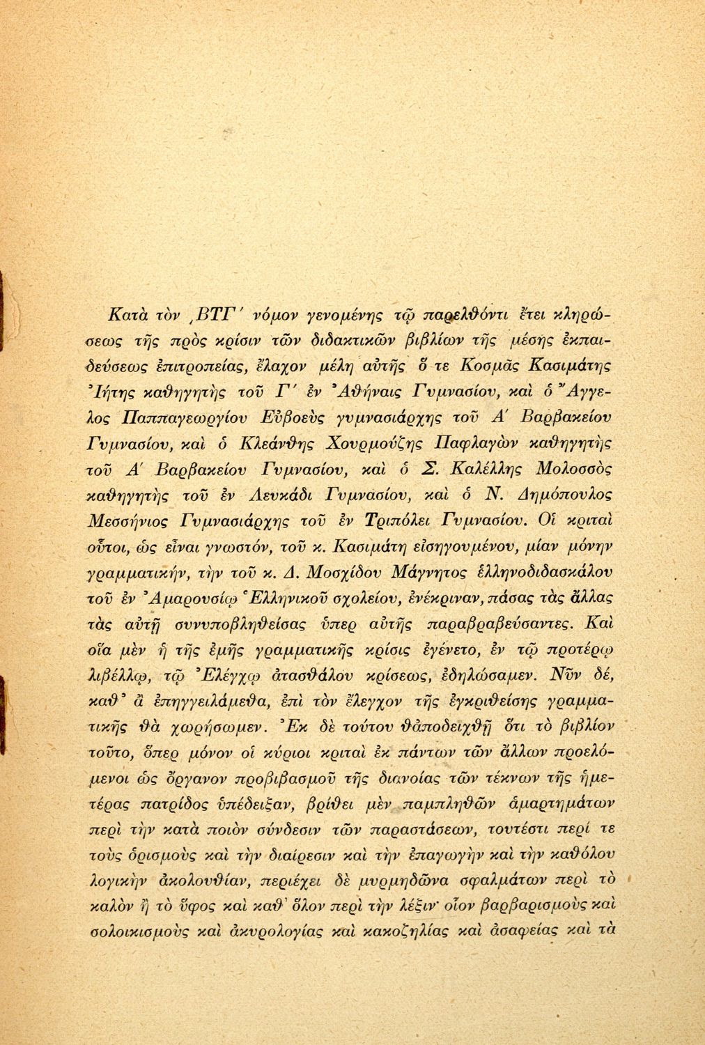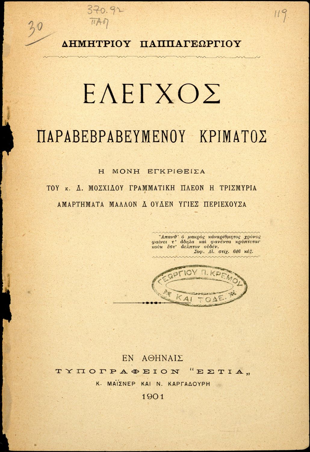 Σύγγραμμα που ασκεί δριμεία κριτική τόσο στην Ελληνική Γραμματική της Αττικής Διαλέκτου του Δημήτρη Μοσχίδη όσο και στην επιτροπή, υπό τον Κοσμά Κασιμάτη, που την ενέκρινε στον σχετικό διαγωνισμό του 1901.