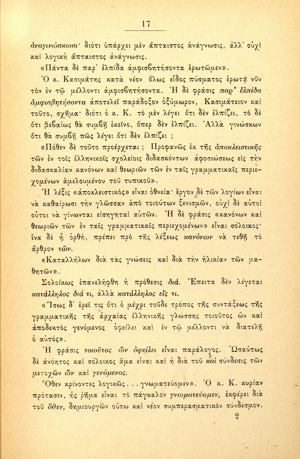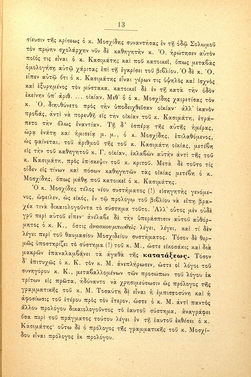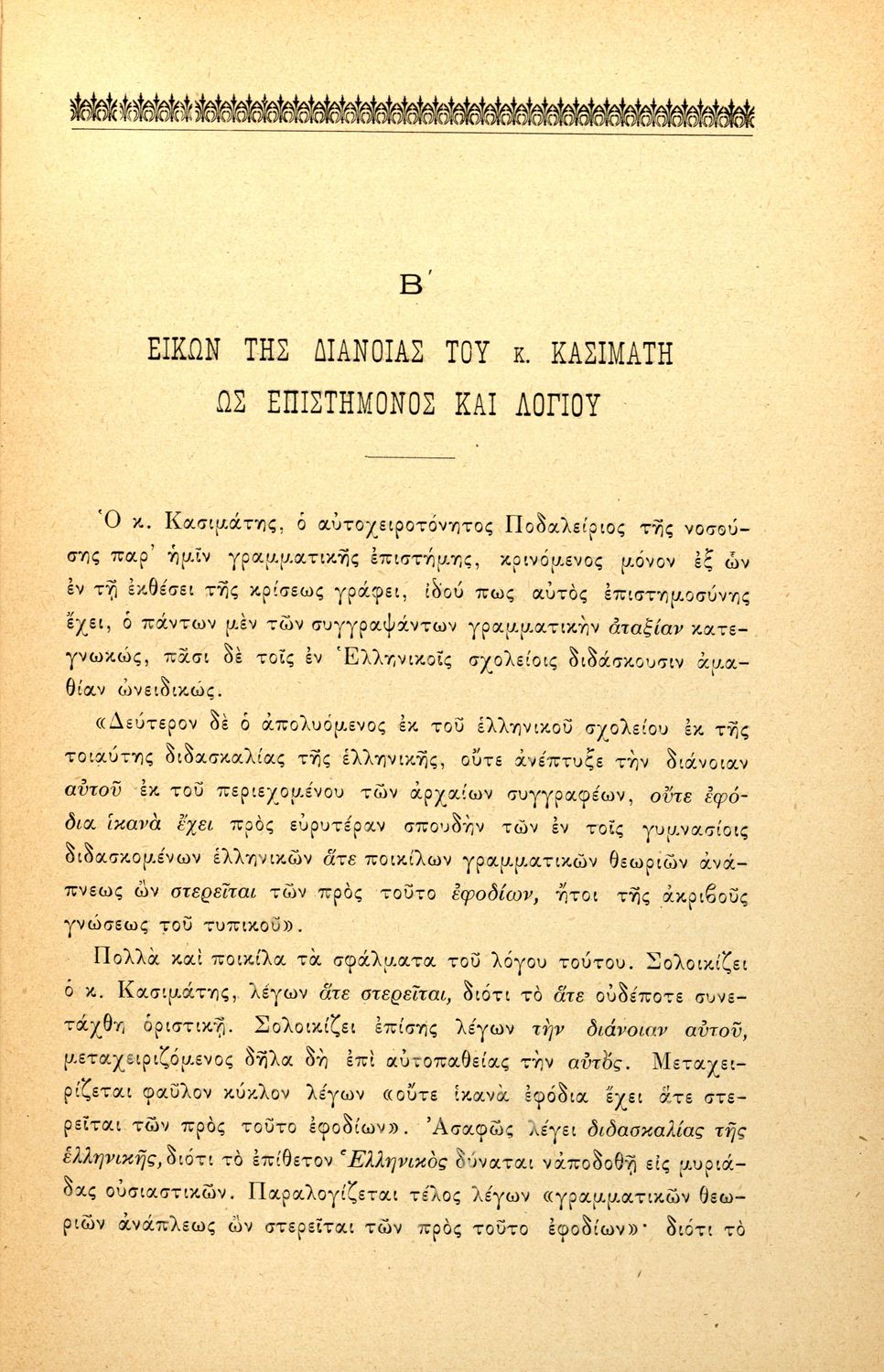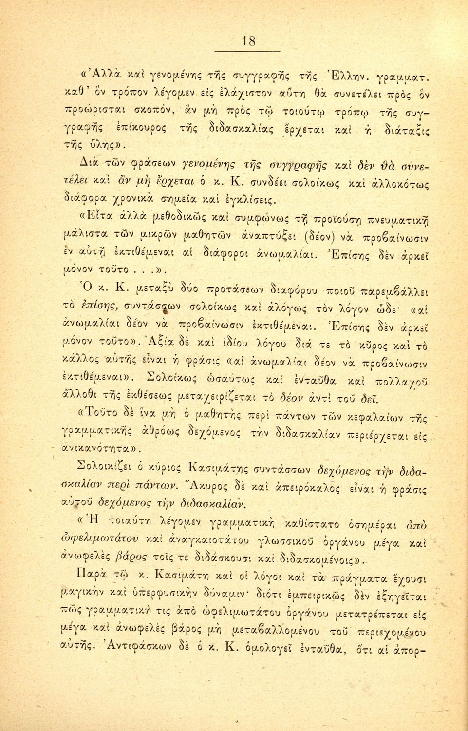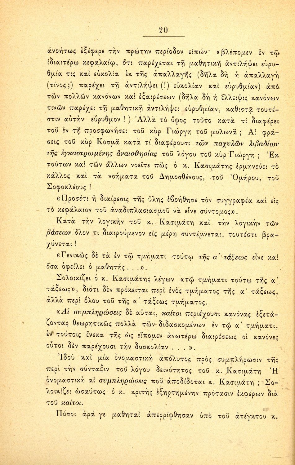 Σύγγραμμα που ασκεί δριμεία κριτική τόσο στην Ελληνική Γραμματική της Αττικής Διαλέκτου του Δημήτρη Μοσχίδη όσο και στην επιτροπή, υπό τον Κοσμά Κασιμάτη, που την ενέκρινε στον σχετικό διαγωνισμό του 1901.