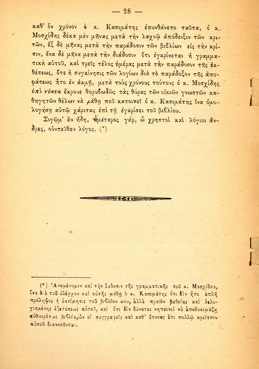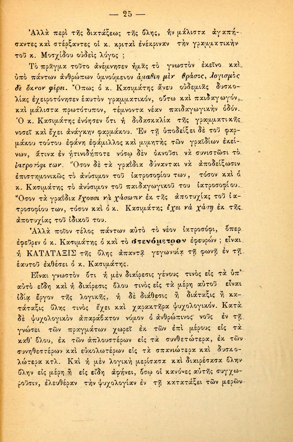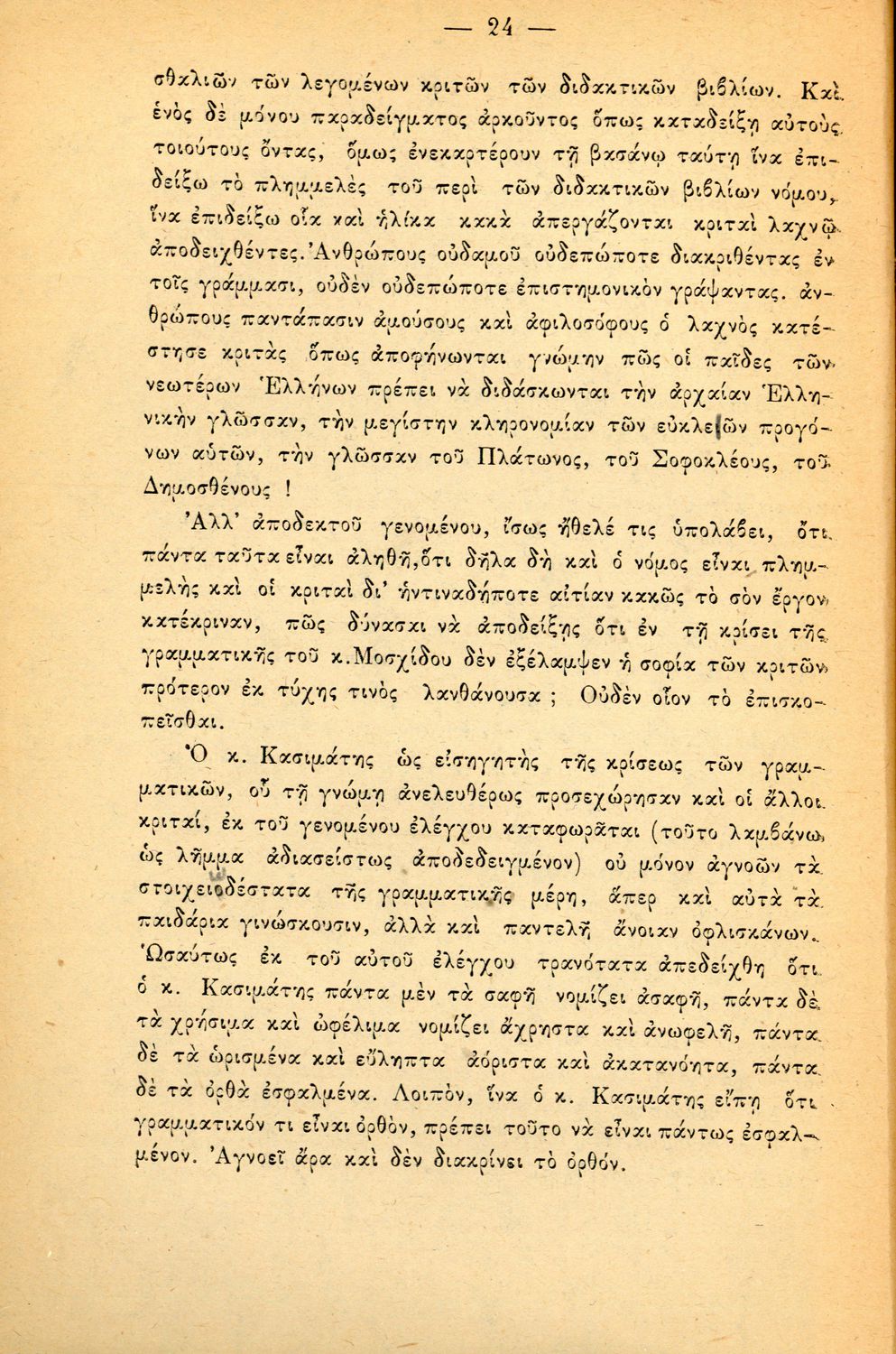 Γλώσσα: Καθαρεύουσα Παρουσίαση περιεχομένου: Σύγγραμμα που ασκεί δριμεία κριτική στην επιτροπή για τα διδακτικά βιβλία υπό τον Κοσμά Κασιμάτη για την απόρριψη της γραμματικής που ο συγγραφέας είχε υποβάλει προς κρίση. Ο συγγραφέας δεν παραλείπει να σχολιάσει και την Ελληνική Γραμματική της Αττικής Διαλέκτου του Δημήτρη Μοσχίδη που είχε λάβει τη σχετική έγκριση στο διαγωνισμό του 1901. |