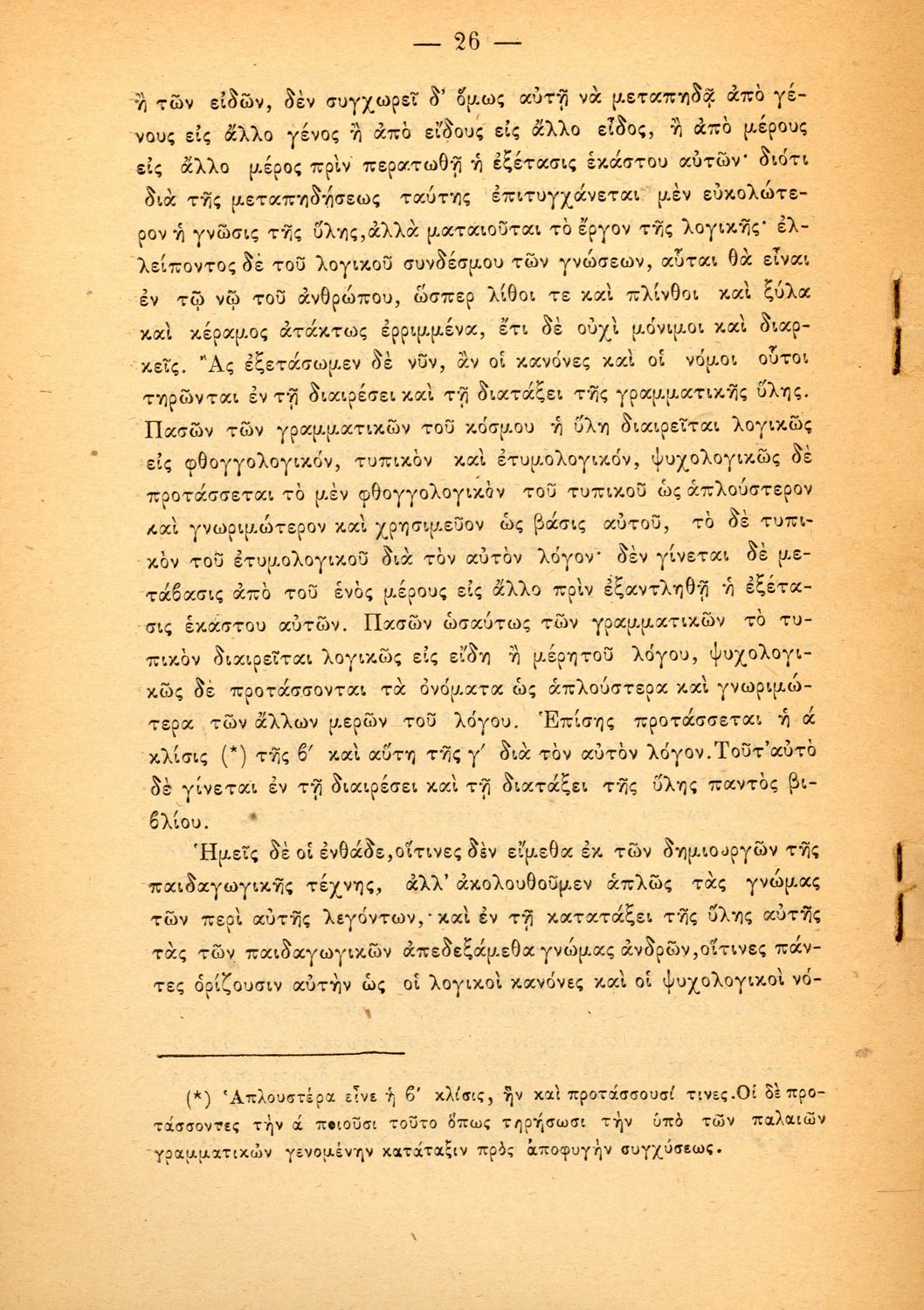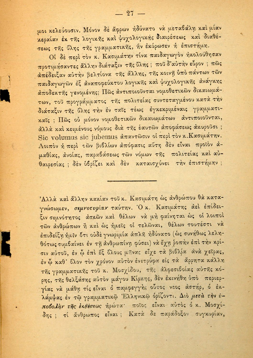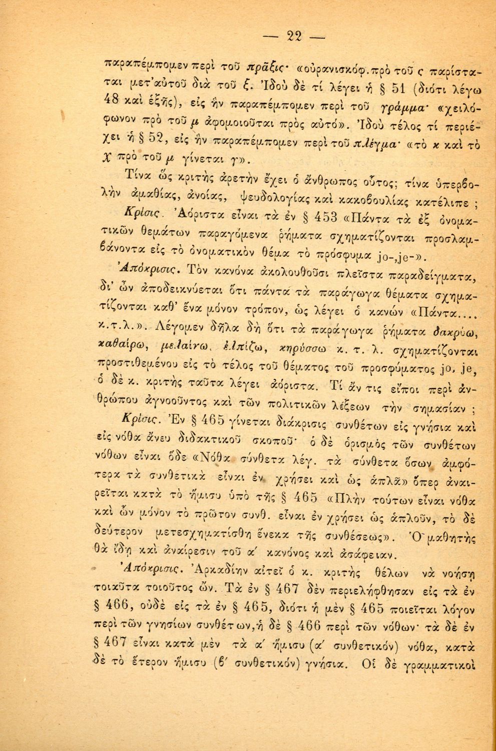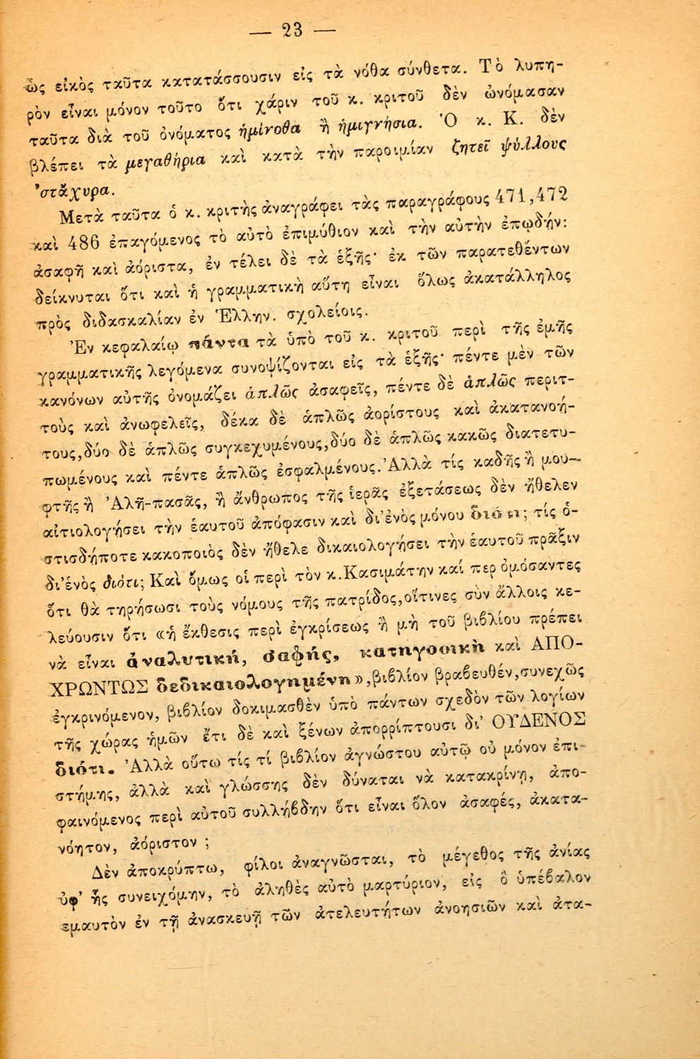 Γλώσσα: Καθαρεύουσα Παρουσίαση περιεχομένου: Σύγγραμμα που ασκεί δριμεία κριτική στην επιτροπή για τα διδακτικά βιβλία υπό τον Κοσμά Κασιμάτη για την απόρριψη της γραμματικής που ο συγγραφέας είχε υποβάλει προς κρίση. Ο συγγραφέας δεν παραλείπει να σχολιάσει και την Ελληνική Γραμματική της Αττικής Διαλέκτου του Δημήτρη Μοσχίδη που είχε λάβει τη σχετική έγκριση στο διαγωνισμό του 1901. |