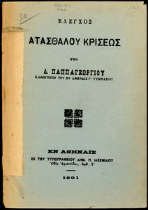 Κωδικός αναγνώρισης: 20-00121 Τίτλος: Έλεγχος ατασθάλου κρίσεως Συγγραφέας: Δημήτριος Παππαγεωργίου Μέγεθος και υπόστρωμα: Άλλο, 19εκ., μαλακό εξώφυλλο, 32 σελίδες. |