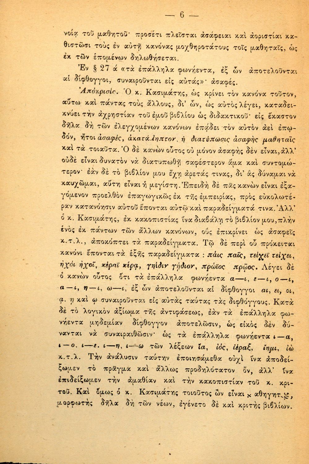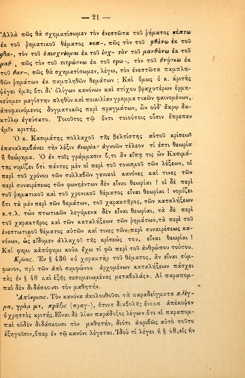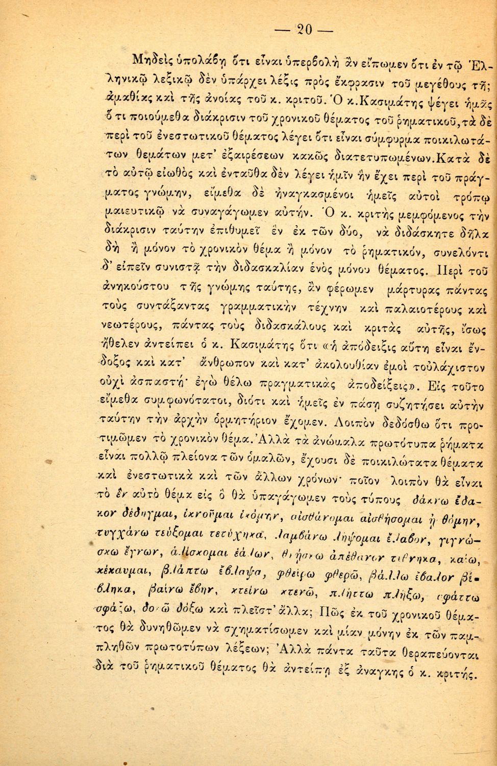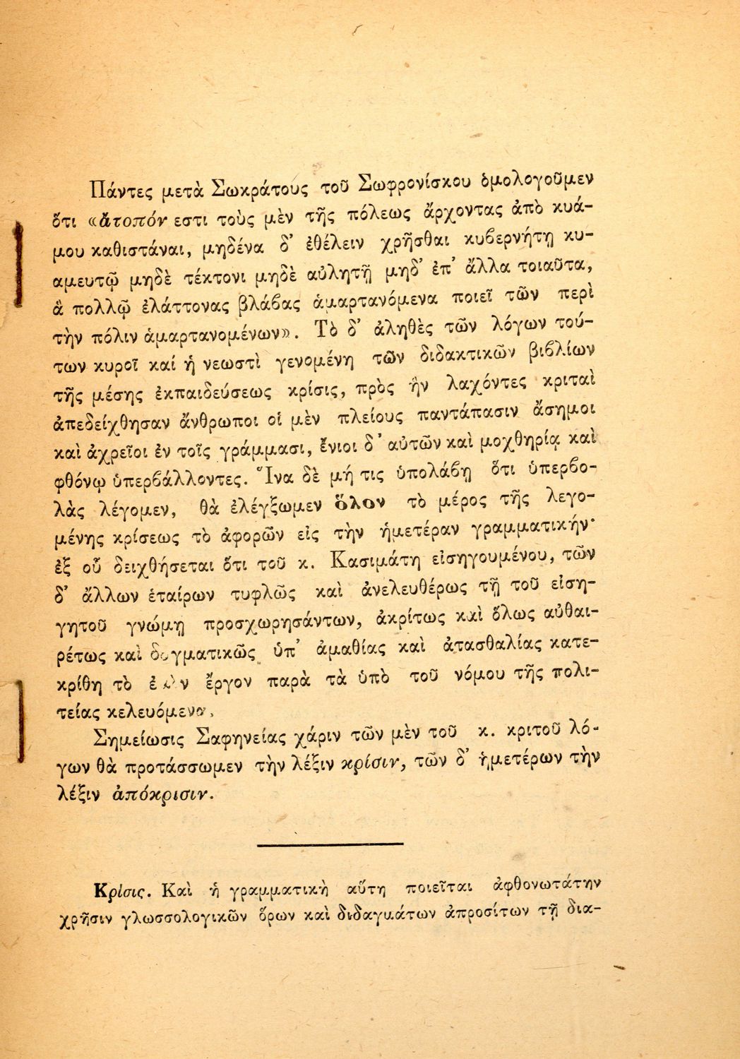 Γλώσσα: Καθαρεύουσα Παρουσίαση περιεχομένου: Σύγγραμμα που ασκεί δριμεία κριτική στην επιτροπή για τα διδακτικά βιβλία υπό τον Κοσμά Κασιμάτη για την απόρριψη της γραμματικής που ο συγγραφέας είχε υποβάλει προς κρίση. Ο συγγραφέας δεν παραλείπει να σχολιάσει και την Ελληνική Γραμματική της Αττικής Διαλέκτου του Δημήτρη Μοσχίδη που είχε λάβει τη σχετική έγκριση στο διαγωνισμό του 1901. |
