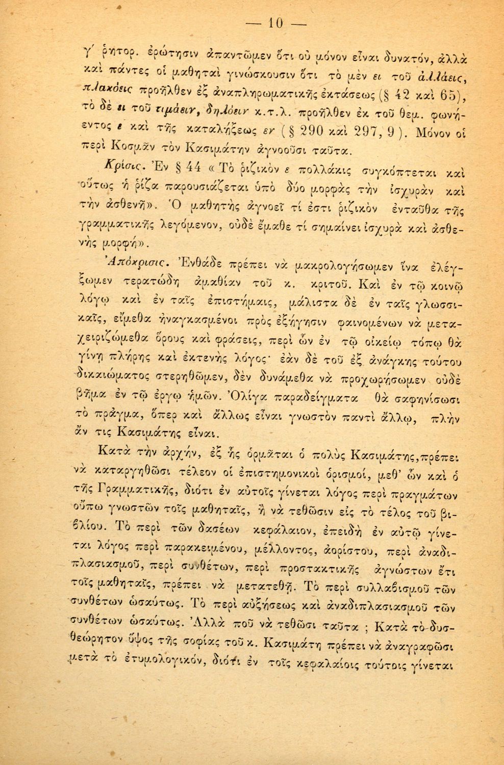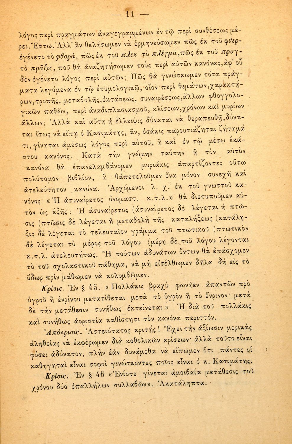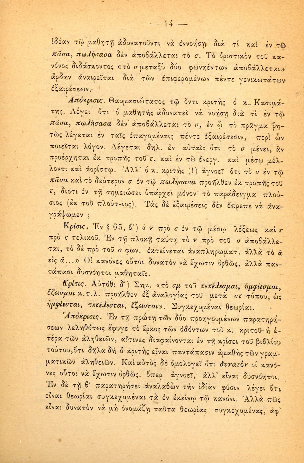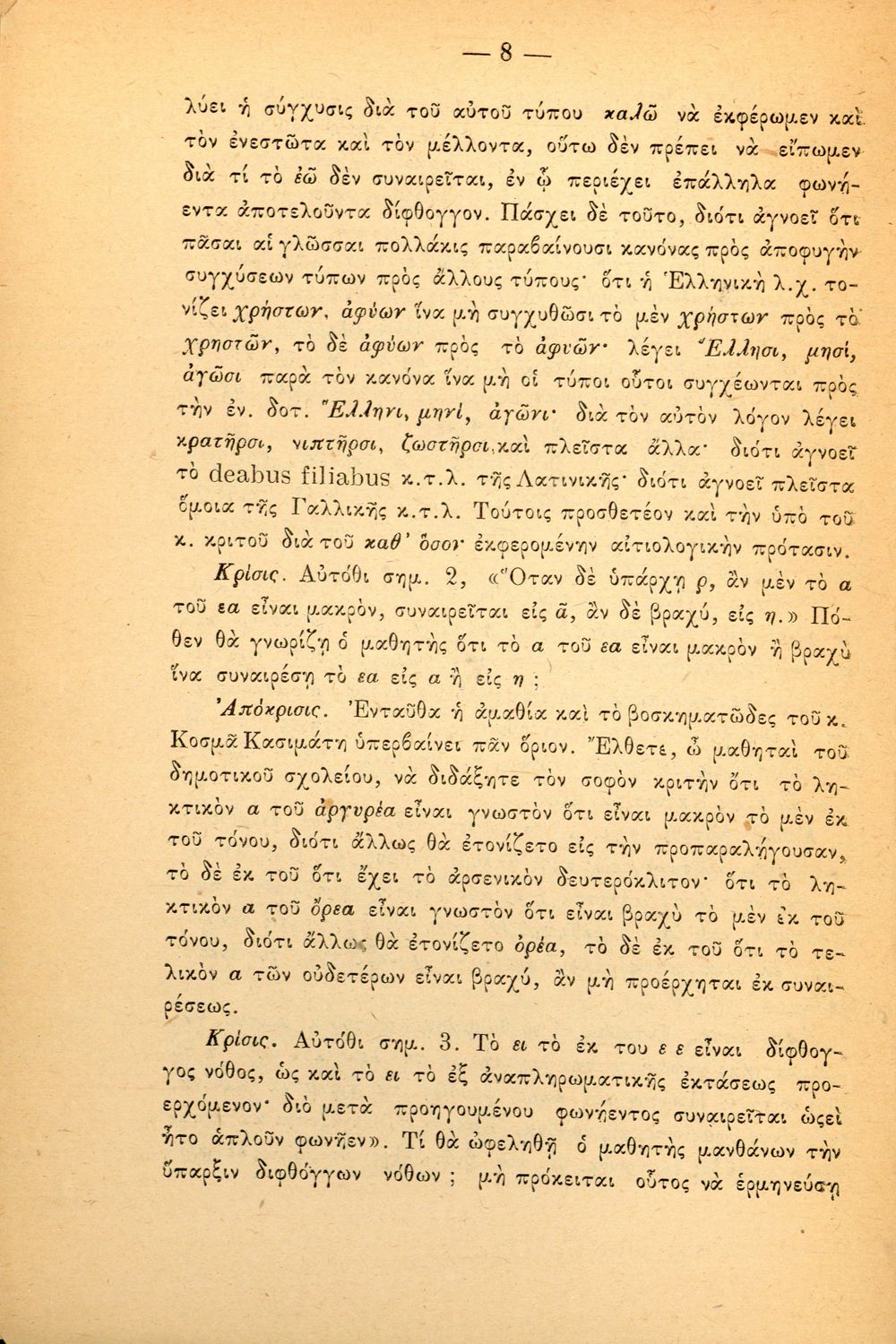Γλώσσα: Καθαρεύουσα Παρουσίαση περιεχομένου: Σύγγραμμα που ασκεί δριμεία κριτική στην επιτροπή για τα διδακτικά βιβλία υπό τον Κοσμά Κασιμάτη για την απόρριψη της γραμματικής που ο συγγραφέας είχε υποβάλει προς κρίση. Ο συγγραφέας δεν παραλείπει να σχολιάσει και την Ελληνική Γραμματική της Αττικής Διαλέκτου του Δημήτρη Μοσχίδη που είχε λάβει τη σχετική έγκριση στο διαγωνισμό του 1901. |