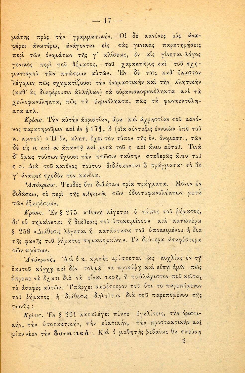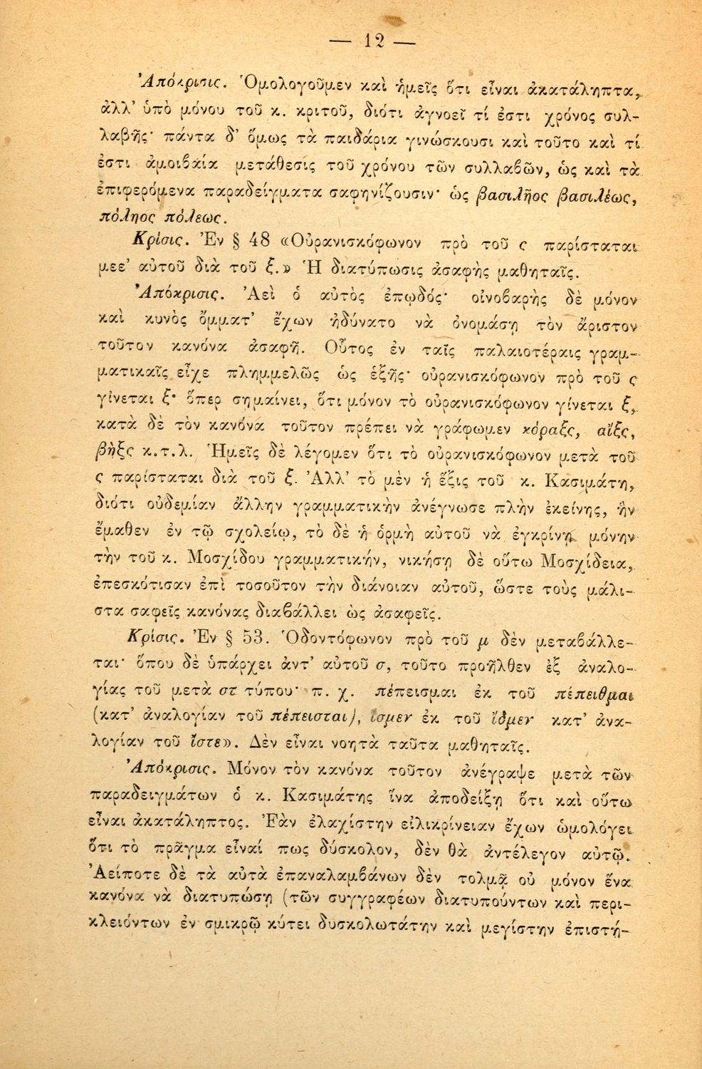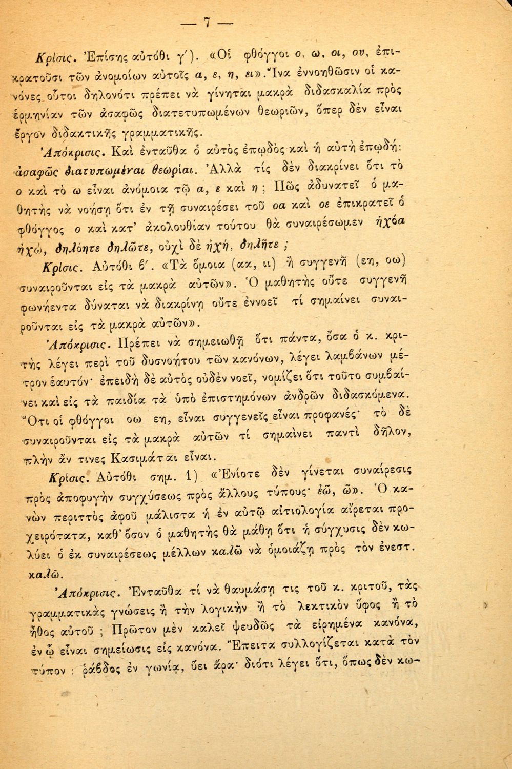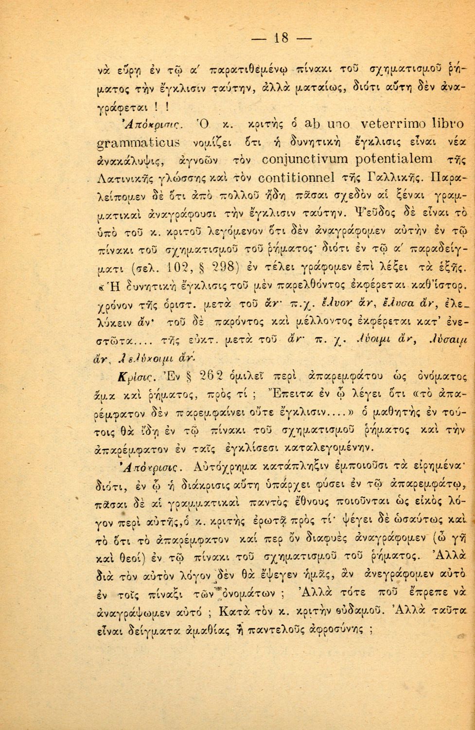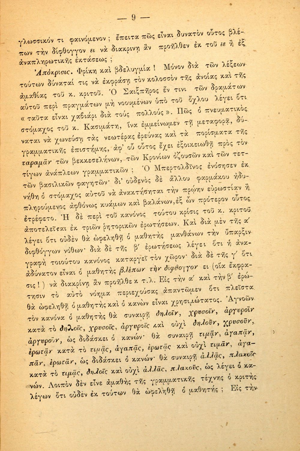 Γλώσσα: Καθαρεύουσα Παρουσίαση περιεχομένου: Σύγγραμμα που ασκεί δριμεία κριτική στην επιτροπή για τα διδακτικά βιβλία υπό τον Κοσμά Κασιμάτη για την απόρριψη της γραμματικής που ο συγγραφέας είχε υποβάλει προς κρίση. Ο συγγραφέας δεν παραλείπει να σχολιάσει και την Ελληνική Γραμματική της Αττικής Διαλέκτου του Δημήτρη Μοσχίδη που είχε λάβει τη σχετική έγκριση στο διαγωνισμό του 1901. |