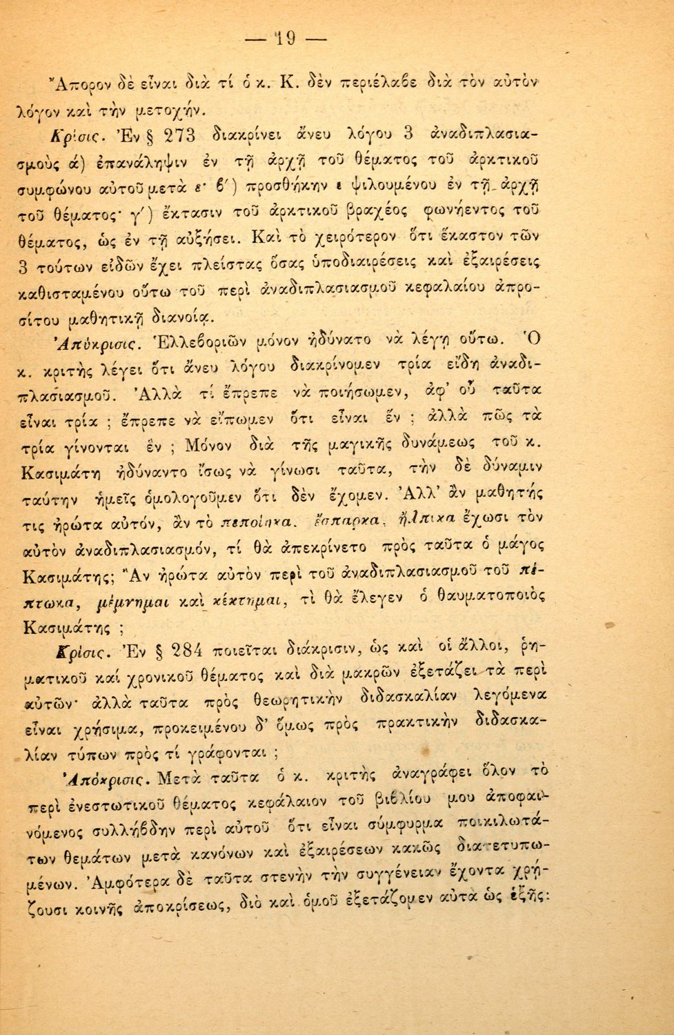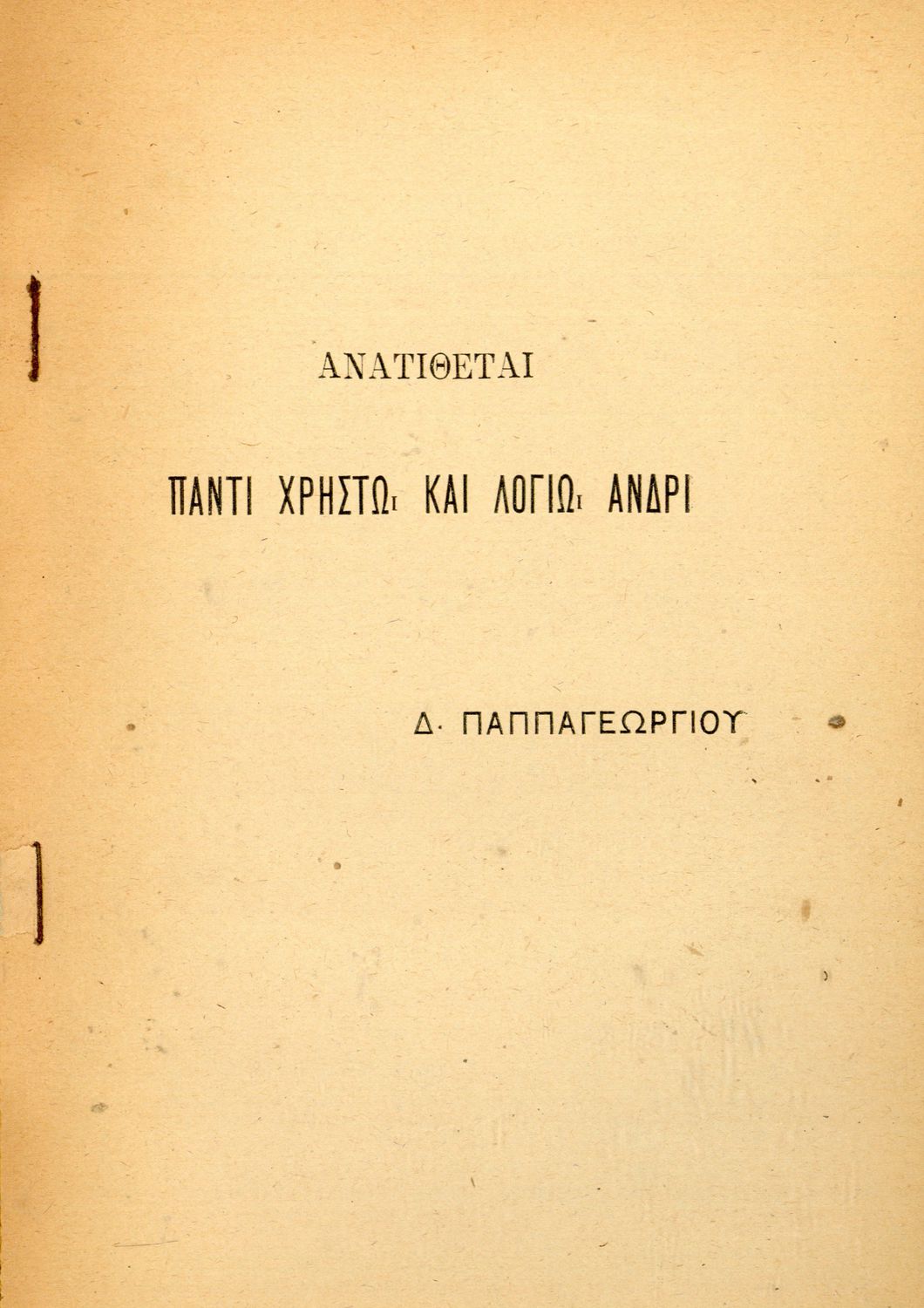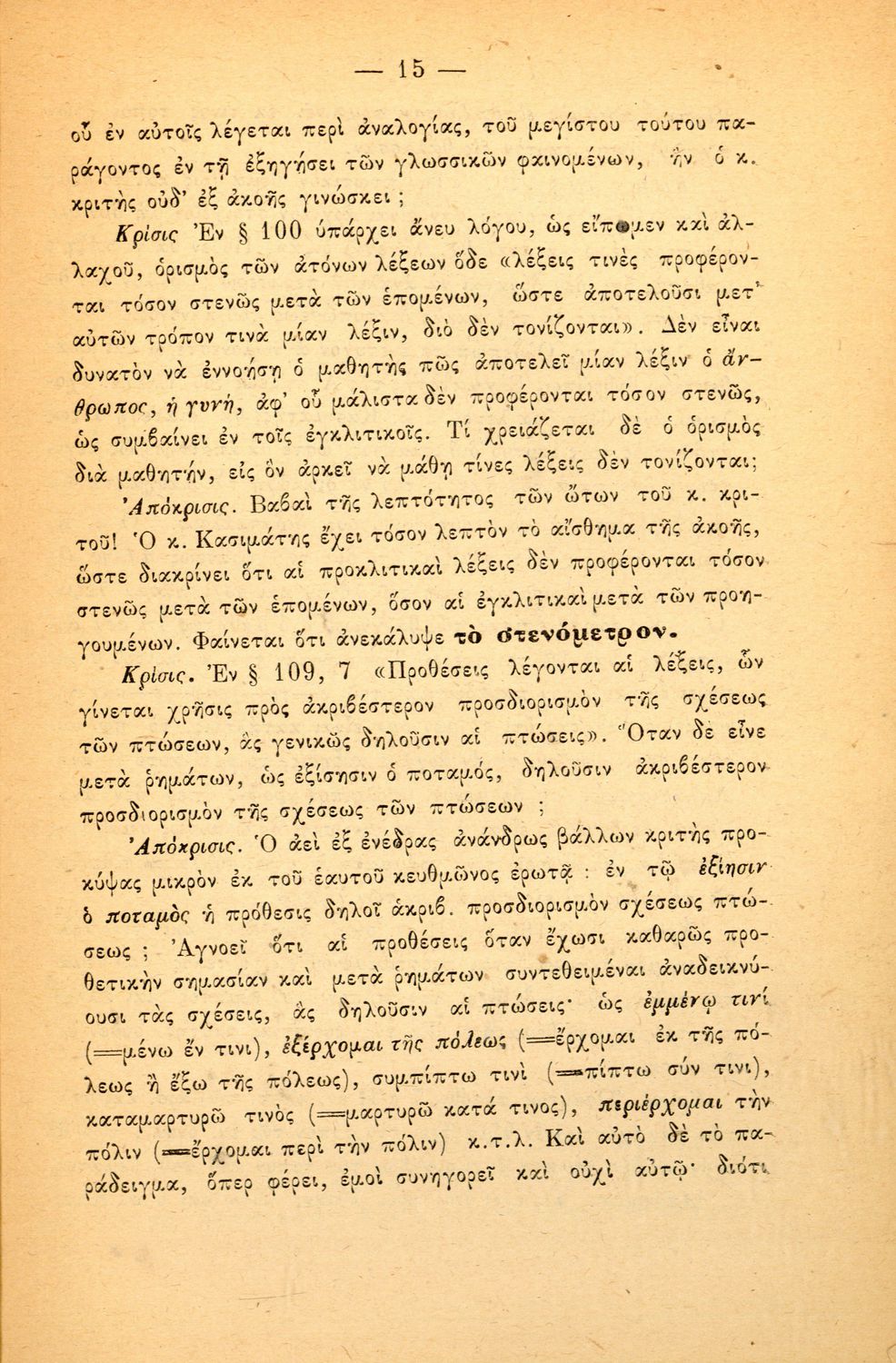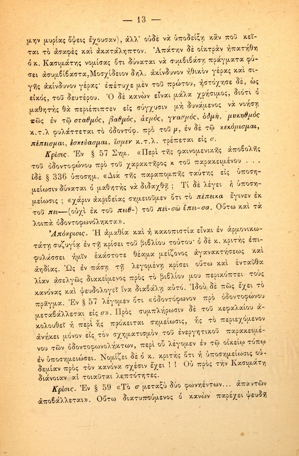 Γλώσσα: Καθαρεύουσα Παρουσίαση περιεχομένου: Σύγγραμμα που ασκεί δριμεία κριτική στην επιτροπή για τα διδακτικά βιβλία υπό τον Κοσμά Κασιμάτη για την απόρριψη της γραμματικής που ο συγγραφέας είχε υποβάλει προς κρίση. Ο συγγραφέας δεν παραλείπει να σχολιάσει και την Ελληνική Γραμματική της Αττικής Διαλέκτου του Δημήτρη Μοσχίδη που είχε λάβει τη σχετική έγκριση στο διαγωνισμό του 1901. |