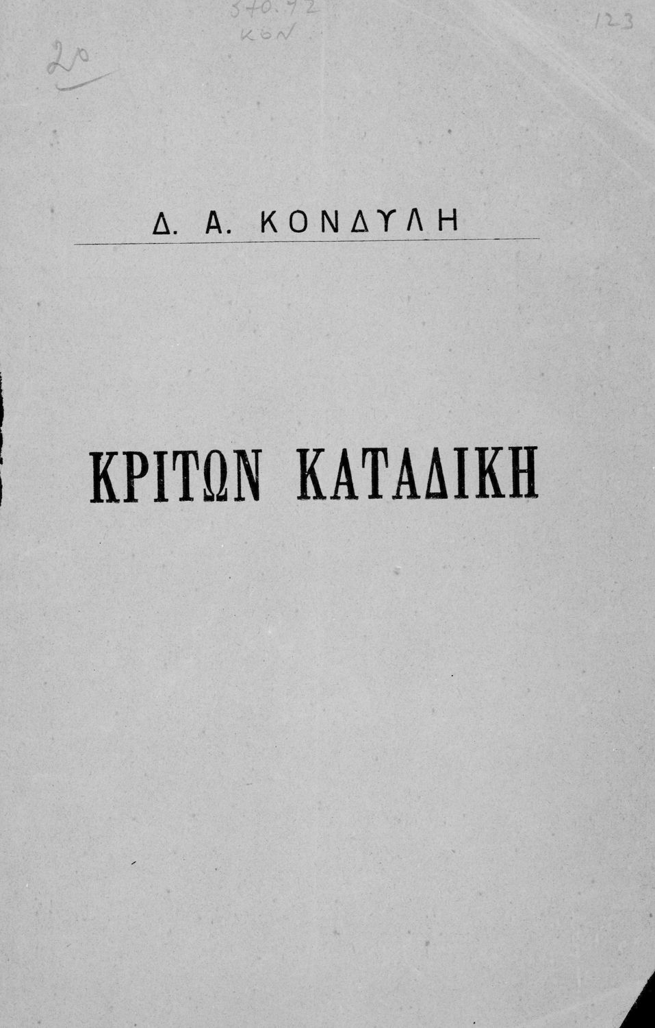 Κωδικός αναγνώρισης: 20-00123 Τίτλος: Κριτών καταδίκη Συγγραφέας: Δ. Α. Κονδύλης Μέγεθος και υπόστρωμα: Άλλο, 20εκ., μαλακό εξώφυλλο, 26 σελίδες. |