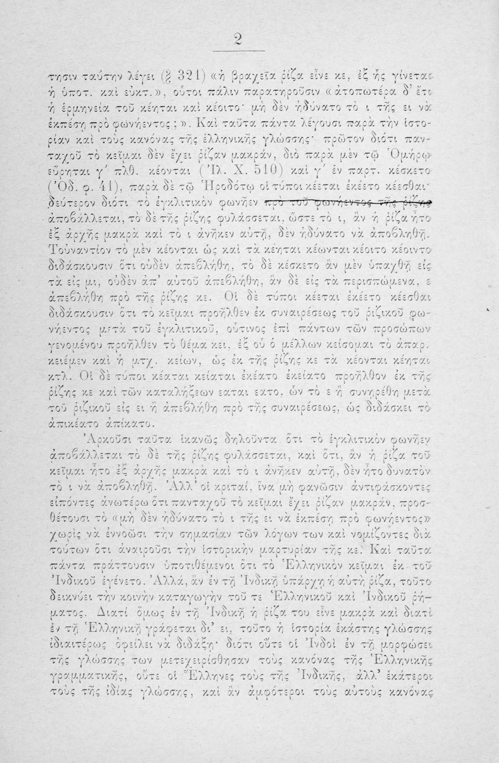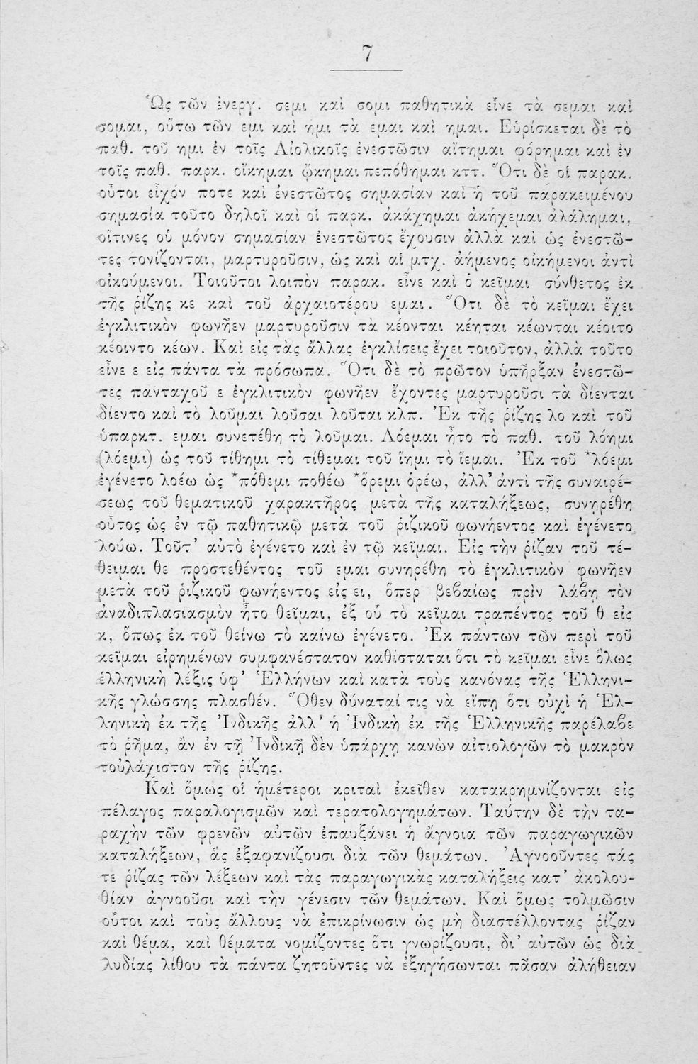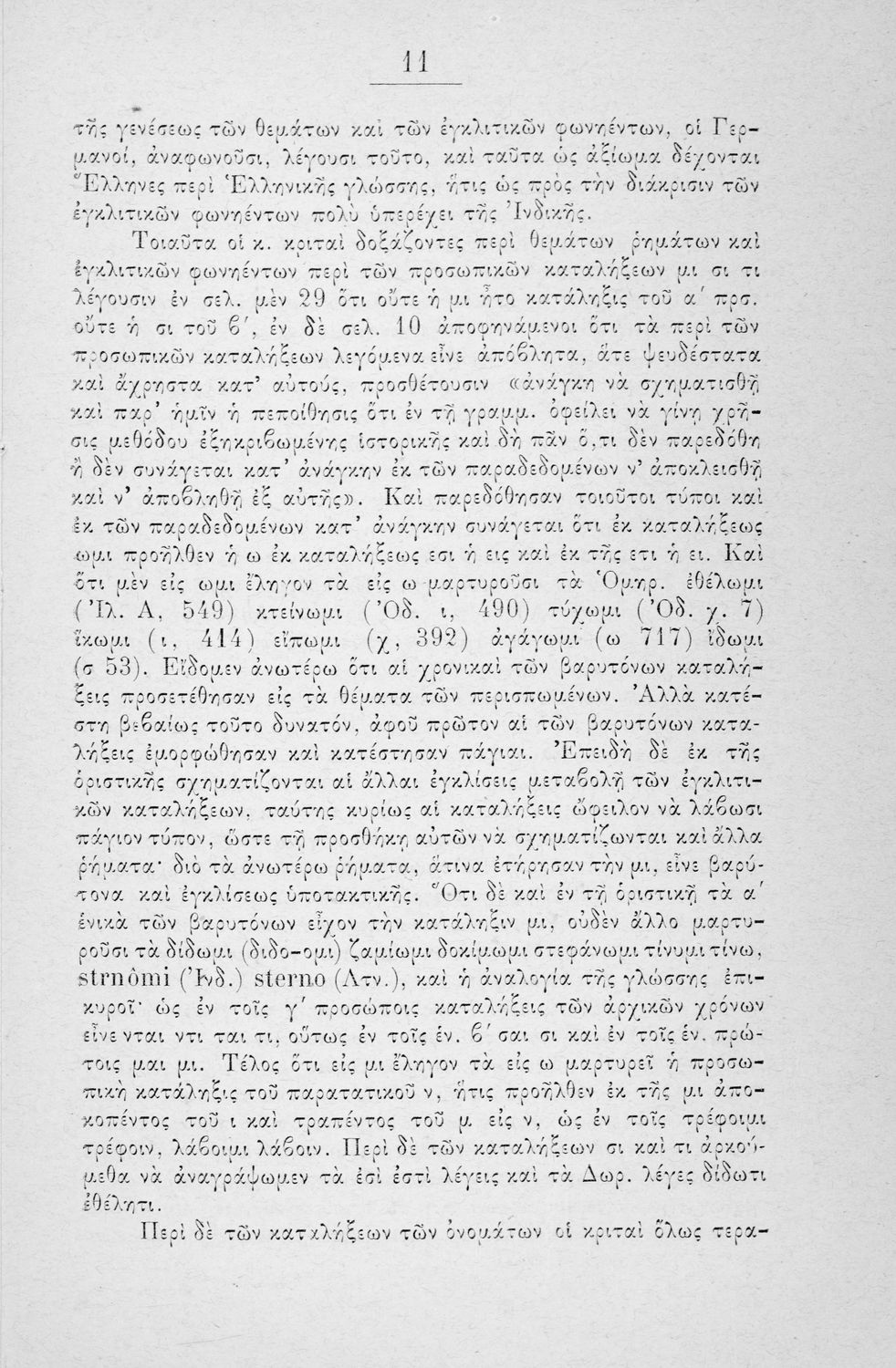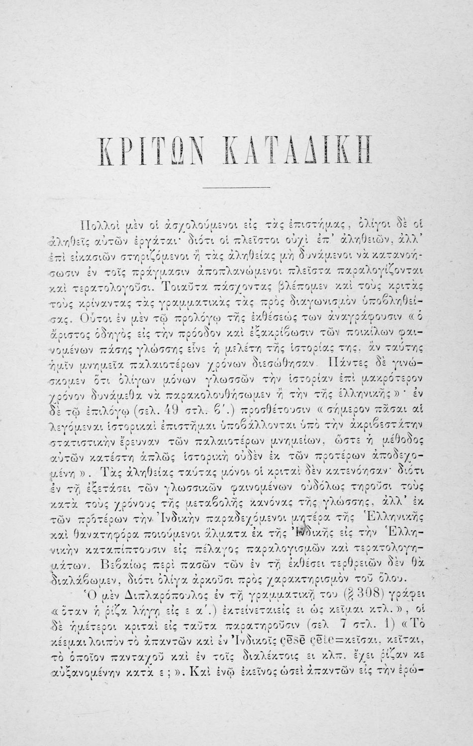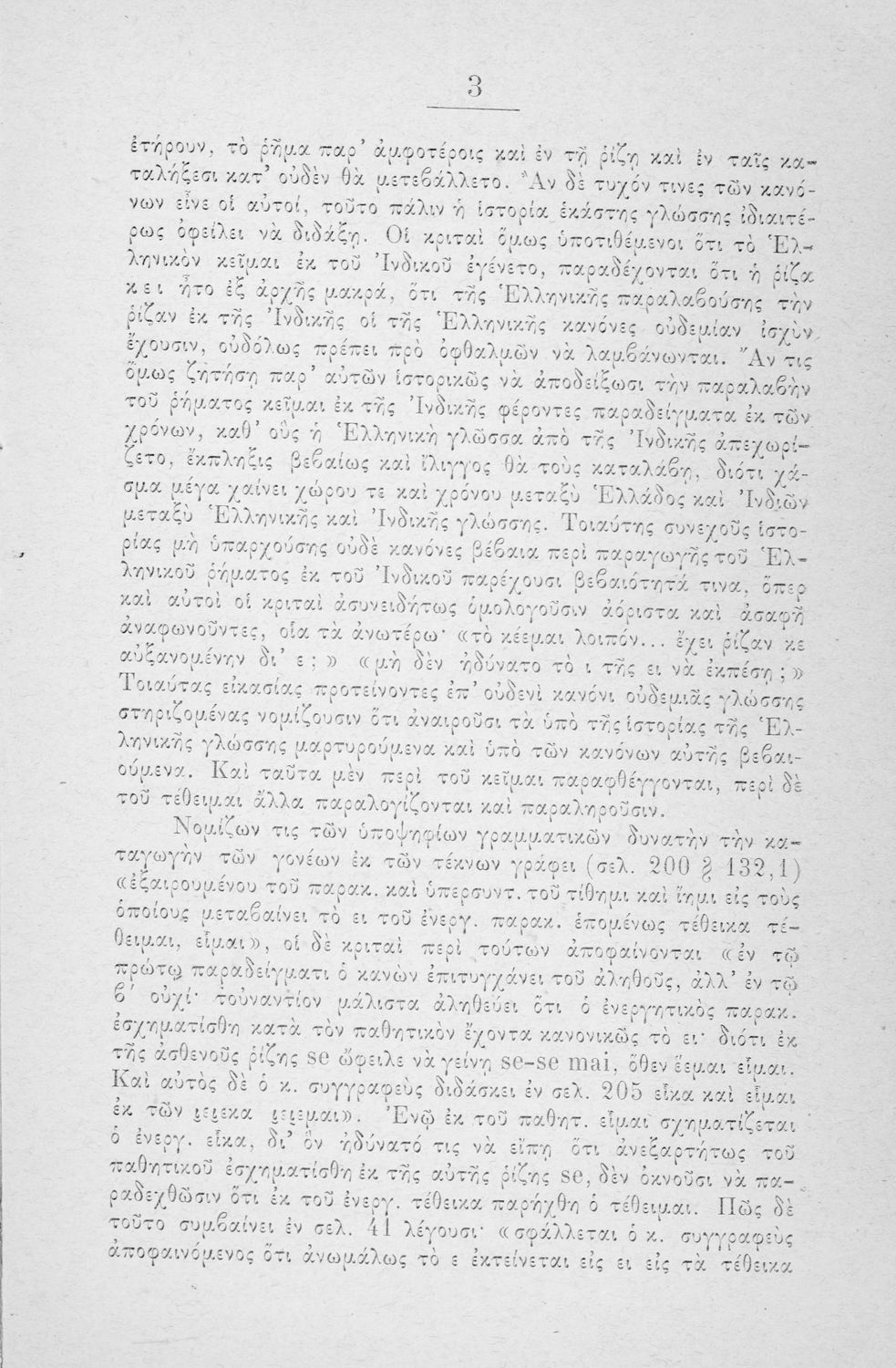 Γλώσσα: Καθαρεύουσα Παρουσίαση περιεχομένου: Επιστημονική μελέτη που κατηγορεί τα μέλη της επιτροπής για την έγκριση των διδακτικών βιβλίων γραμματικής ότι, αποδεχόμενοι την ινδική γλώσσα ως μητέρα της ελληνικής, αμφισβητούν τη δισχιλιετή αυθυπαρξία της. |