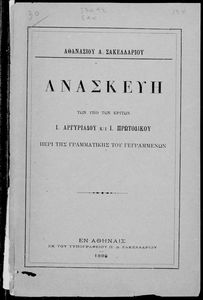 Γλώσσα: Καθαρεύουσα Παρουσίαση περιεχομένου: Σύγγραμμα που περιέχει την επίθεση του συγγραφέα στους Ι. Αργυριάδη και Ι. Πρωτοδίκου οι οποίοι, ως μέλη της επιτροπή κριτών, είχαν απορρίψει τη γραμματική που είχε υποβάλλει προς κρίση. |
