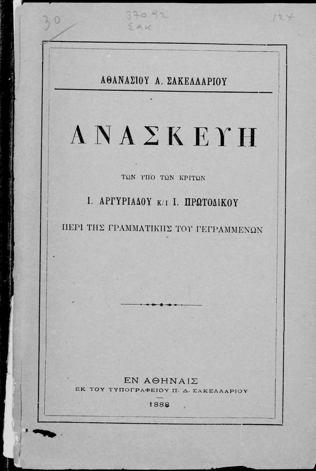 Εκδότης: Τυπογραφείο: Π. Δ. Σακελλαρίου Έτος έκδοσης: 1888 Τόπος έκδοσης: Αθήνα |
