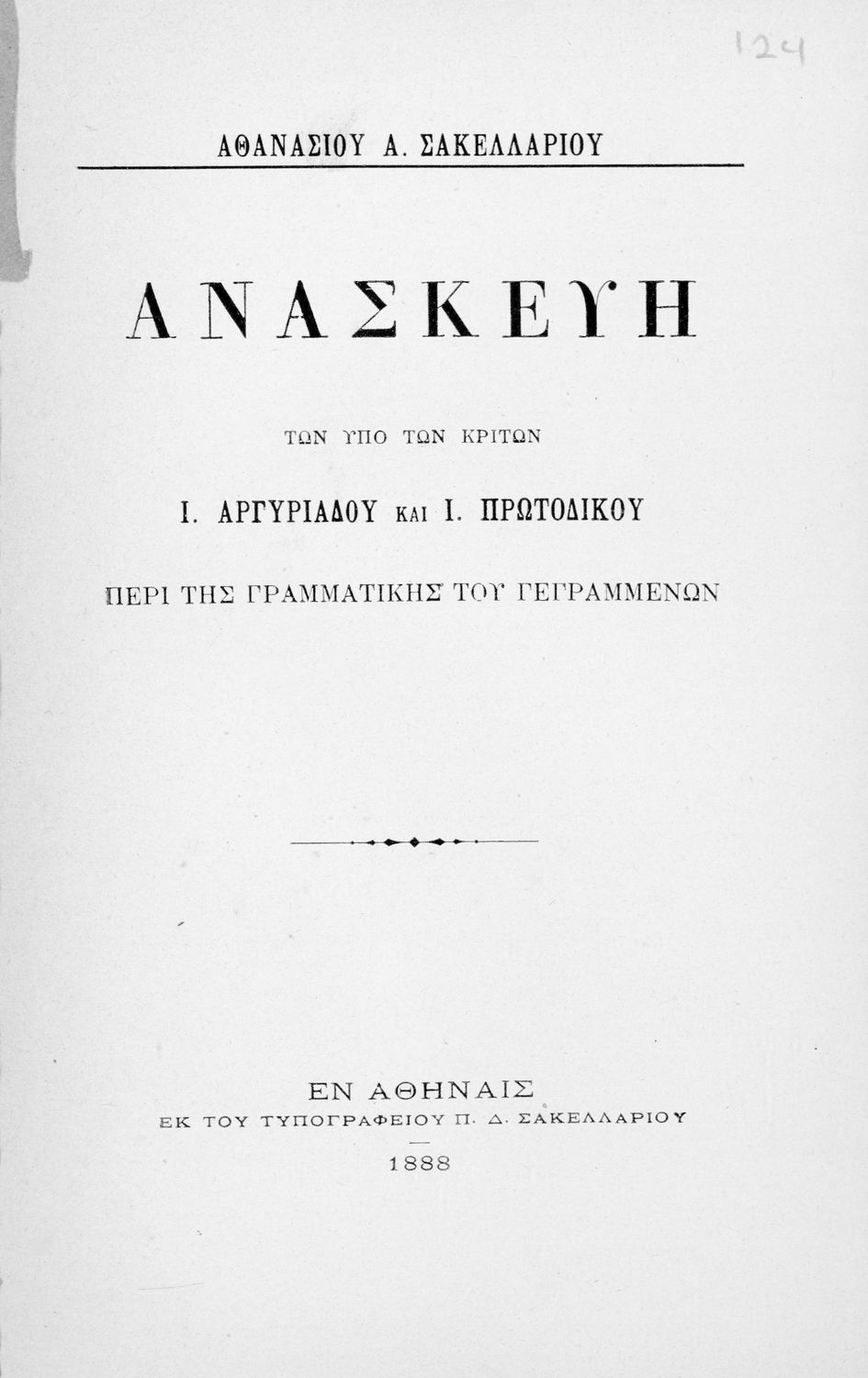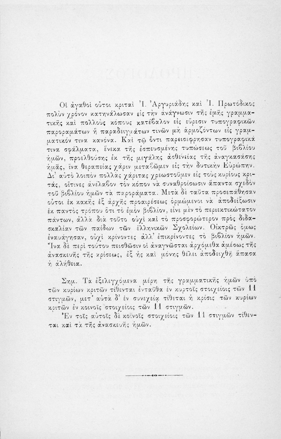 Σύγγραμμα που περιέχει την επίθεση του συγγραφέα στους Ι. Αργυριάδη και Ι. Πρωτοδίκου οι οποίοι, ως μέλη της επιτροπή κριτών, είχαν απορρίψει τη γραμματική που είχε υποβάλλει προς κρίση.