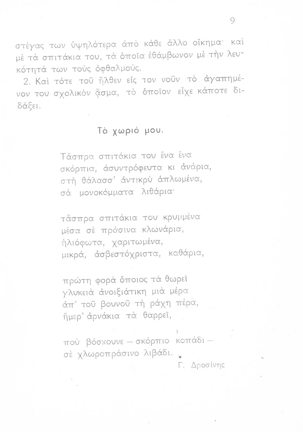 Σχολικό εγχειρίδιο γλώσσας Ε΄ Δημοτικού που περιλαμβάνει ποιήματα και πεζά εμπνευσμένα από τη ζωή στο χωριό και την ελληνική ύπαιθρο, την πατρίδα, την καθημερινότητα και τη θρησκεία.