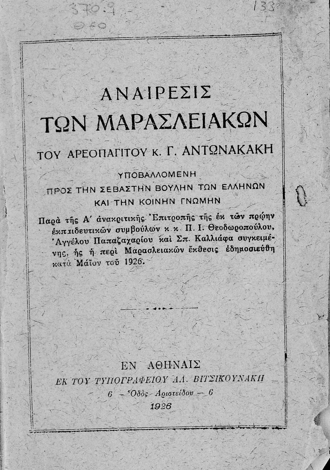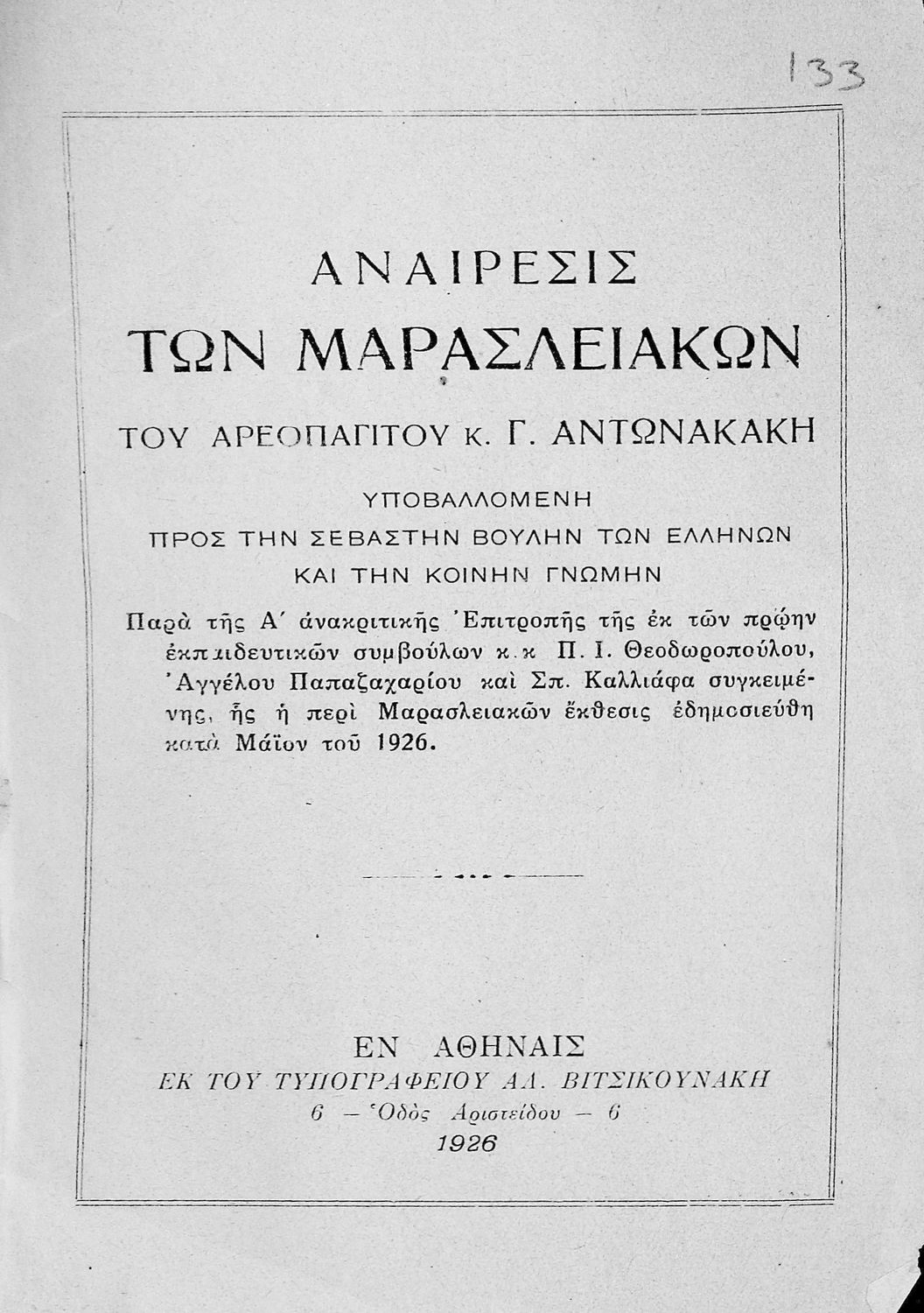 Παρουσίαση περιεχομένου: Εισηγητική έκθεση του Αρεοπαγίτη Γ. Αντωνακάκη προς την Βουλή των Ελλήνων για την υπόθεση των Μαρασλειακών.